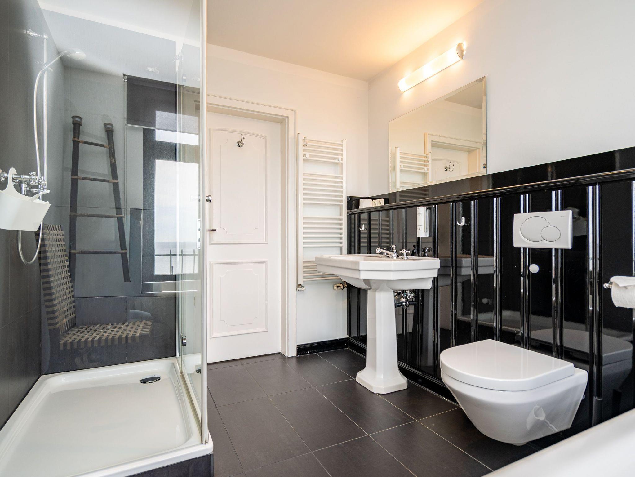 Black [&] White. Urbanes, frisches Leben, mitten in Heringsdorf. Für alle, die Außergewöhnliches lieben! Schwarzes Eichenparkett, stilvolle, moderne Möbel, ausgesuchte Designerstücke und dazu ein grandioser Meerblick. Die üppige 104 qm Maisonnette-Ferienwohnung hat noch mehr zu bieten. Ein großzügiger Wohnbereich mit Kamin und einer offenen, komplett ausgestatteten Küche empfängt Sie im unteren Bereich der Wohnung. Hier befindet sich auch das stilvolle Bad mit Badewanne und Dusche. Natürlich auch mit Meerblick. Zwei Balkone bieten Freiraum zum Sonne tanken. Unter dem Dach, in der zweiten Etage gibt es zwei Schlafzimmer. Das Kleinere gemütlich unter der Dachschräge mit einem Doppelbett (1,40m) und einer Schlafmatratze für ein Kleinkind. Das größere Schlafzimmer mit etwas mehr Platz, eigenem WC und frei stehendem Waschtisch, Schlafecke für ein Kind und einer Sauna mit Meerblick. Ein perfektes Hideway für 4 Erwachsene und ein Kleinkind (bis 3 Jahre). Ein PKW-Stellplatz steht auf dem abgeschlossenen Grundstück zur Verfügung.
