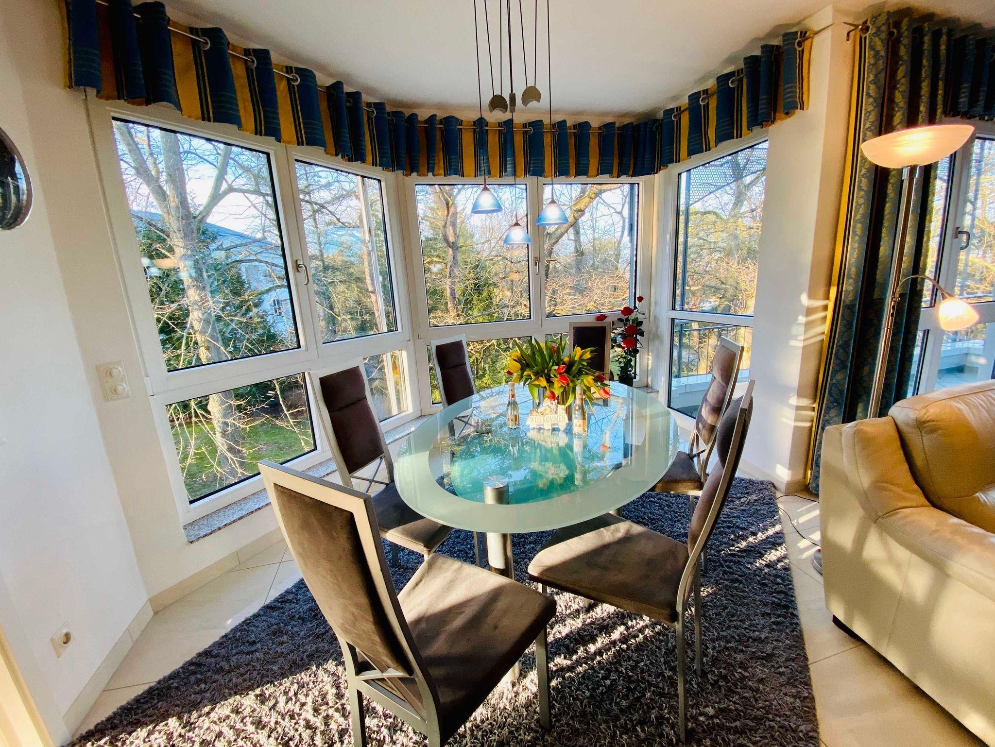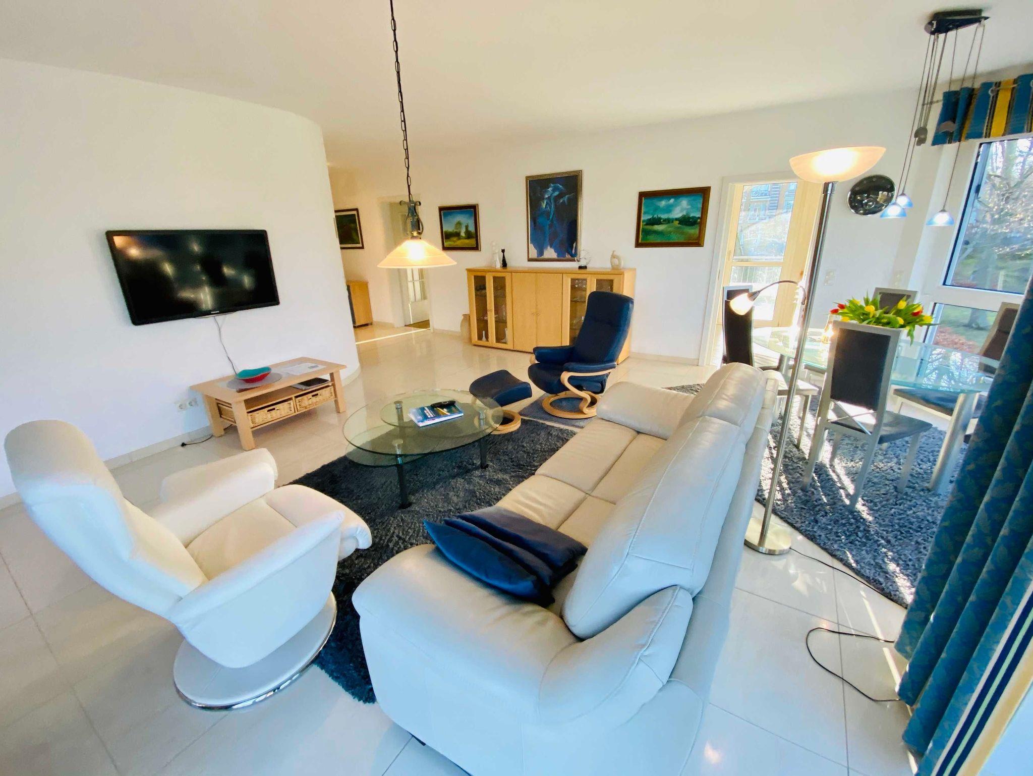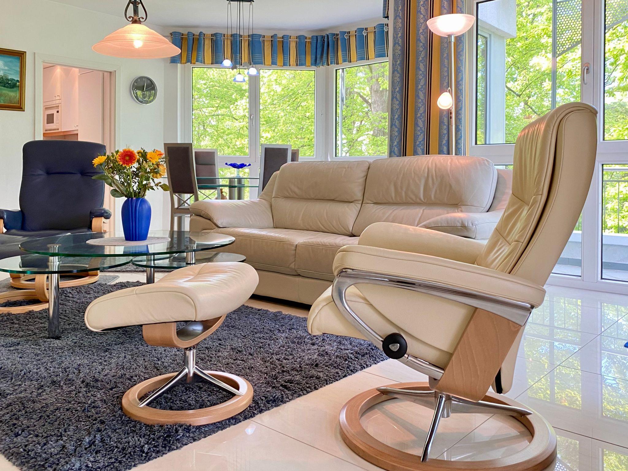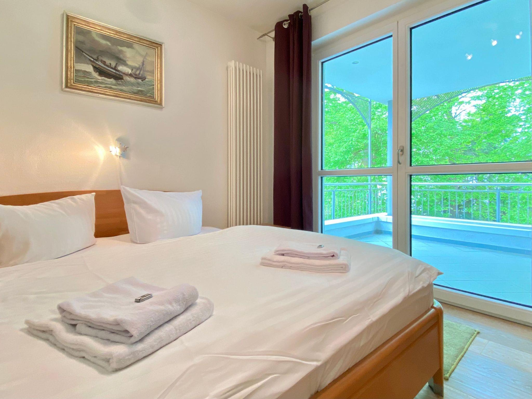 Moderne Ferienwohnung in der Villa Seepark mit direktem Strandzugang und zwei Balkonen.