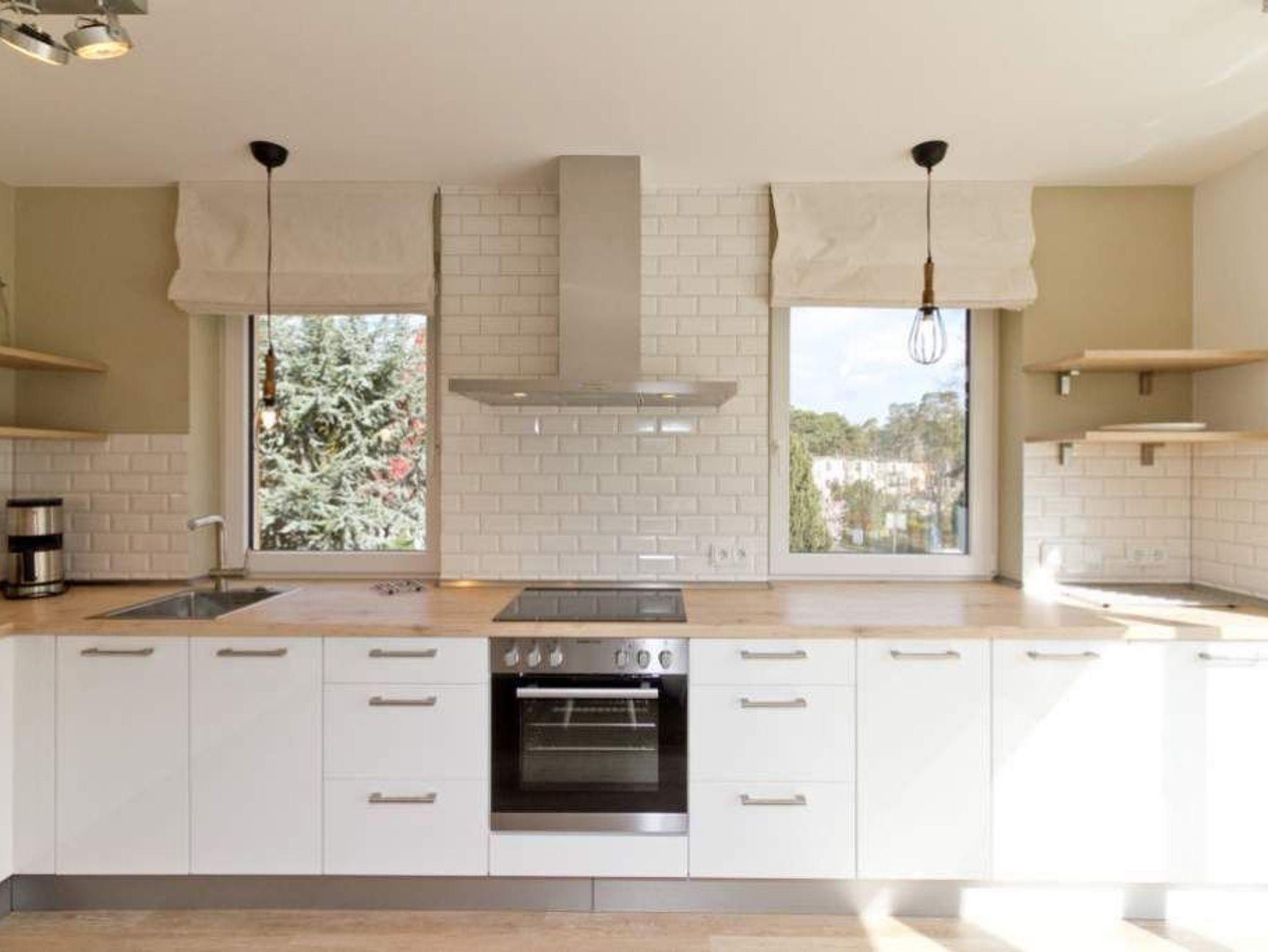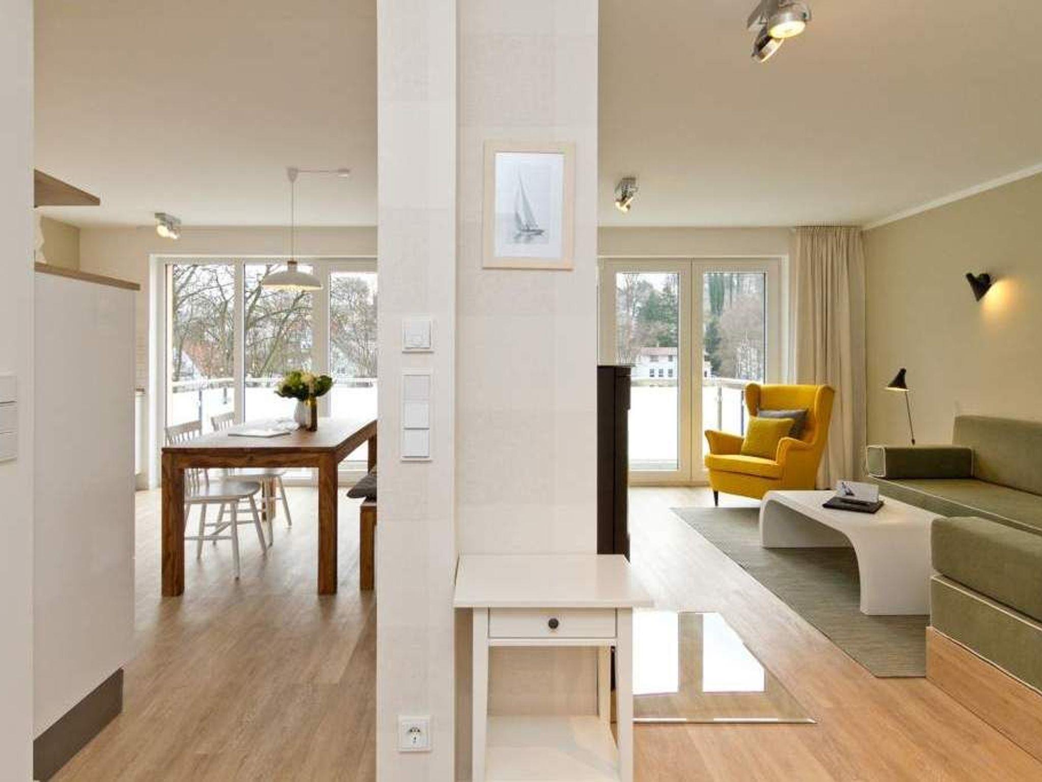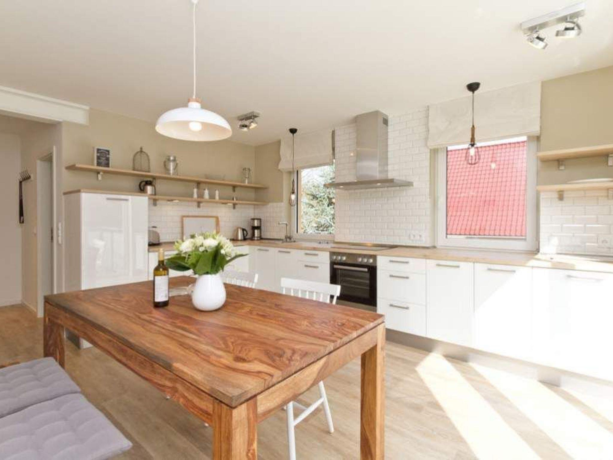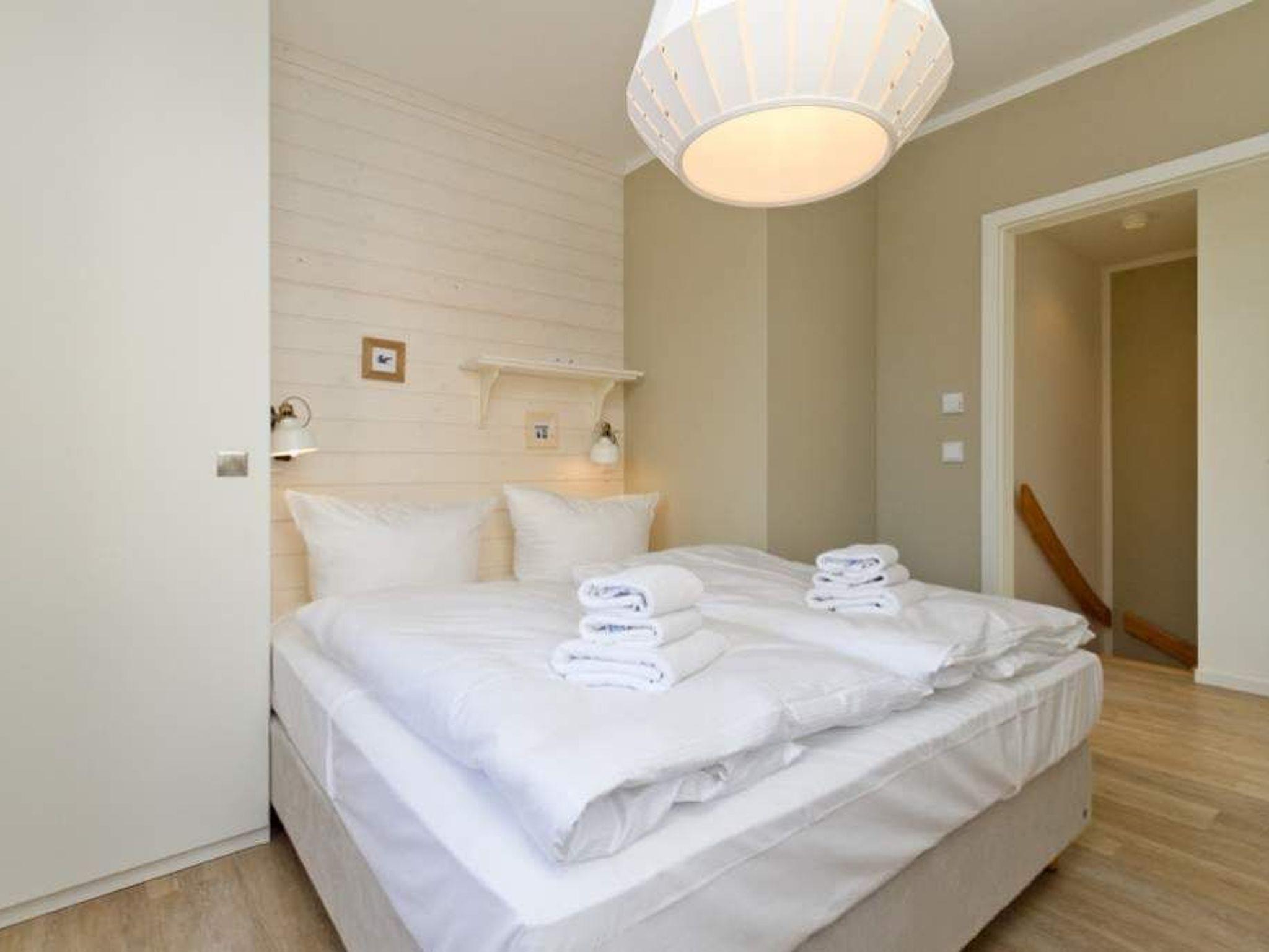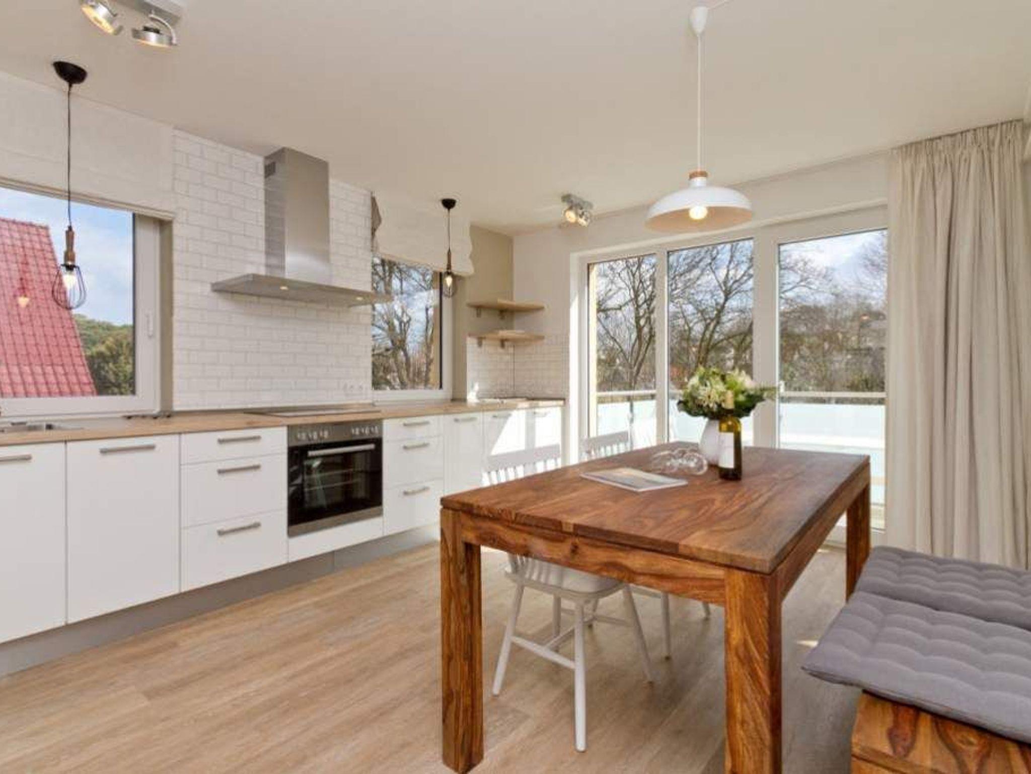 Wer luftige Leichtigkeit, viel Platz und eine stylische, minimalistische Einrichtung in einem harmonischen Farbkonzept liebt, wird sich in den beiden Etagen der Wohnung 6 absolut wohlfühlen. Wann haben Sie das letzte Mal gekocht, wie ein Sternekoch? Das tun Sie jeden Tag? Dann freuen Sie sich auf die großzügige und wunderschön gestaltete und komplett ausgestattete Küche. Metrofliesen und moderne Geräte verleihen der Küchenzeile ein schickes und funktionelles Design. Die große Arbeitsfläche aus Holz bietet reichlich Platz zum Austoben an Herd und Co. Ein schöner großer Holztisch lädt hernach zum ausgiebigen Schlemmen und Zusammensitzen ein. Spielt das Wetter mit, spricht nichts gegen ein Frühstück oder Abendessen auf dem Balkon. Da dieser nach Osten ausgerichtet ist, haben Sie hier schon zum Frühstück herrlichsten Sonnenschein und zum Nachmittag wunderbare Kühle an heißen Ostseesommertagen. Gleich nebenan wartet ein helles und großes Wohnzimmer mit Kaminofen und Flat-TV nur darauf, Ihnen schöne Stunden zu bescheren. Eine bequeme Design-Sofalandschaft und ein senfgelber Ohrensessel laden zum Entspannen ein. Auch von hier gibt es einen Zugang zum Balkon. Der knapp 81 Quadratmeter große Ferientraum setzt sich in einer zweiten Etage fort. In den beiden Schlafzimmern im schwedischen Landhausstil mit viel weißem Holz und sanften Naturtönen können bis zu vier Personen nächtigen. Ein Schlafzimmer besitzt ein großes Doppelbett (1,80 m x 2,00 m), einen Flat-TV und einen geräumigen Kleiderschrank. Außerdem gelangen Sie von hier ins schöne Masterbad mit Badewanne mit Regendusche, Waschtisch und WC. Das zweite Schlafzimmer beherbergt ein Boxspringdoppelbett (1,60 m x 2,00 m) und einen Kleiderschrank. Beide Zimmer haben Zugang zum umlaufenden Balkon. Die Wohnung verfügt über ein zweites Bad auf der Wohn- und Küchenetage. Dieses ist mit Dusche, Waschtisch und WC ausgestattet. Für einen rundum sorglosen Urlaub sind bei Anreise die Betten bezogen und Handtücher liegen bereit. Das WLAN kann kostenfrei genutzt werden. Ein Pkw-Stellplatz befindet sich am Haus.