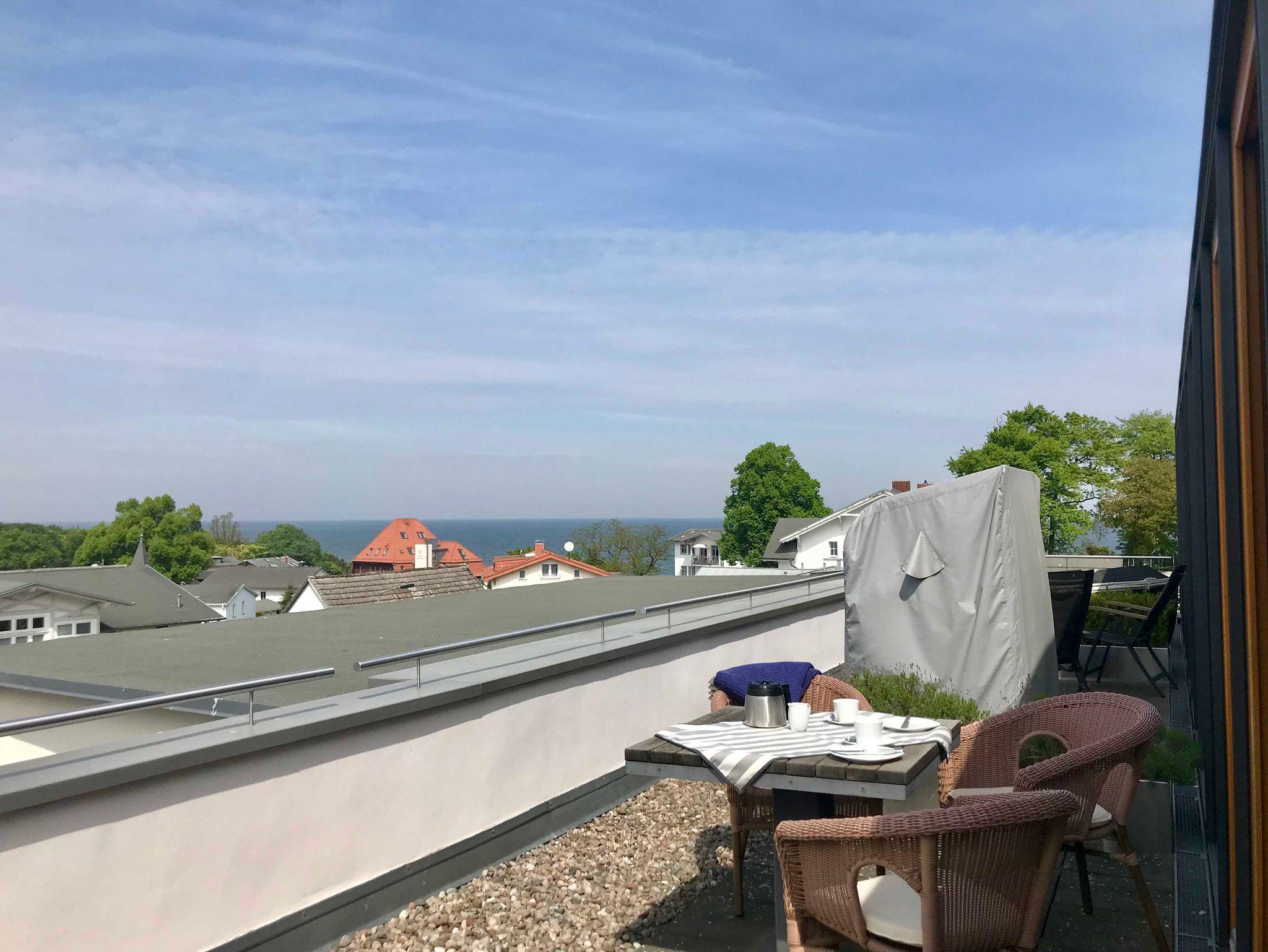 Die über drei Etagen offene, ca. 70 qm große, Maisonette-Wohnung lädt zum lichtdurchfluteten, modernen Wohnen ein. Von der Dachterrasse mit Strandkorb und Gartenmöbeln genießen Sie Meerblick hinweg über die Dächer Heringsdorfs.