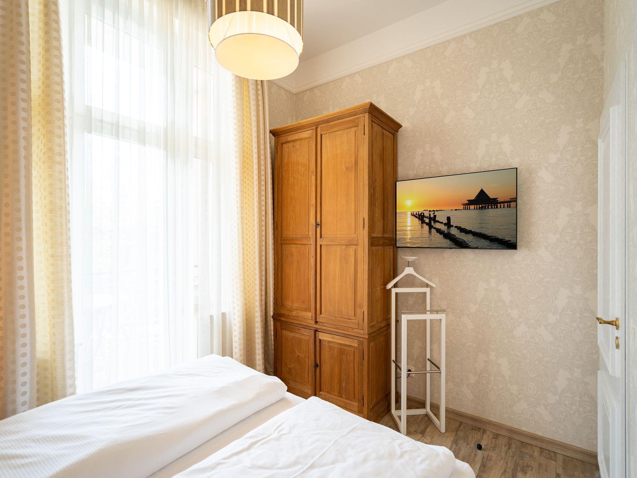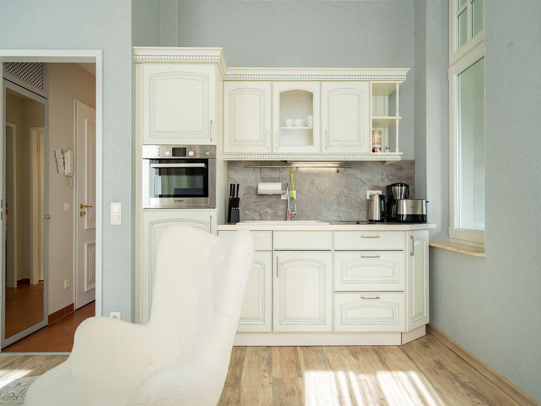 Stil, Charme und Komfort! In dieser wunderschönen 2-Raum-Ferienwohnung (53 m²) im 1. Obergeschoss der Villa Aegir, werden Sie entspannte Urlaubstage verbringen. Der helle Wohnbereich mit Couch, Lesesessel und TV wird durch die Landhausküchenzeile ergänzt. Daran schließt sich der schöne Wintergarten mit Essgruppe an, der sicher schnell zu Ihrem Lieblingsplatz in der Wohnung avanciert. Das gemütliche Schlafzimmer mit Doppelbett (1,60 m) verfügt über einen zweiten TV. Für Ihren Komfort sind die Betten bei der Anreise bezogen und Handtücher liegen bereit (Erstausstattung). Auf Wunsch stellen wir für unsere kleinen Gäste ein Kinderreisebett (ohne zusätzliche Matratze [&] Bettzeug) und einen Kinderhochstuhl ( gegen einen Aufpreis) zur Verfügung. Das Bad ist mit einer Dusche ausgestattet. Der Balkon mit Gartenmöbeln bietet Ausblick auf die schönen Villen in der Nachbarschaft. ( 1 Pkw-Stellplatz am Haus, WLAN-Netz kostenfrei)