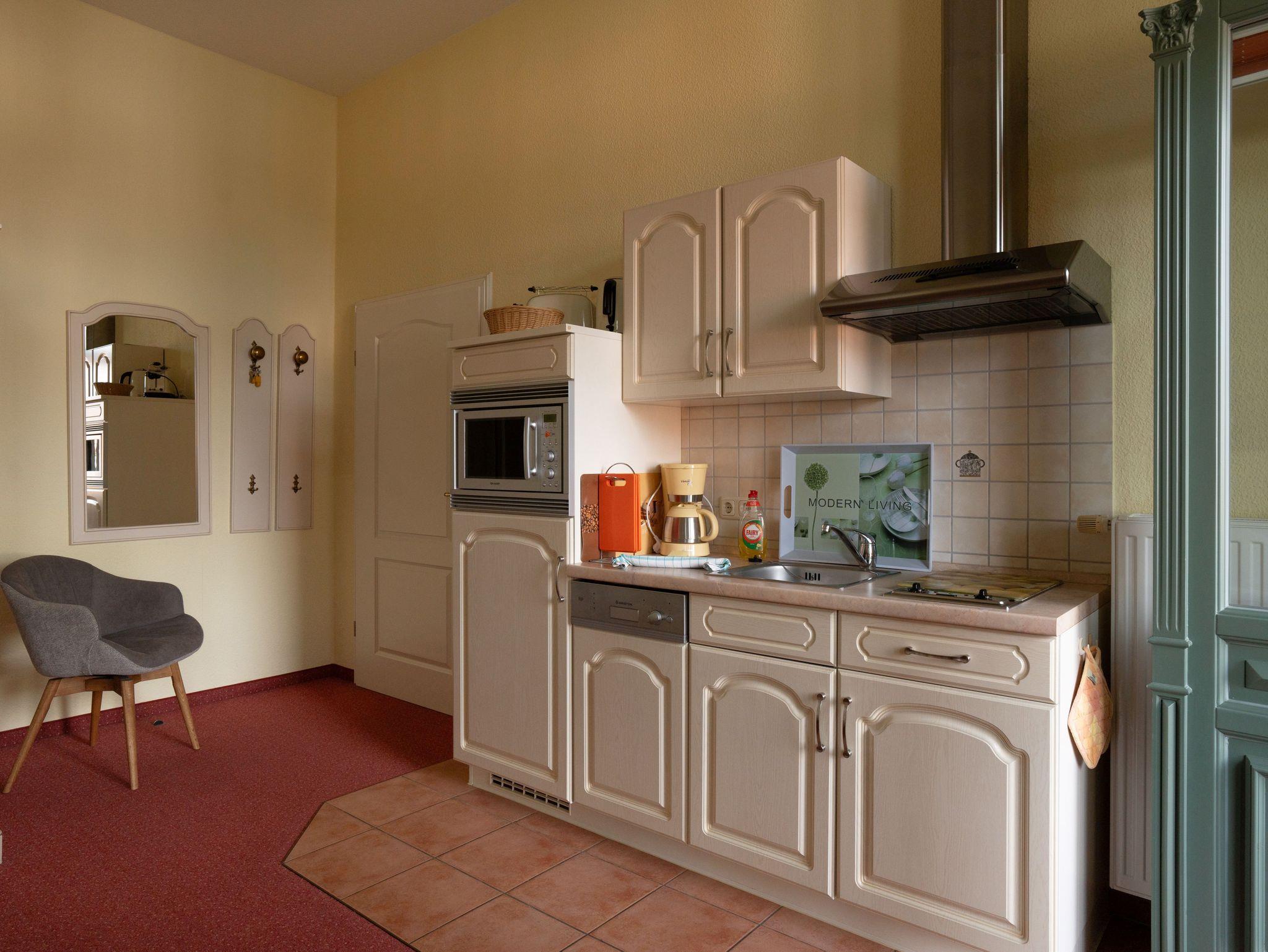 Das 30 qm große Zweiraumappartement im Obergeschoss verfügt über eine Veranda mit Sitzgelegenheit und Schlafcouch (Aufbettung für 1 Person), TV und Radio einen Wohn-Schlafraum mit Doppelbett und Küchenzeile mit Geschirrspüler,