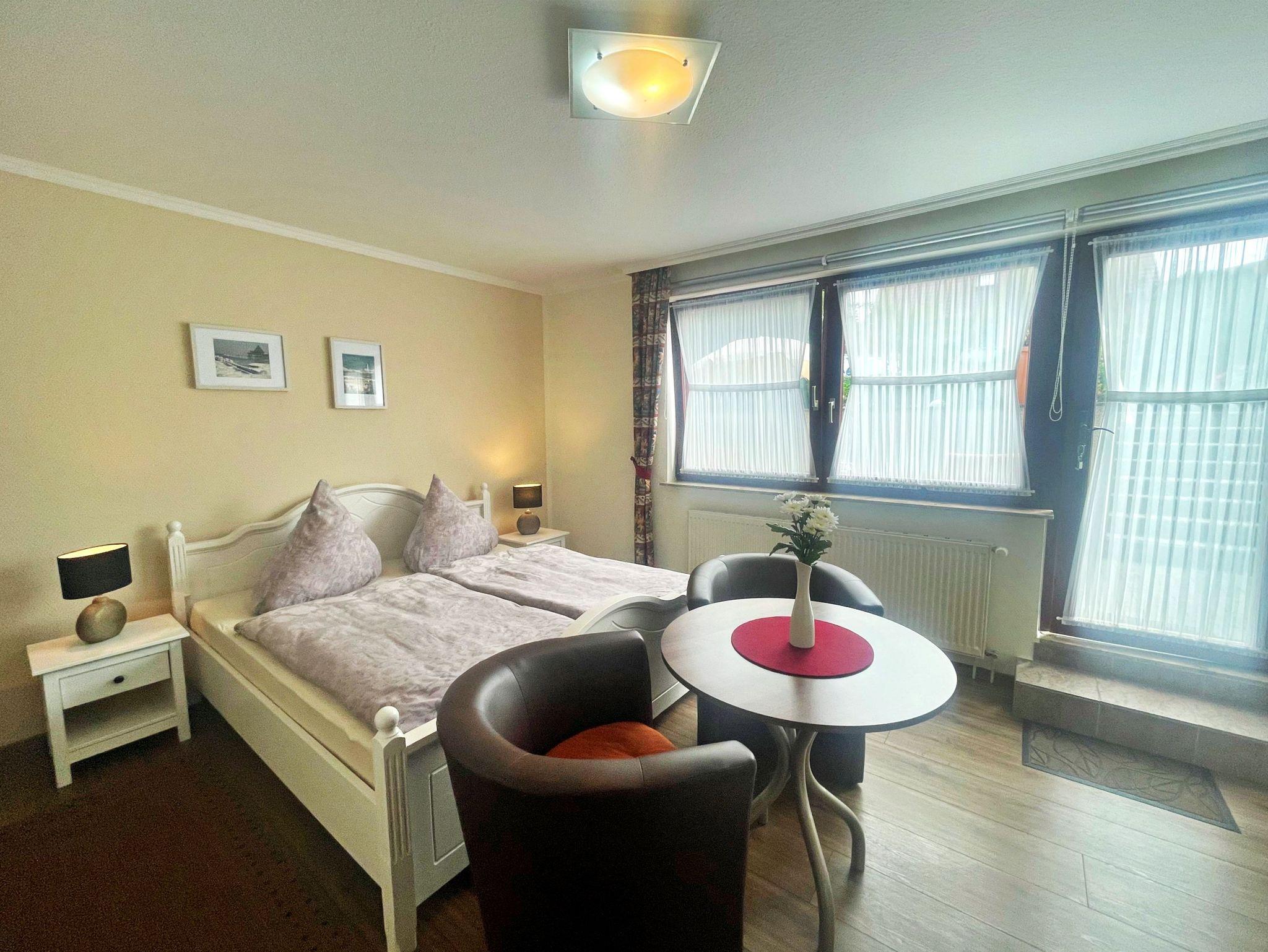 Mit einer Größe von ca. 23 qm bietet das Ferienzimmer Ihnen einen gemütlichen Rückzugsort für bis zu 2 Personen im Souterrain. Die großen Fenster sorgen für ein helles und freundliches Ambiente, in dem Sie sich sofort wohlfühlen werden.Ein bequemes Doppelbett sorgt für erholsamen Schlaf. Zudem stehen Ihnen ein Flachbild-TV sowie zwei bequeme Sessel und ein Tisch zur Verfügung, die perfekt zum Verweilen und Entspannen einladen. Zur Ausstattung gehört auch ein eigenes Bad mit Dusche und WC, das Sie ganz für sich allein nutzen können. Im Flur erwartet Sie ein kleiner Küchenbereich, der mit Ceranherdplatte, Kühlschrank, Kaffeemaschine, Toaster und Mikrowelle ausgestattet ist. Dieser Bereich steht Ihnen und den anderen Gästen des zweiten Ferienzimmers zur gemeinschaftlichen Nutzung zur Verfügung.