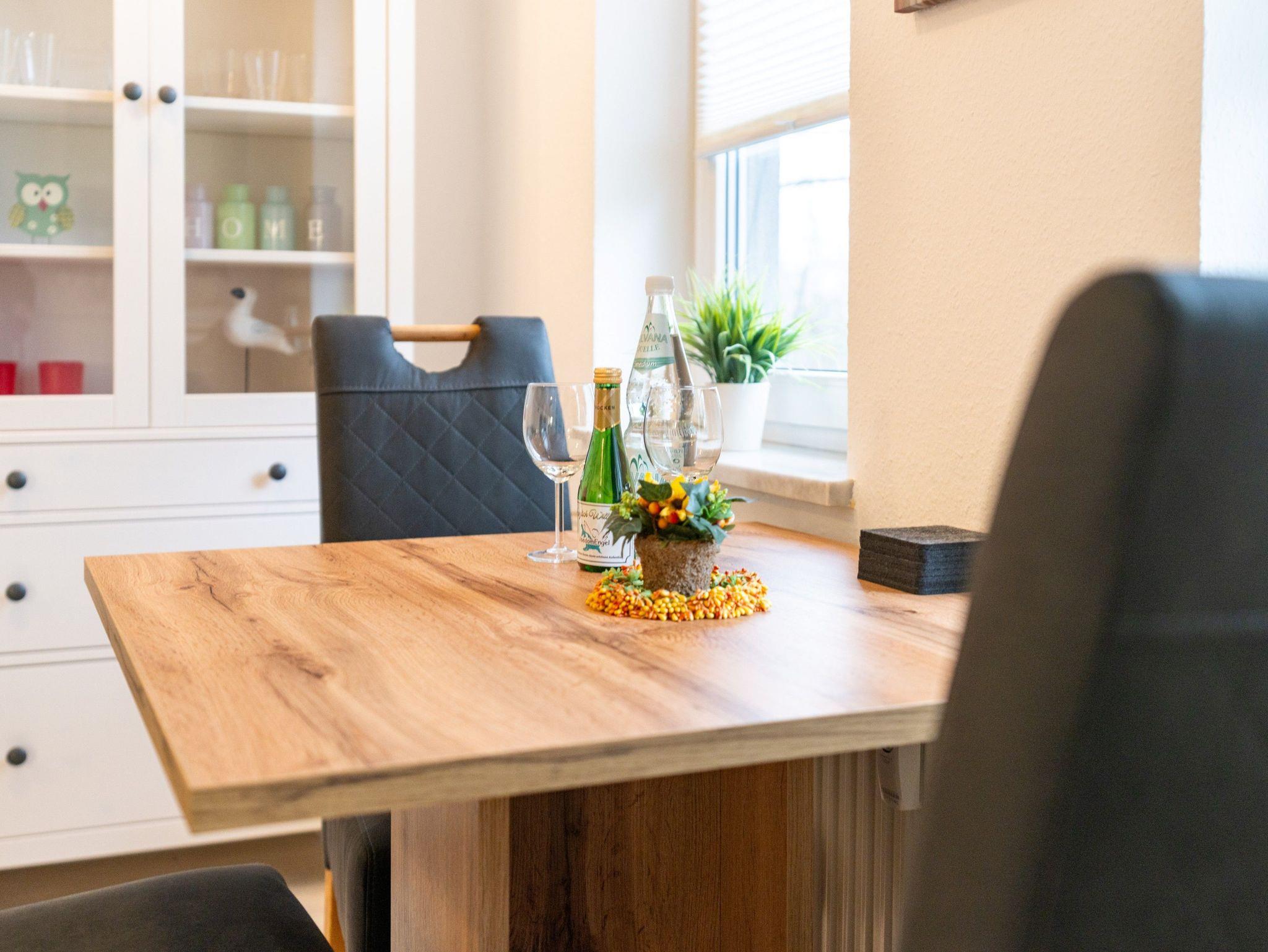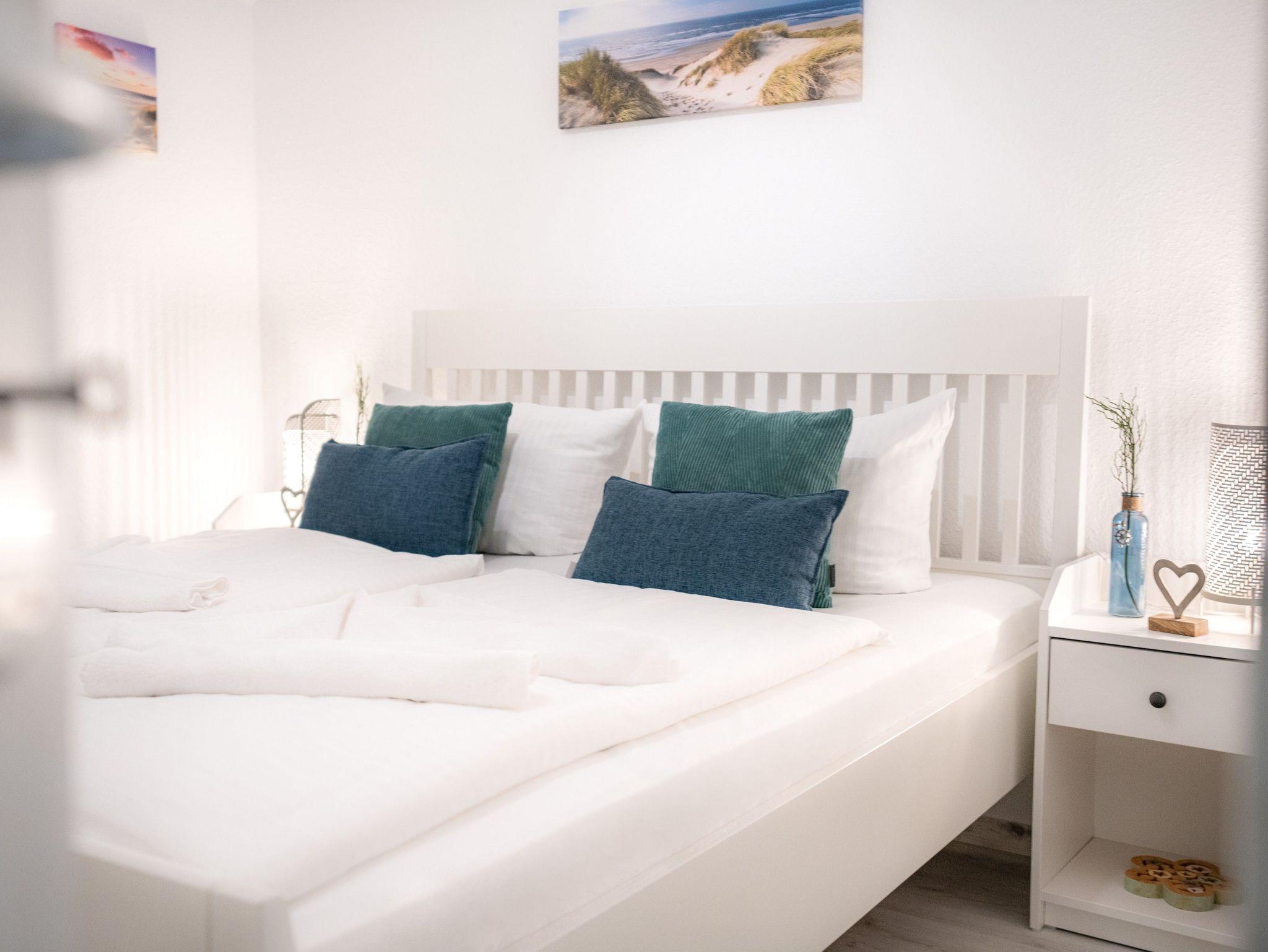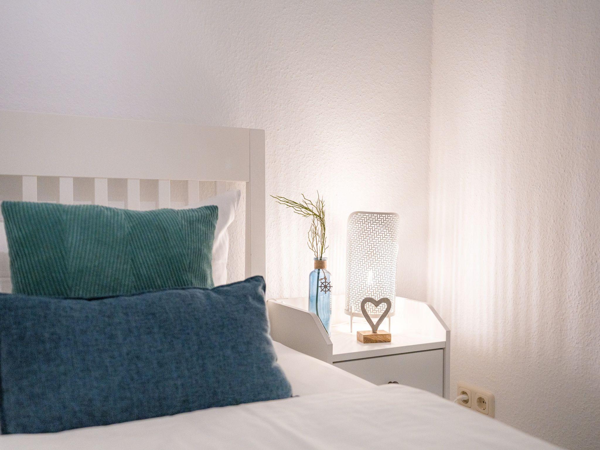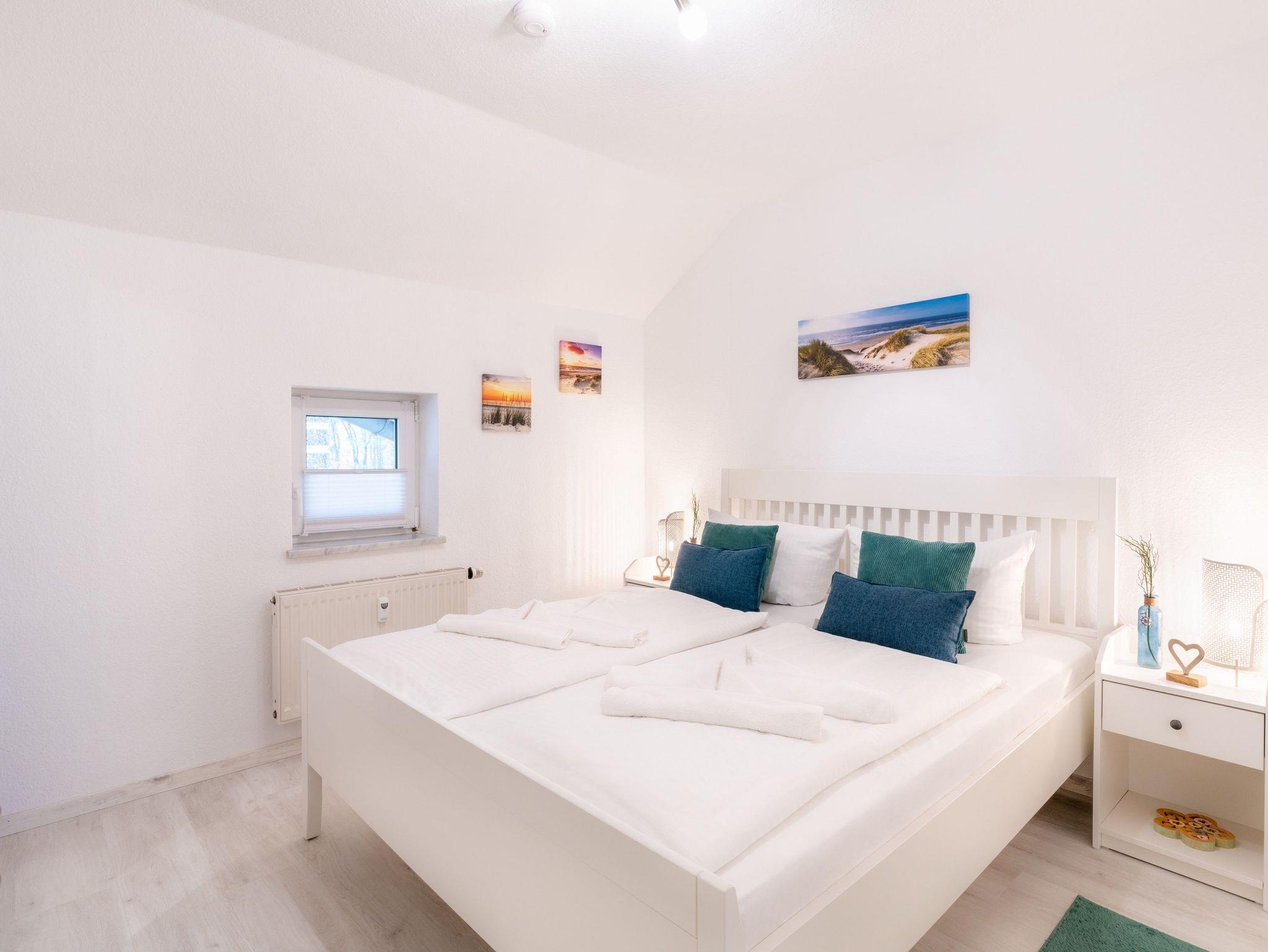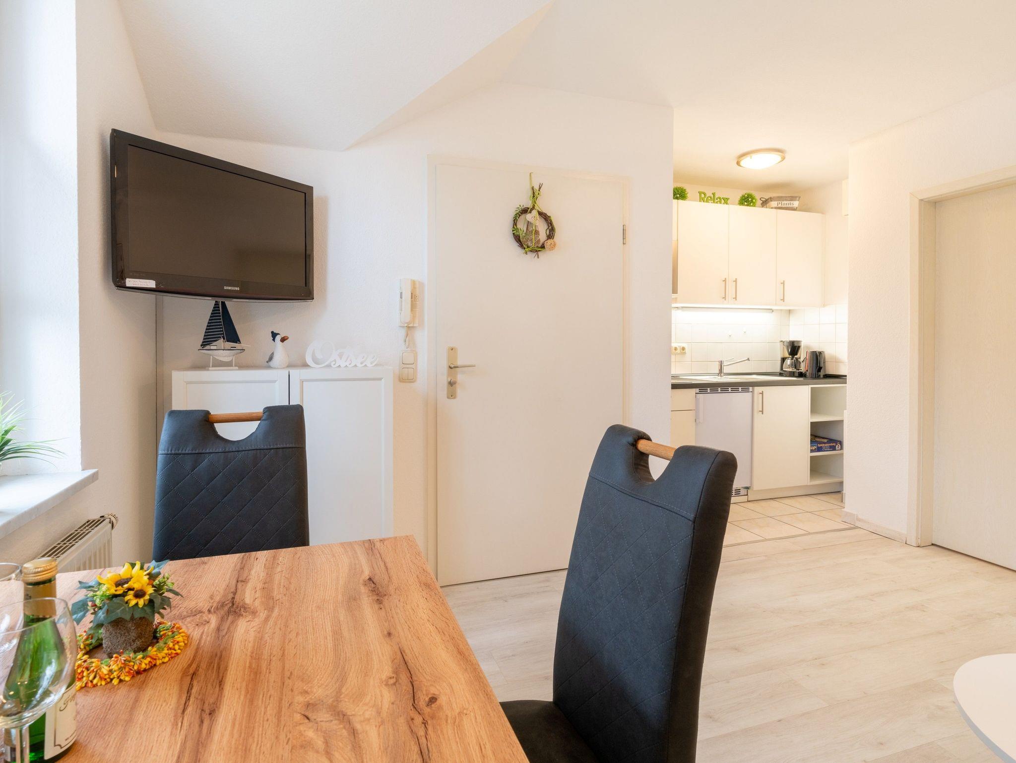Die 2-Raum-Ferienwohnung ist ca. 32 qm groß und befindet sich im 1. Obergeschoss eines kleinen Appartementhauses. Sie verfügt über einen kombinierten Wohn- und Schlafraum mit einer Schlafcouch (1,40x2,00m) und Kabel-TV. Die offene Küchenzeile ist ausgestattet mit Ceran-Herd, Kühlschrank, Mikrowelle, Spüle, Kaffeemaschine, Wasserkocher und Toaster. Das Schlafzimmer verfügt über ein Doppelbett und über einen Kleiderschrank. Das Badezimmer ist mit einer Dusche ausgestattet. Wohn- und Schlafzimmer sind mit Laminat ausgelegt.