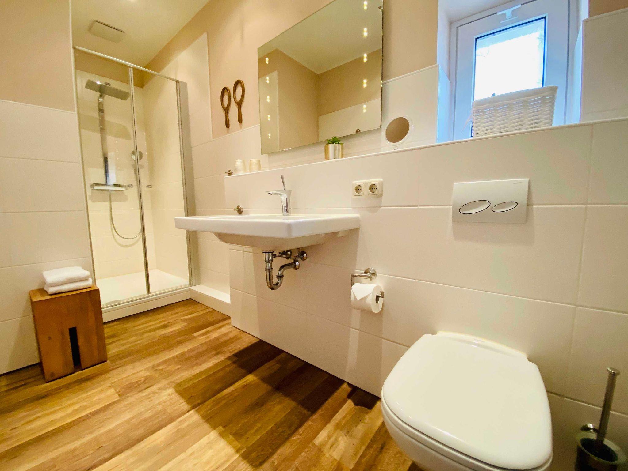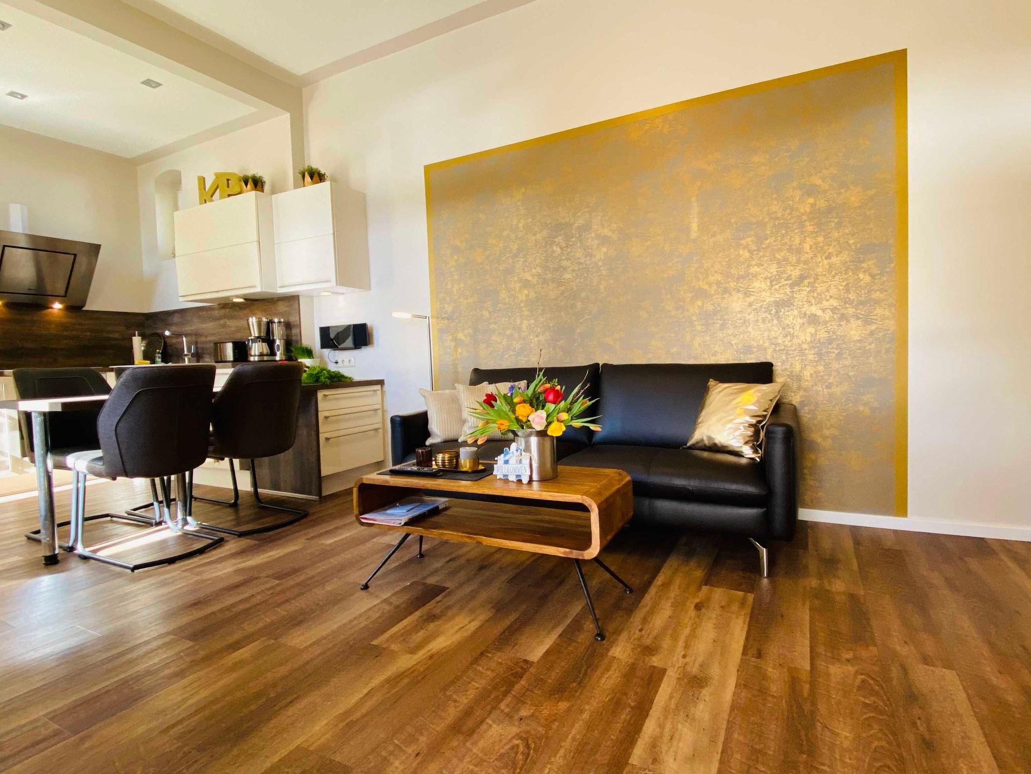 Auch der Anbau der Villa Anna wurde liebevoll saniert. Hier entstanden zwei schöne Ferienwohnungen, im Erdgeschoss die Kleine Anna, die ebenso modern und stilsicher eingerichtet wurde. Auf dem Grundstück gibt es pro Ferienwohnung einen Stellplatz und eine Aufladestation für E-Autos inklusive.