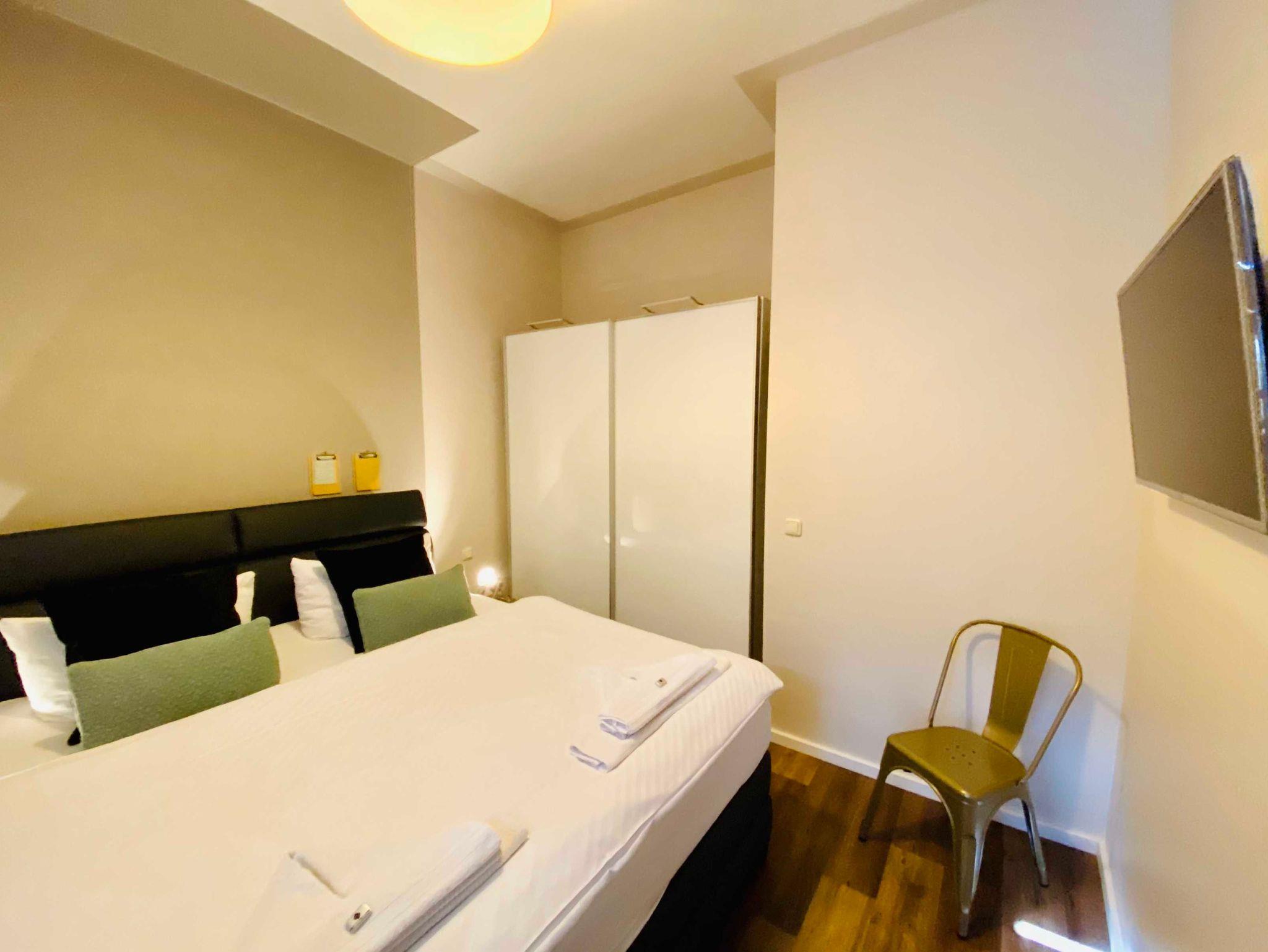 Die moderne Ferienwohnung Kaiserperle mit Balkon ist über eine relativ steile Treppe erreichbar. Im Eingangsbereich erwartet den Gast eine Garderobe, dir rechte Tür führt in das kleine Schlafzimmer, die linke in den modernen Wohnbereich. Der lichtdurchflutete Raum bietet Platz für eine gemütliche Fernsehcouch, einen Esstresen und die offene Küchenzeile (Geschirrspüler, Ceranfeld mit Backofen). Von hier aus gelangt man auf den Balkon und links in das zweite größere Schlafzimmer mit Doppelbett und TV und rechts in das Bad mit höchst modernen Details. Die Kaiserperle überzeugt durch höchsten Komfort in klaren Strukturen und liebevoll ausgewählte Accessoires.