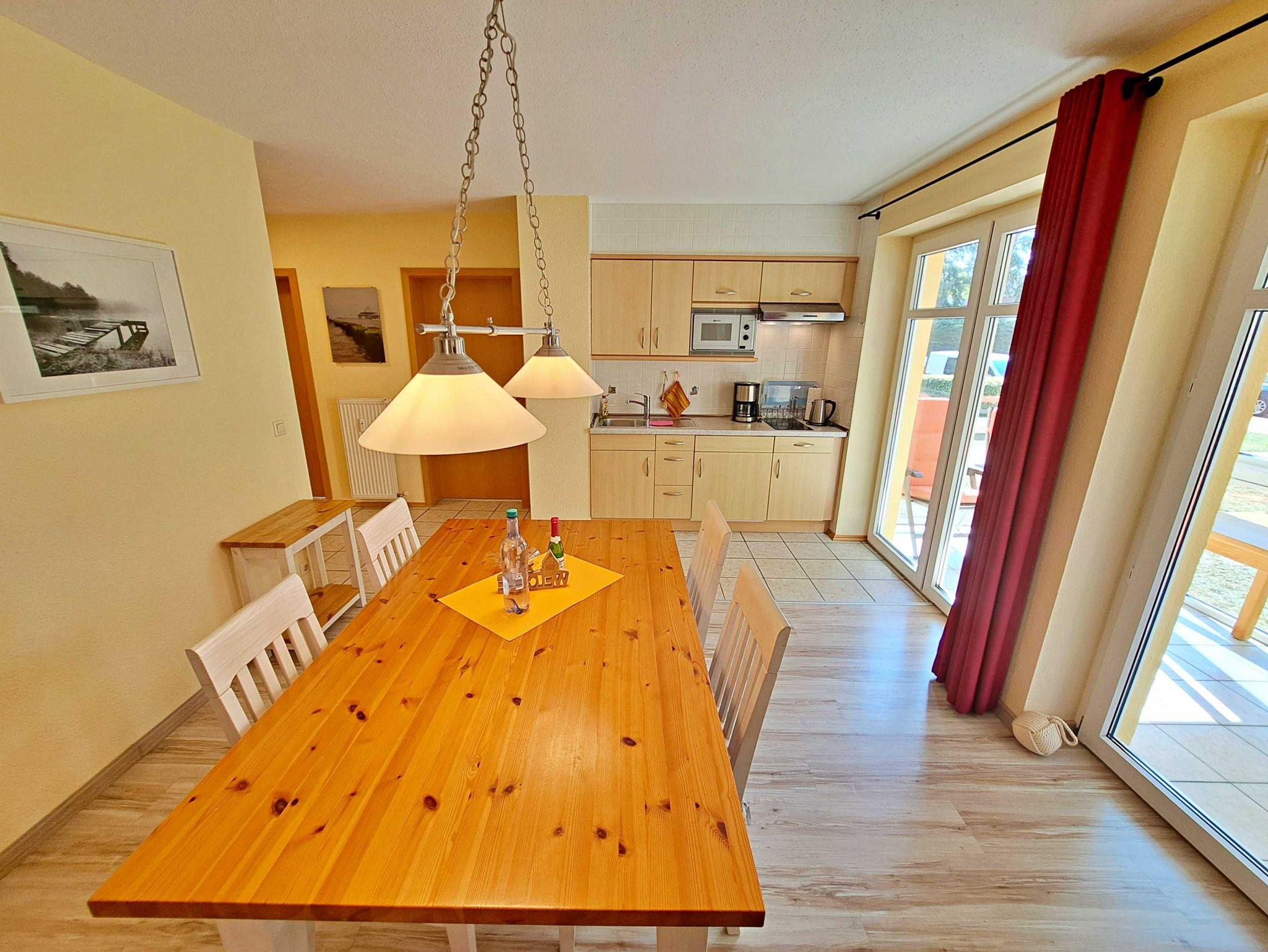Diese freundliche und einladende Unterkunft im Erdgeschoss im Haus Karavelle bietet Platz für 2-4 Personen und ist ideal für Ihren nächsten Urlaub. Dank der südlichen Ausrichtung genießen Sie im angrenzenden Wintergarten ganztägig die warmen Sonnenstrahlen. In den Sommermonaten sorgen die hohen Laubbäume für angenehmen Schatten und eine erfrischende Kühle. Von der Diele aus gelangen Sie in den großzügigen Wohnbereich, der mit einer modernen Küchenzeile und einem Esstisch für vier Personen ausgestattet ist. Die Küche bietet alles, was Sie benötigen, darunter ein 2-Platten-Herd, Kühlschrank, Mikrowelle, Spüle und Geschirr. Im hellen Wohnzimmer finden Sie eine gemütliche Eckcouch, Flat-TV und CD-Player, die zum Entspannen einladen. Ein separates Schlafzimmer mit einem komfortablen Doppelbett und ein Tageslicht-Bad mit Dusche/WC runden das Angebot ab. Für die kleinen Gäste werden gerne ein Kinderreisebett und einen Hochstuhl kostenfrei zur Verfügung gestellt. Ein Pkw-Stellplatz auf dem umzäunten Grundstück steht Ihnen ebenfalls zur Verfügung. Zudem können Sie gegen Entgelt eine Waschmaschine und einen Wäschetrockner im Objekt nutzen. Die Erstausstattung Bettwäsche und Handtücher kann bei der Buchung der Ferienwohnung für nur 17,50 € pro Person hinzugebucht werden. WLAN-Zugang ist für ein Gerät kostenfrei, für jedes weitere Gerät werden 10 € pro Woche berechnet.