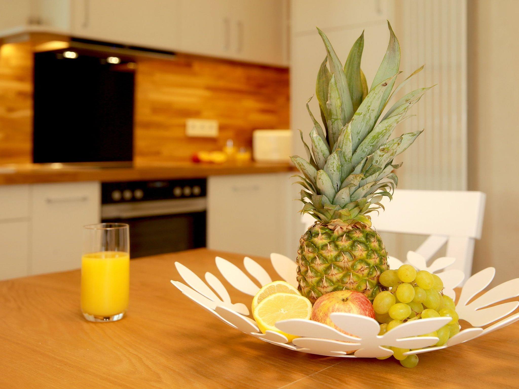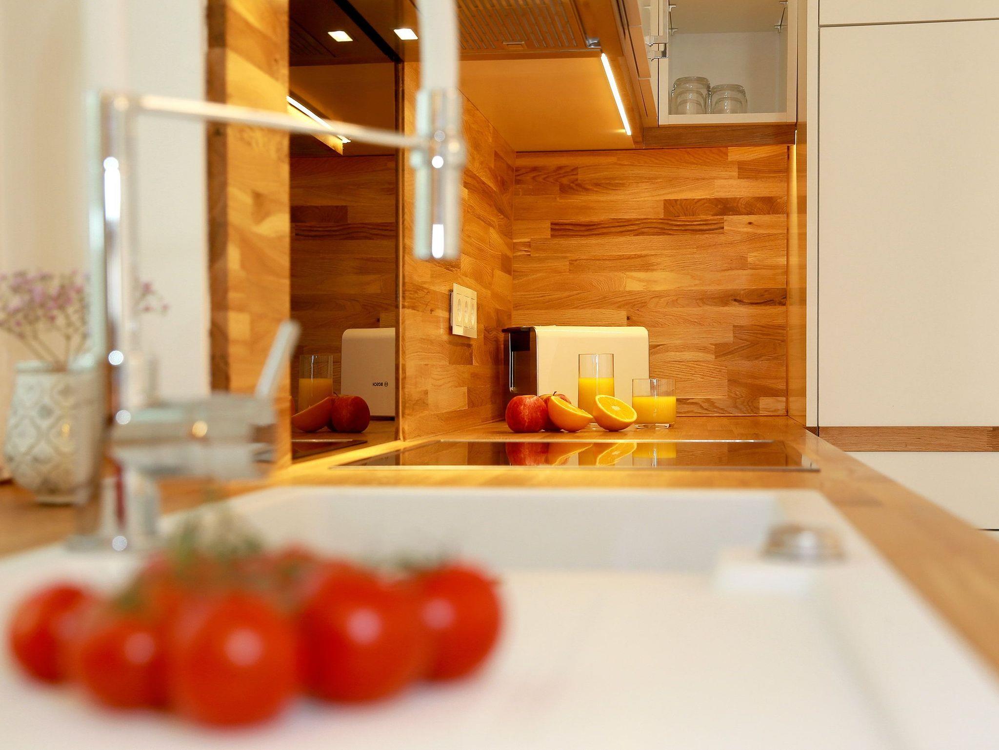 Die vollausgestattete Küche ergänzt die Annehmlichkeiten dieses neuen Appartements mit allen Raffinessen: Backofen, Mikrowelle, Kühlschrank mit Gefrierfach, Toaster, Wasserkocher, Kaffeemaschine sowie einem Essplatz für 4 Personen.