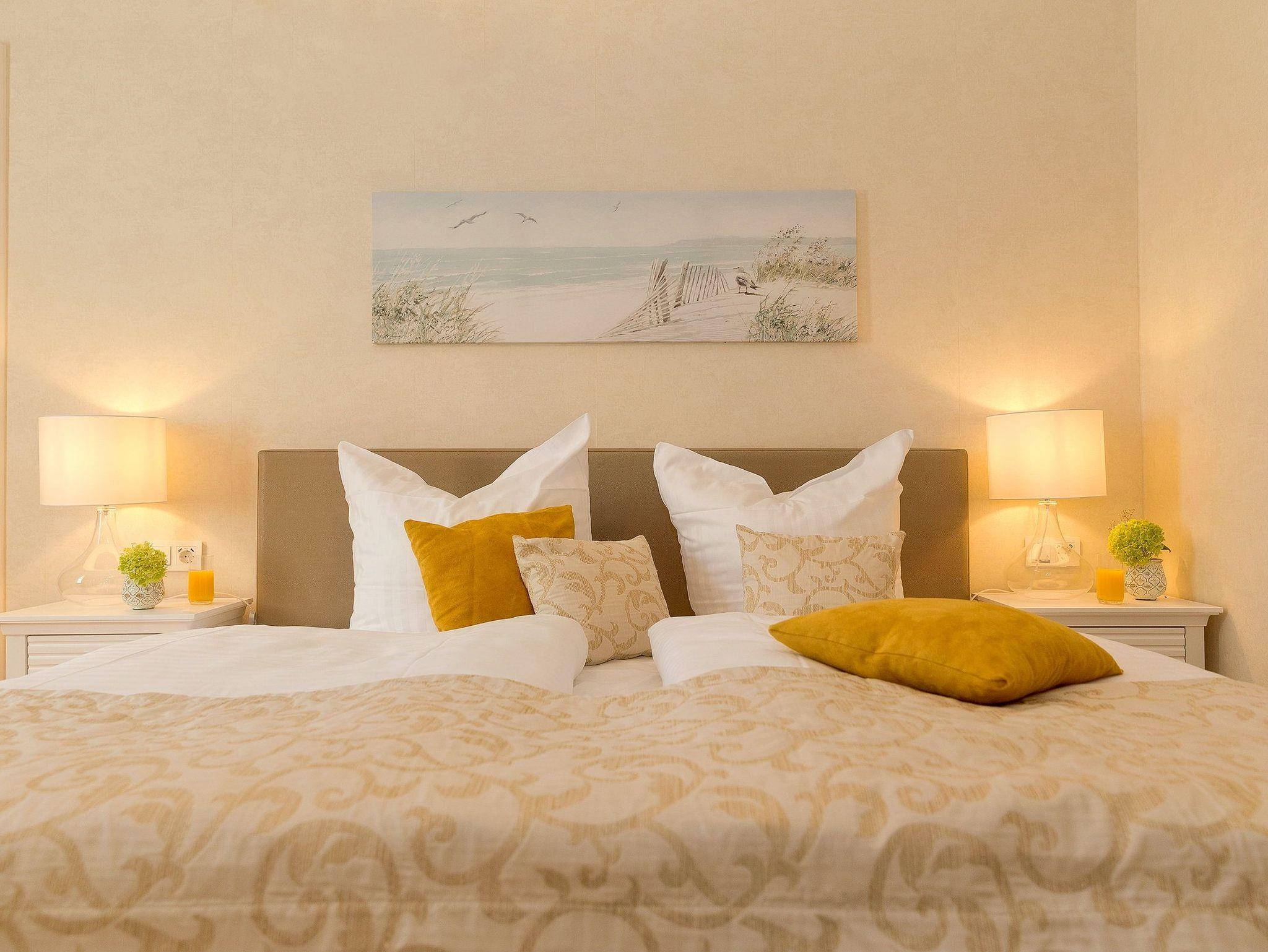 Die vier Schlafplätze verteilen sich auf das Schlafzimmer, mit einem bequemen und zugleich hochwertigem Boxspringbett (200 x 200cm / durchgehende Matratze) und der Schlafcouch im Wohnbereich, welche sich im Nu für zwei Gäste als Schlafstätte umfunktionieren lässt. Ein Kleiderschrank zum Verstauen Ihrer Habseligkeiten während Ihrer Urlaubszeit steht für Sie bereit.