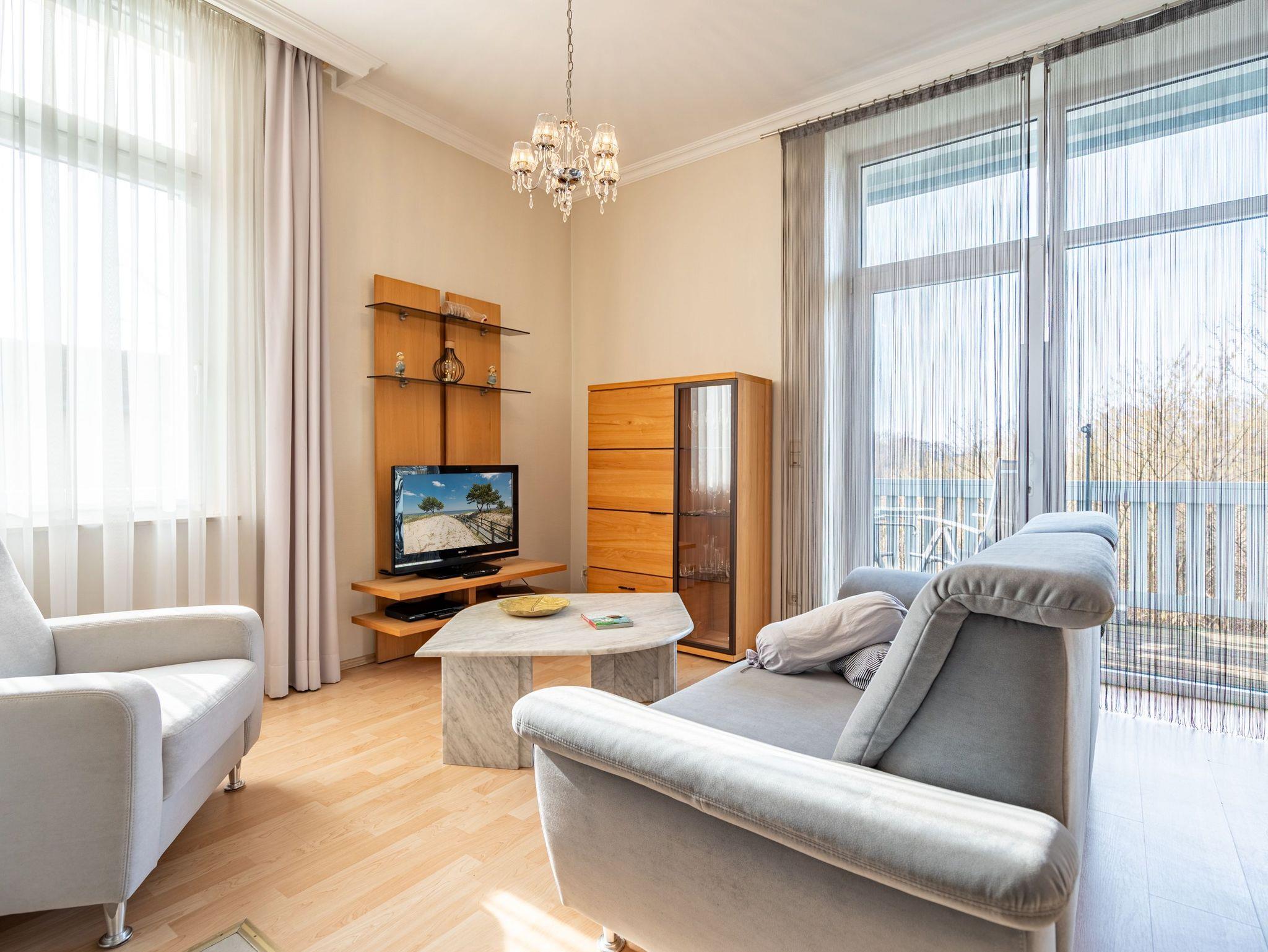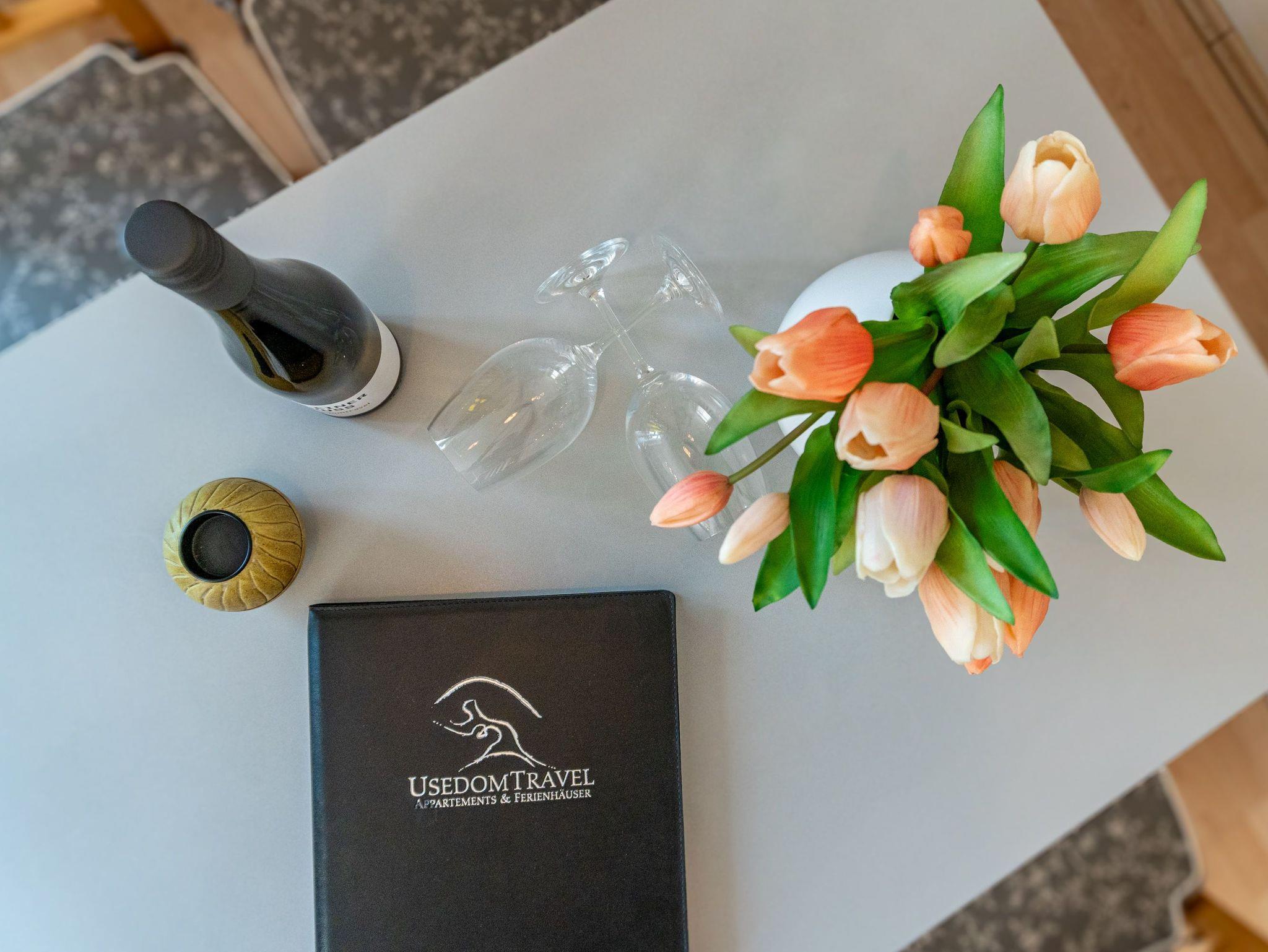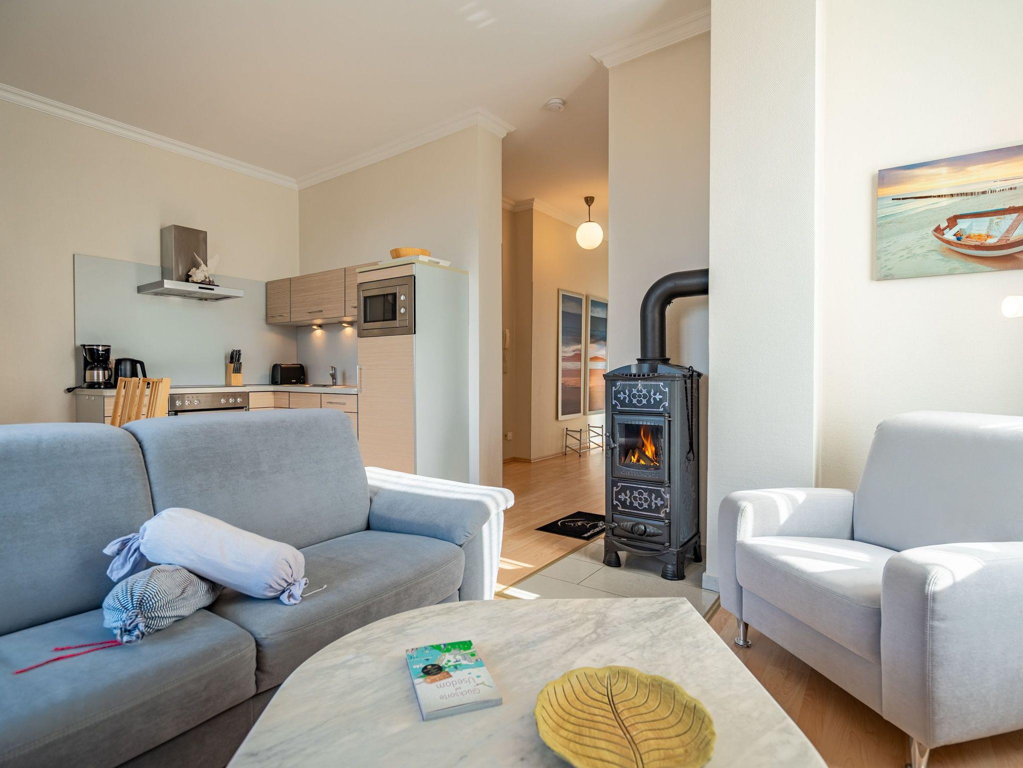 Moderne 2-Zimmer-Ferienwohnung mit Kamin und Südbalkon in Heringsdorf, nahe Strand und Promenade.