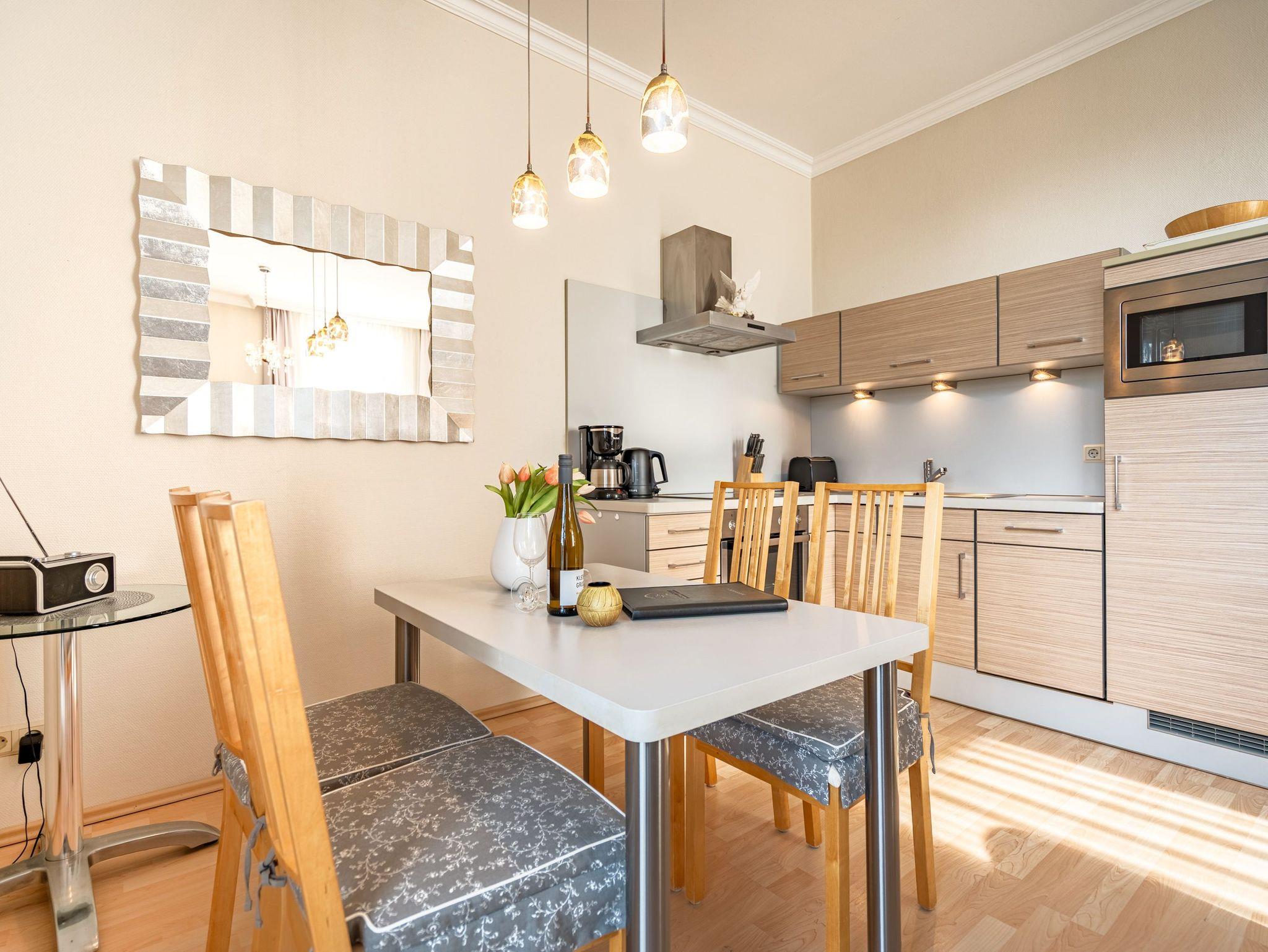 Diese wunderschön gestaltete 2-Raum-Ferienwohnung empfängt Sie in der 1. Etage der Villa Seestern und bietet Platz für 2 Personen und 1 Kleinkind bis 3 Jahre. Die stilvolle, moderne Möblierung und die geschmackvollen Dekorationen sorgen für einen schönen Urlaub. Sie fahren mit dem Fahrstuhl direkt in Ihre Wohnung. Hier angekommen, erreichen Sie den Wohnbereich (Flat-TV, DVD) und eine offene, komplett ausgestattete Küchenzeile. Das großzügige Schlafzimmer mit Doppelbett verfügt über einen zweiten TV. Ein modernes Wohlfühlbad mit WC, Bidet und Dusche ergänzt dies. Auf dem Südbalkon mit Blick ins Grüne genießt man nicht nur seinen Kaffee. Der Kaminofen verspricht besonders in der kalten Jahreszeit angenehme Stunden. Auf Wunsch stellen wir für unsere kleinen Gäste ein Kinderreisebett (ohne zusätzliche Matratze [&] Bettzeug) und einen Kinderhochstuhl ( gegen einen Aufpreis) zur Verfügung. Für Ihren Komfort sind die Betten bei der Anreise bezogen und Handtücher liegen bereit (Erstausstattung). Für den Tag am Meer steht Ihnen als besonderes Bonbon von Mitte Mai bis Ende September (je nach Witterung) ein Strandkorb am Strand kostenlos zur Verfügung. Auch das WLAN-Netz kann kostenfrei genutzt werden.