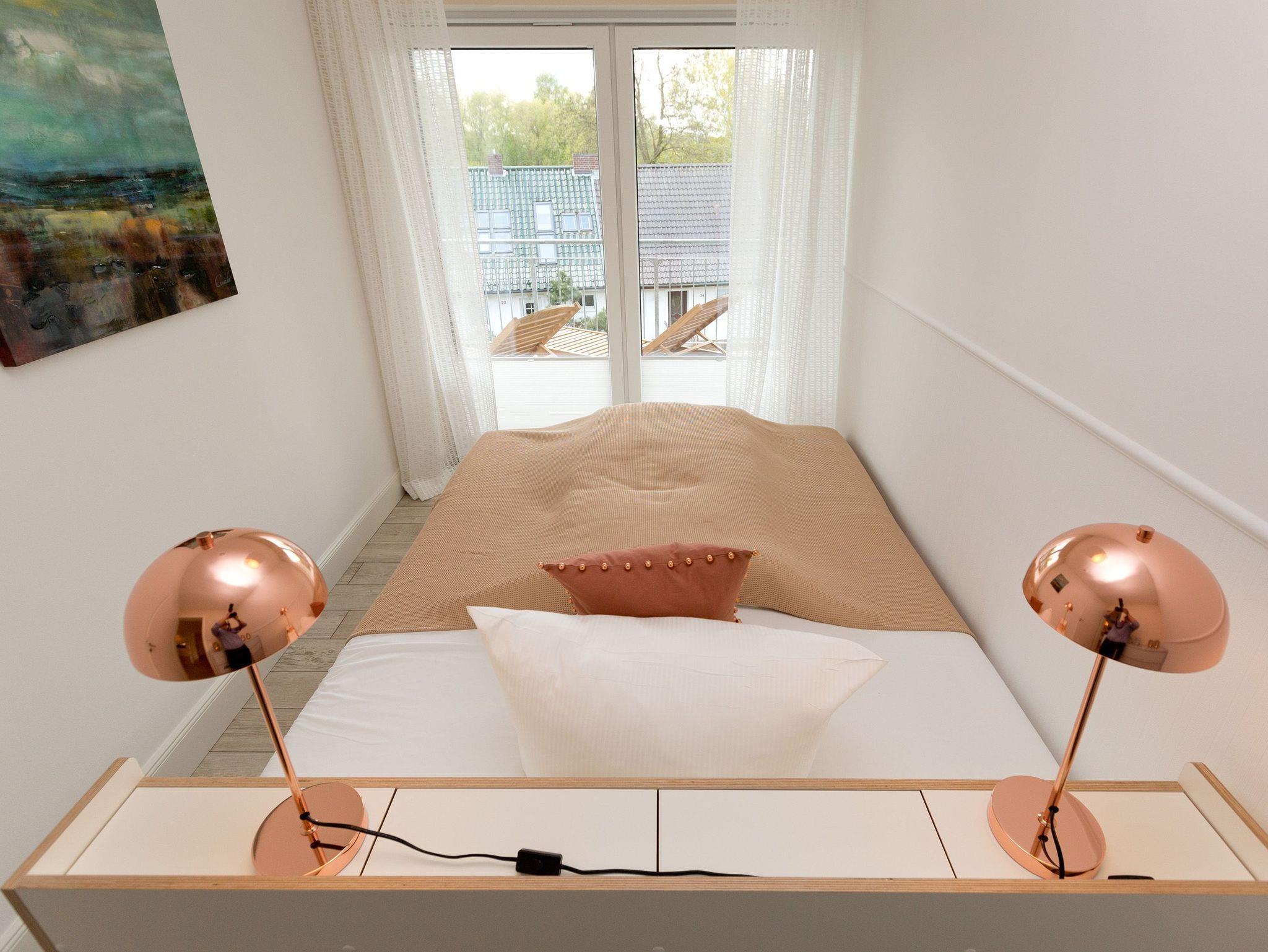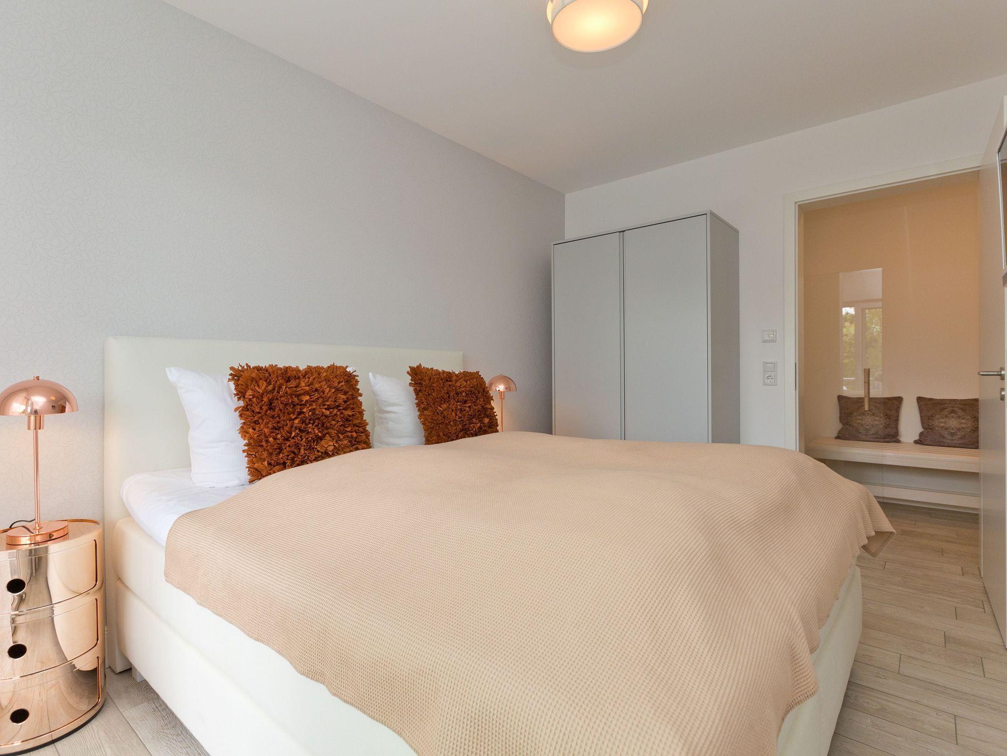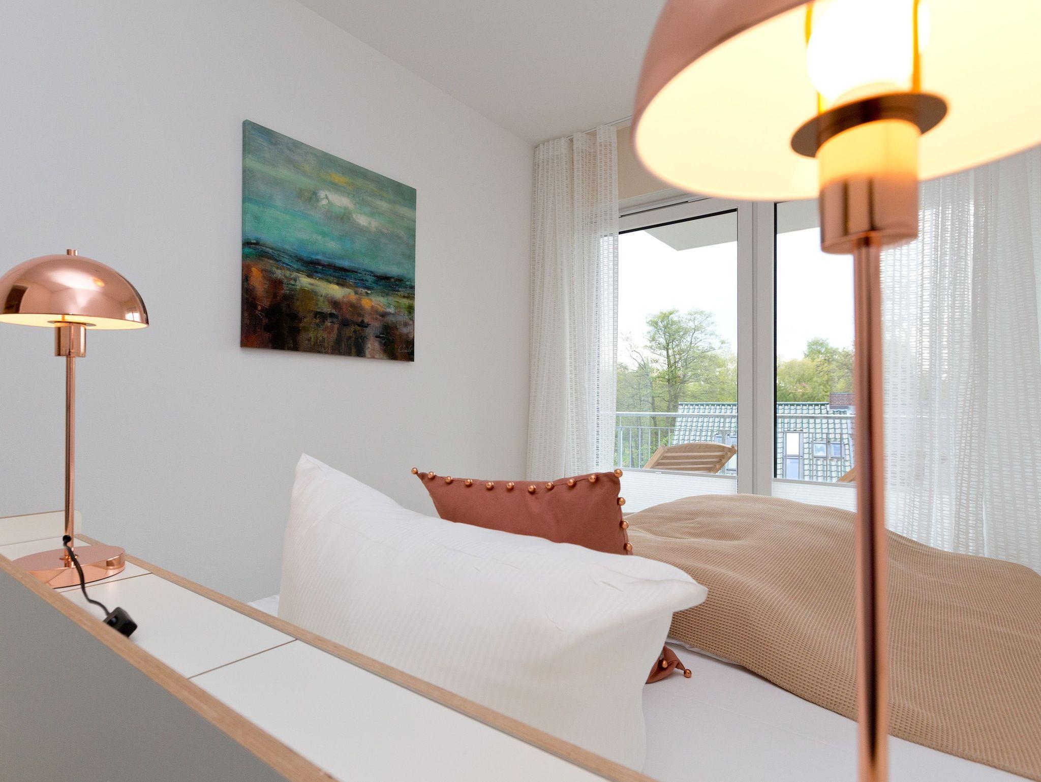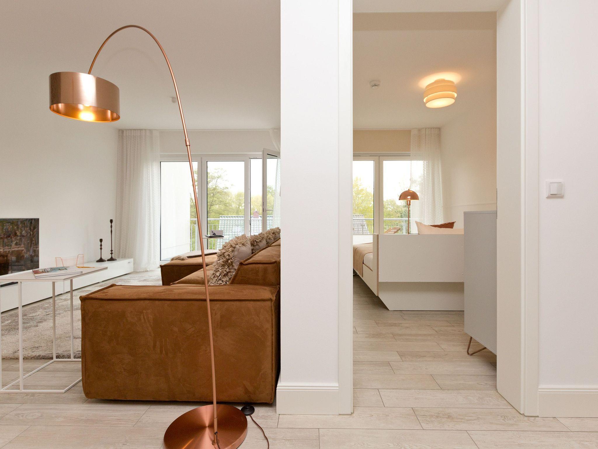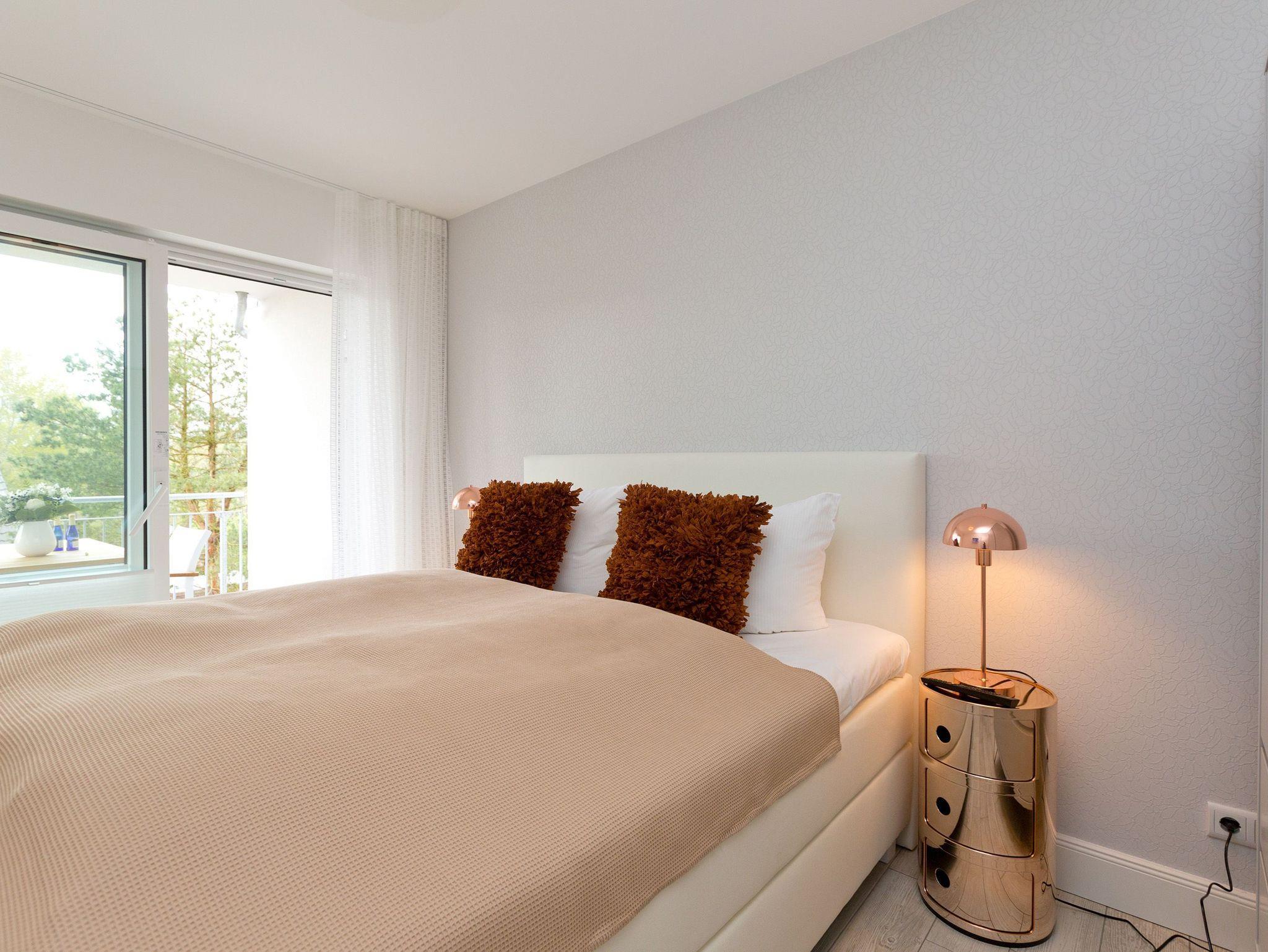 Viel Weiß, warmes Kupfer, Roségold und Brauntöne sorgen in den 80 Quadratmetern der Wohnung 16 in der 2. Etage der Dünenresidenz Heringsdorf für eine elegante und exklusive Urlaubsatmosphäre. Das stylische und moderne Design zieht sich hier durch jeden der drei Räume. Ein Urlaubsparadies für bis zu vier Personen, in dem Sie sich absolut wohlfühlen werden. Ein wunderschöner, großzügiger Wohn-Essbereich mit geschmackvollen Accessoires dekoriert und eine offene Küche laden zum Abschalten und Chillen ein. Lassen Sie sich in die riesige Sofalandschaft fallen, schauen Sie Filme oder Fern auf dem großen Flat-TV oder entspannen Sie beim Blick auf die flackernden Flammen des Elektro-Kamins. Sonne satt erwartet Sie auf dem weitläufigen Südbalkon ? begehbar von allen Zimmern aus ? mit Sonnenliegen und Esstisch. Die Wohnküche ist voll ausgestattet. Hier können Sie nach Herzenslust kochen und anschließend genießen. Himmlisch sind die Boxspringbetten (einmal 1,80 m x 2,00 m und einmal 1,60 m x 2,00 m) in den beiden Schlafzimmern. Eines der beiden Zimmer verfügt zudem über einen weiteren Flat-TV. Das Badezimmer ist mit einer geräumig Dusche, Waschtisch und WC ausgestattet und mit viel Liebe zum trendigen Detail gestaltet. Highlight des Appartements ist die finnische Sauna. Für einen rundum erholsamen Urlaub liegen die Handtücher für Sie bereit und die Betten sind bezogen. WLAN können Sie kostenfrei benutzen und ein Pkw-Stellplatz ist für Sie in der Tiefgarage (max. Einfahrtshöhe 1,93 m) reserviert.