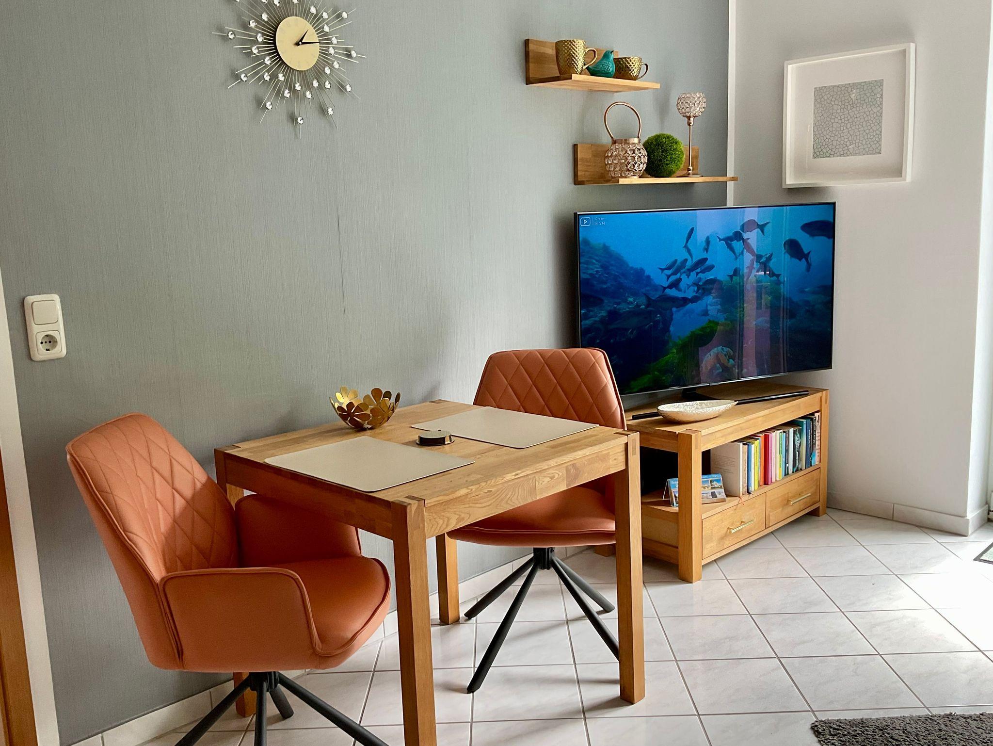Genießen Sie die behagliche Atmosphäre im Wohnbereich mit komfortablem 2-Sitzer-Sofa, gemütlichem Sessel und einem Flat-TV. Der angrenzende Esstisch lädt zu einem entspannten Frühstück ein - der perfekte Start in Ihren Urlaubstag.