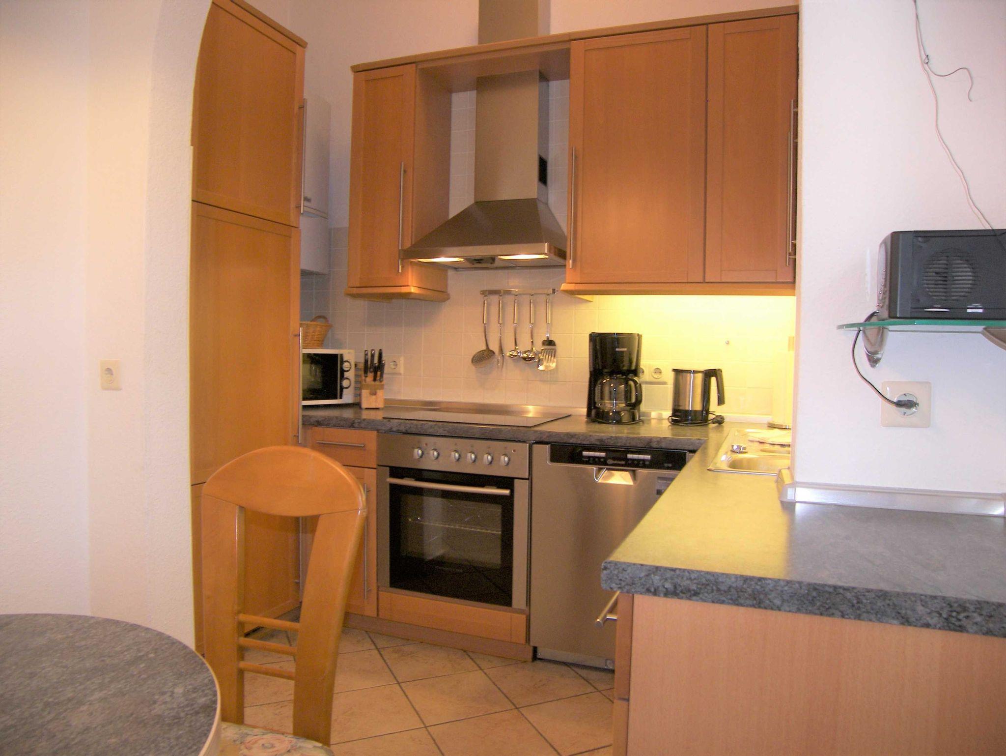 Die geräumige Ferienwohnung ?Coralle? hat 3 Zimmer und befindet sich im Erdgeschoß des Gartenhauses. Sie ist für max. 4 Feriengäste geeignet. Das Wohnzimmer verfügt über 2 Schlafsofas (Querschläfer) und einen großzügigen Essplatz mit 6 Stühlen im Erker. Das Schlafzimmer ist mit einem Doppelbett (160 x 200 cm) ausgestattet. Das dritte Zimmer ist als Wohn- / Schlafzimmer nutzbar und besitzt zwei Schlafsofas (je 90 x 200 cm). Im Wohnzimmer befindet sich Teppichboden. In den beiden anderen Zimmern ist ein Laminatboden verlegt. Die Wohnung ist ausgestattet mit Kabel ? TV in drei Zimmern und je einer Musikanlage in zwei Zimmern. In der Küche befindet sich eine hochwertige Einbauküche mit Elektroherd, Kühl- / Gefrierkombination, Mikrowelle, Kaffeemaschine, Toaster, CD ? Radio und Spülmaschine. Im Vorderhaus besteht die Möglichkeit der Nutzung eines Münztrockners. Weiterhin gehören zur Wohnungsausstattung ein Bügeleisen und ?brett sowie ein Fön. Ein Kinderbett und ein Hochstuhl sind auf Anfrage beim Verwalter kostenlos erhältlich.