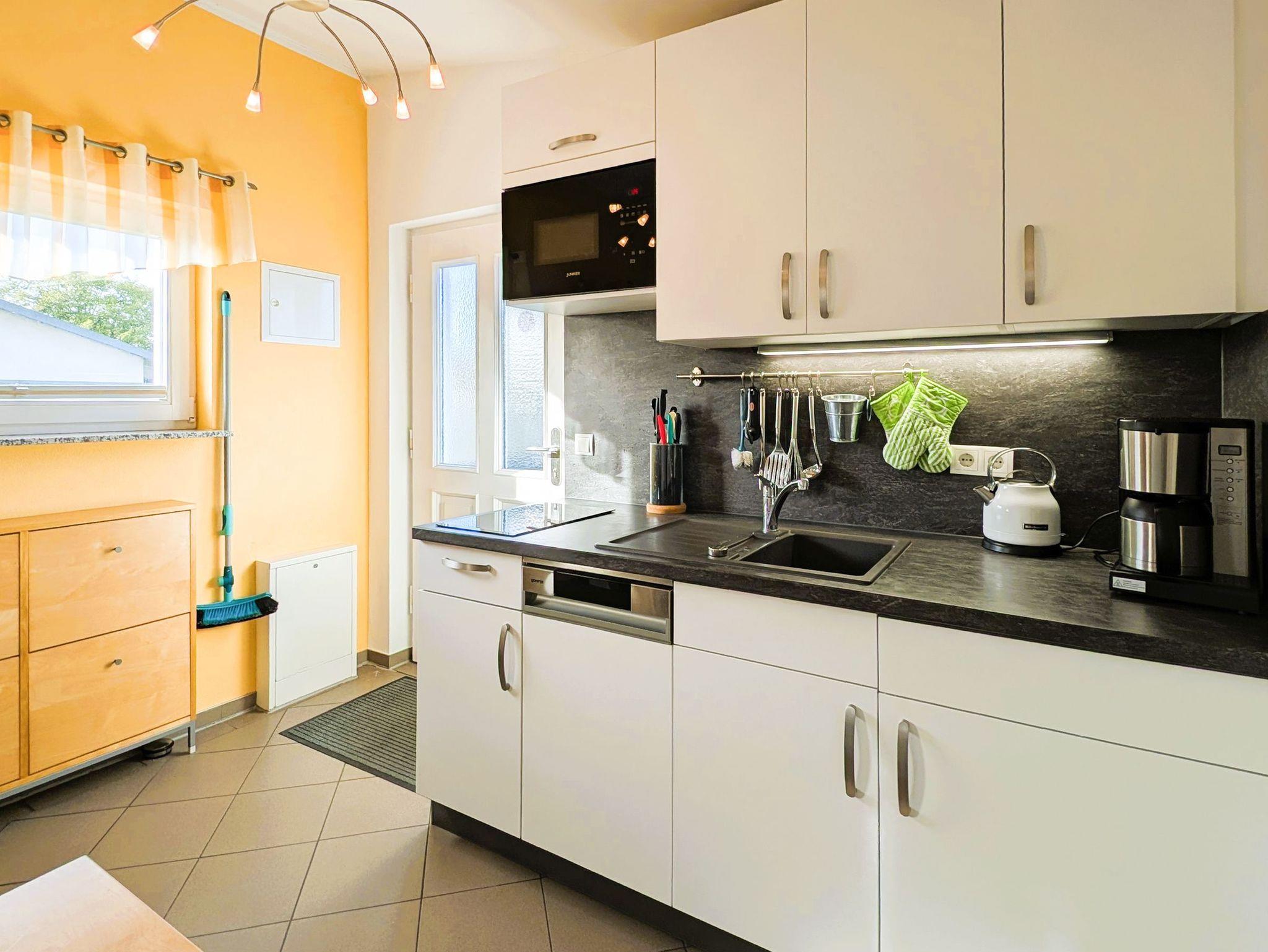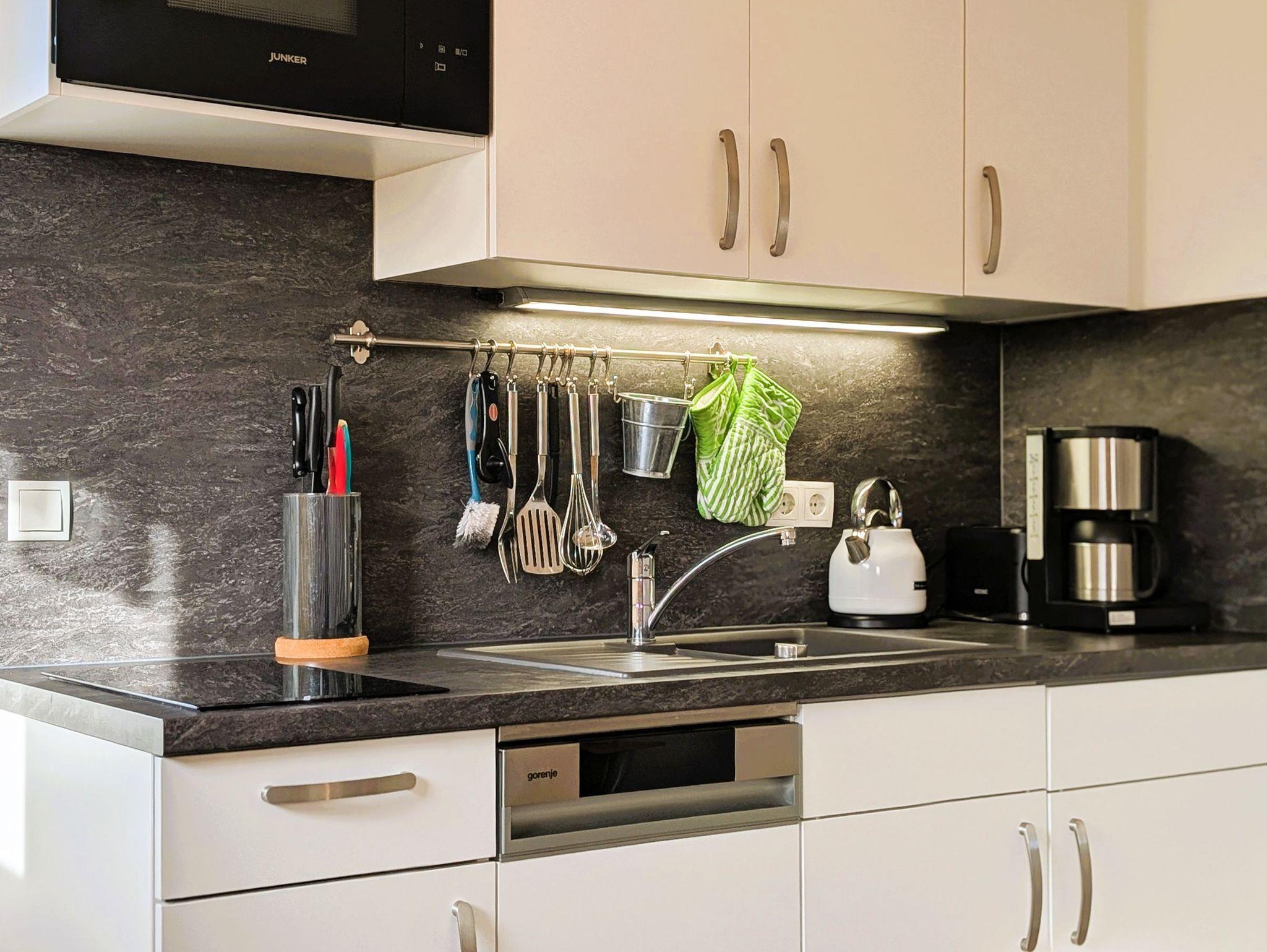 DieKüchenzeile bietet alles, was Sie für Ihren Aufenthalt benötigen: einen Kühlschrank, eine Mikrowelle, eine Kaffeemaschine und zwei Herdplatten, Spülmaschine sowie einen Esstisch für zwei Personen.