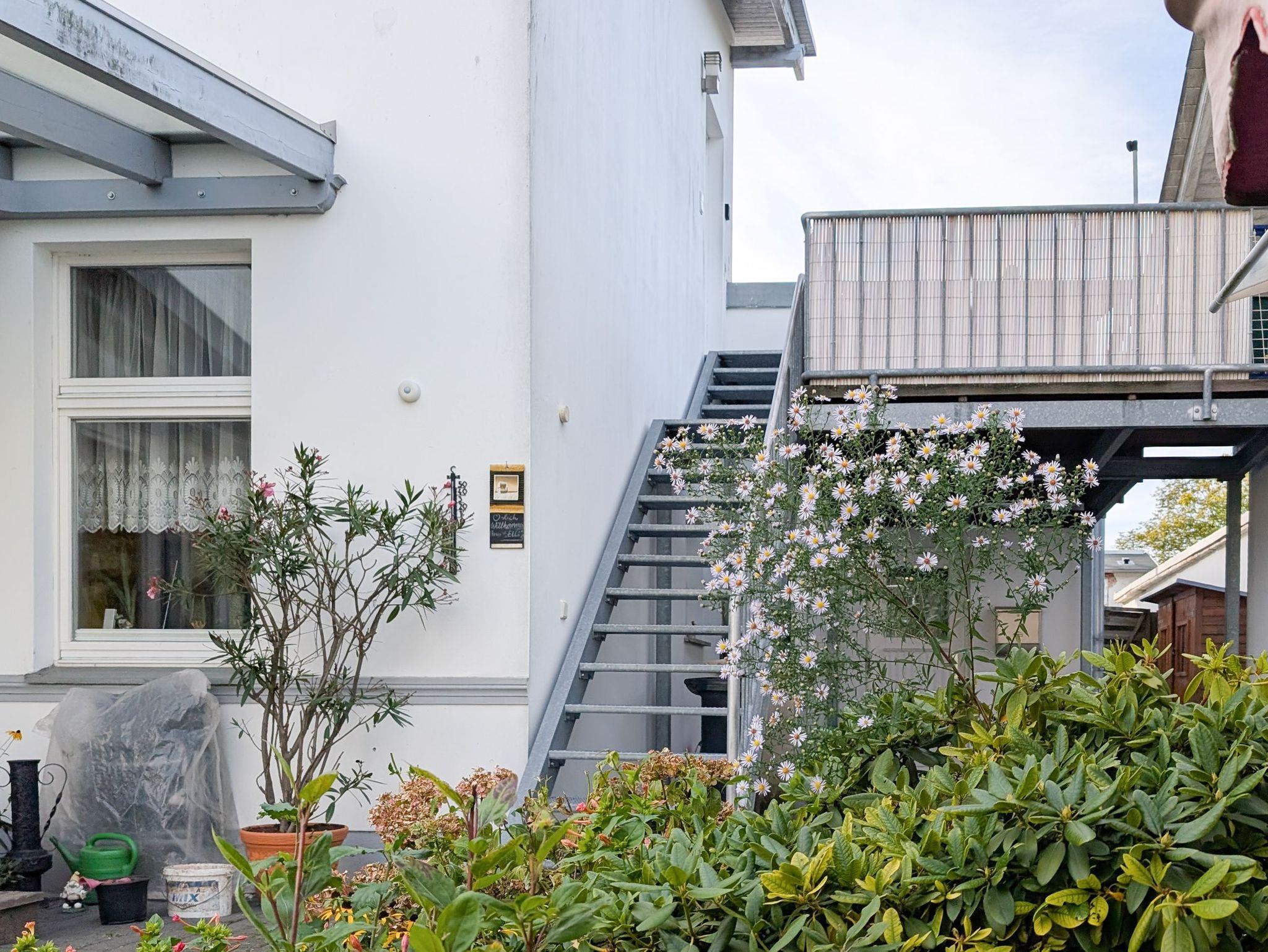 Das Appartement liegt im Obergeschoss und ist über eine Metalltreppe zu erreichen.