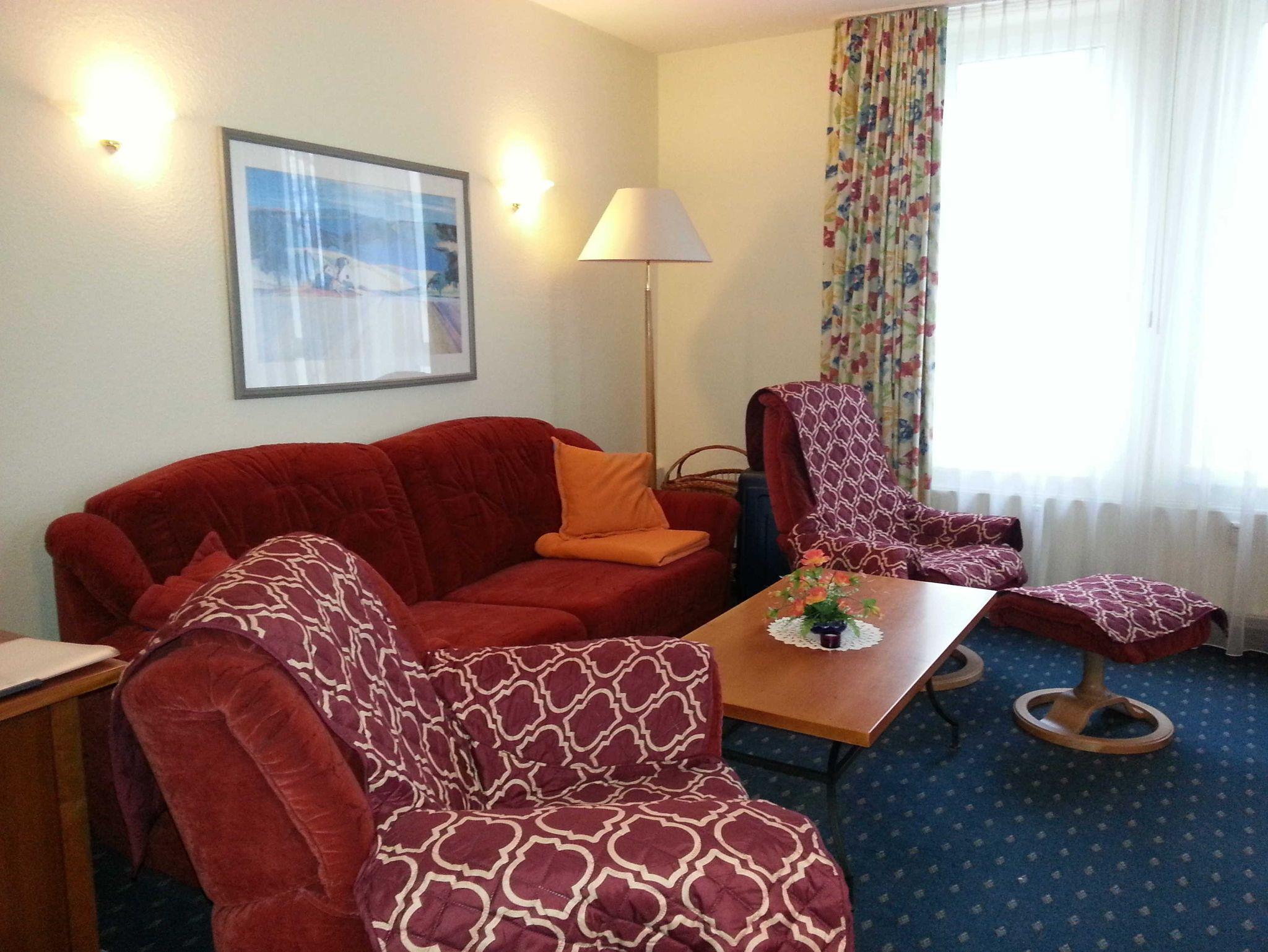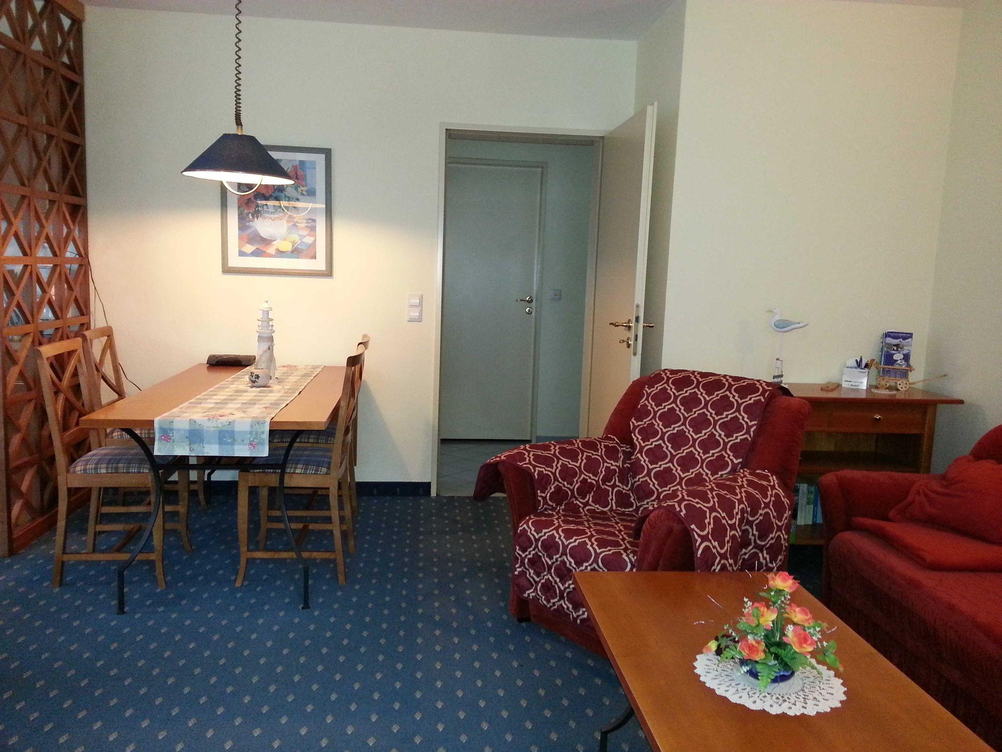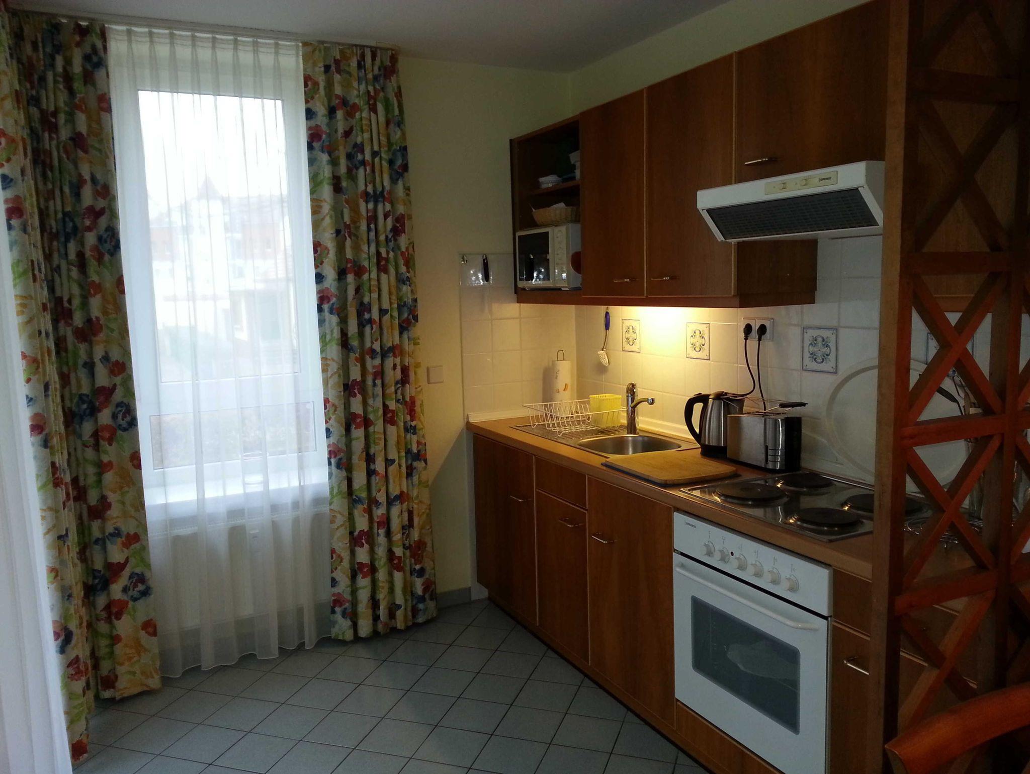 Freundliche,sehr helle Zweizimmer Ferienwohnung (45qm) für 2 - 3 Personen mit Balkon, direkt an der Promenade in gepflegtem Park mit altem Baumbestand gelegen. Die Wohnung hat neben dem Wohn- und Essbereich eine offene Küche mit Mikrowelle, Herd und Backofen. Das Schlafzimmer verfügt über ein Doppelbett.