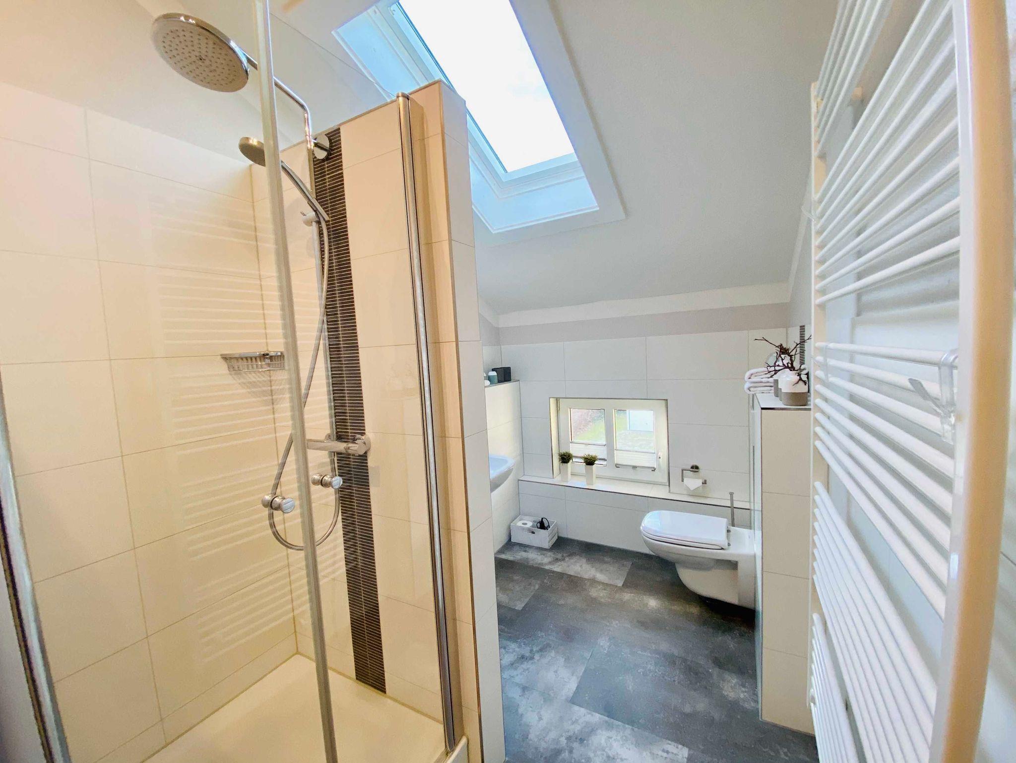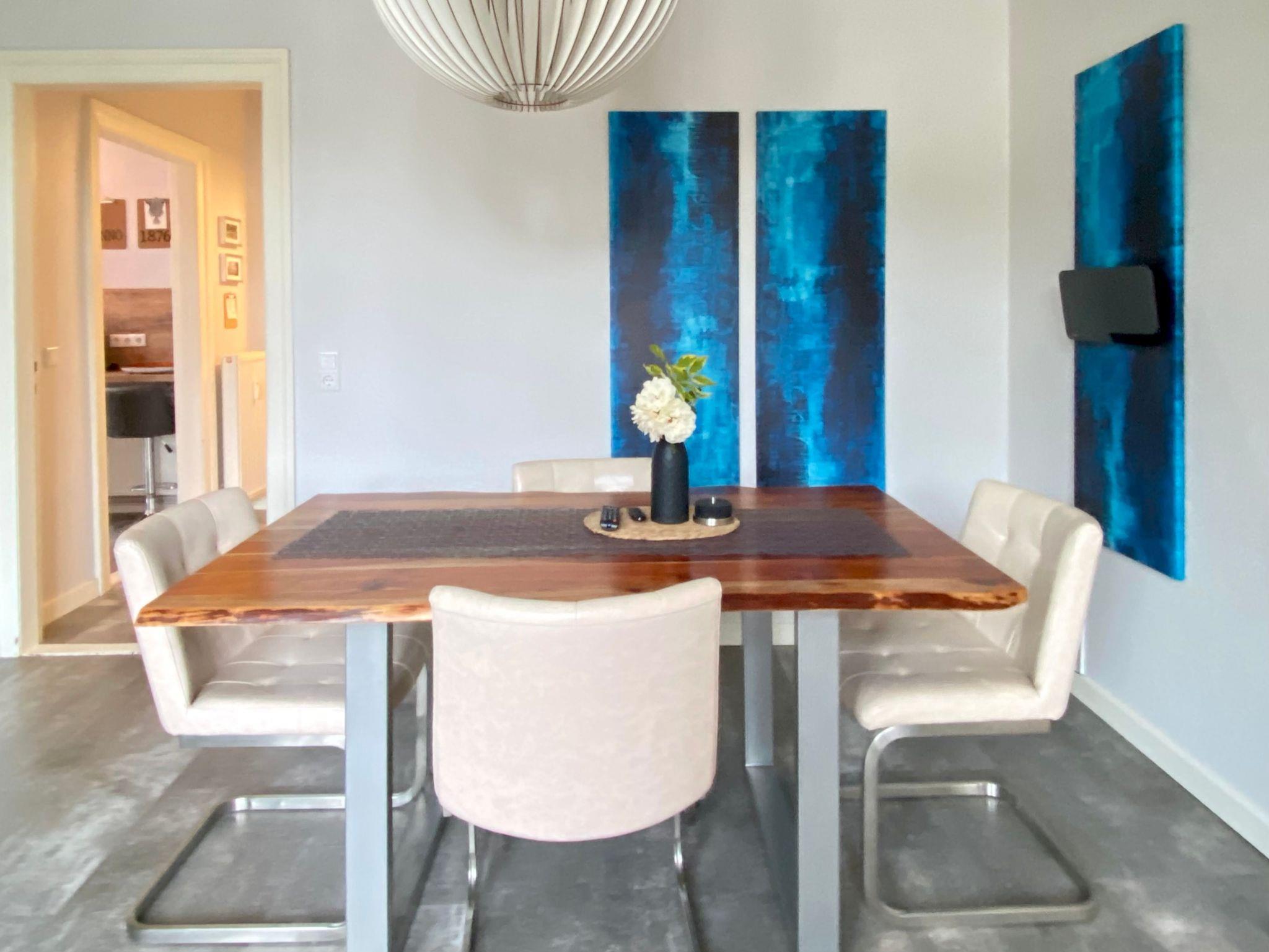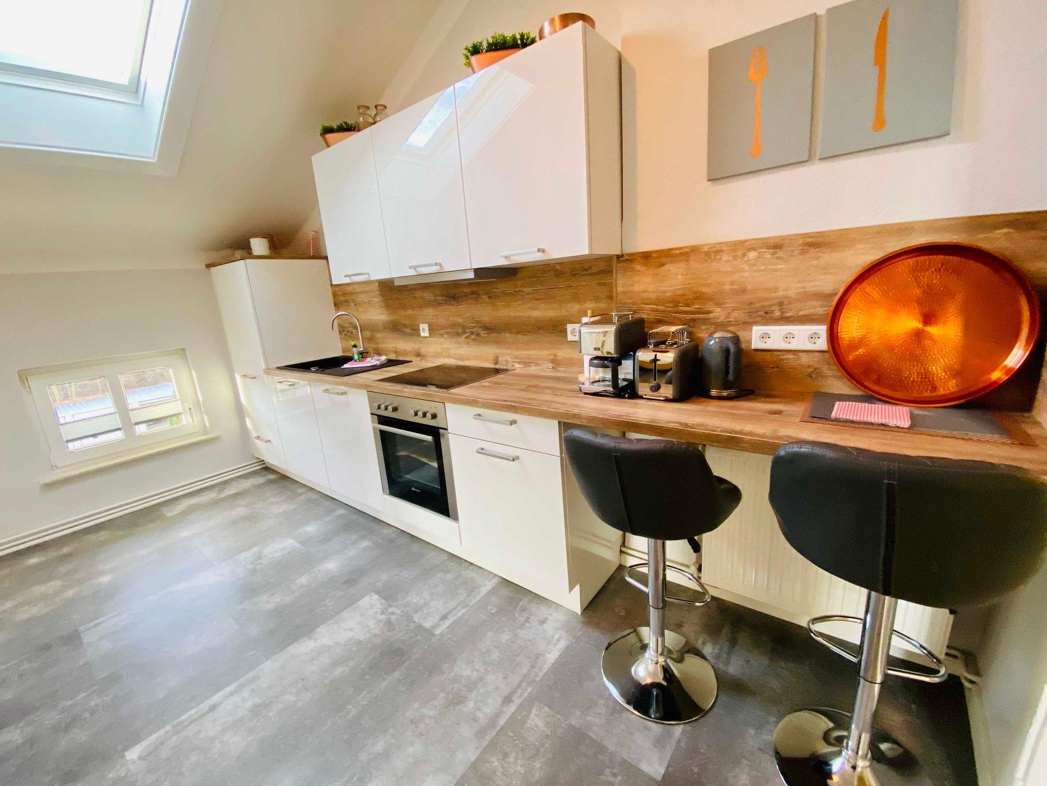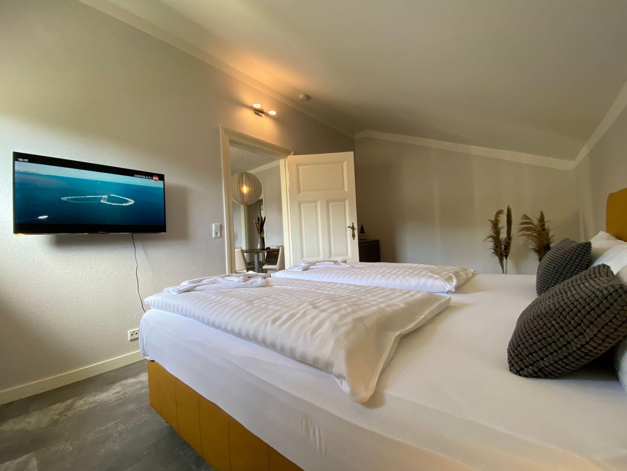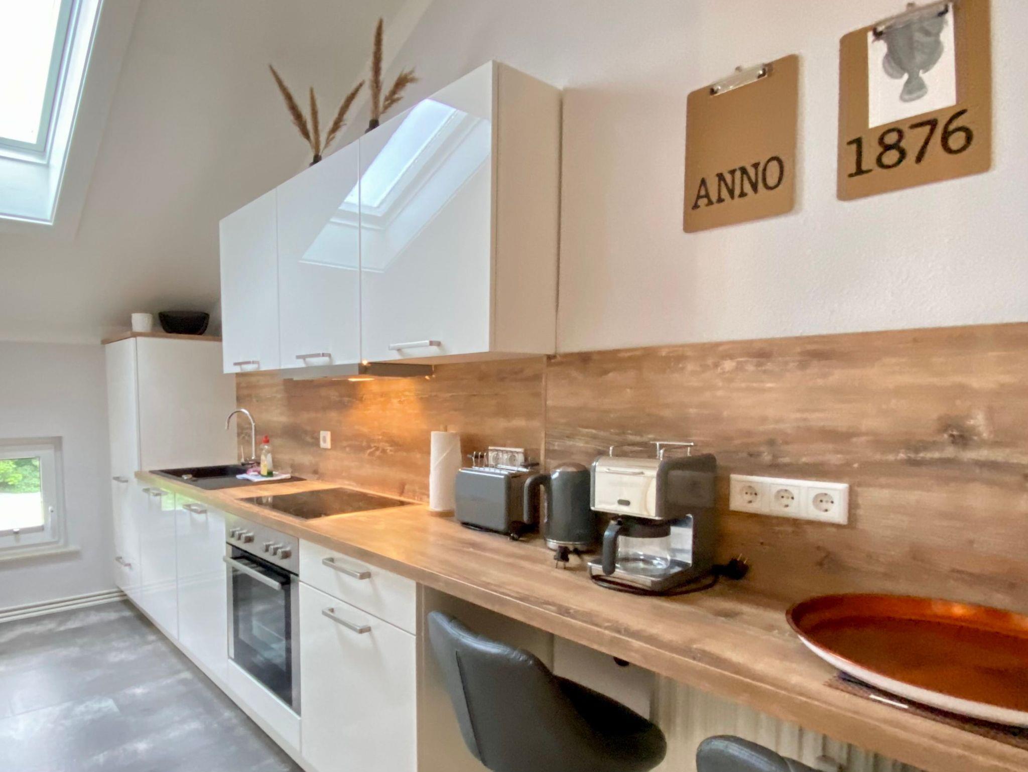 Auch der Anbau der Villa Anna wurde liebevoll saniert. Hier entstanden zwei schöne Ferienwohnungen, im Erdgeschoss die Kleine Anna, die ebenso modern und stilsicher eingerichtet wurde. Auf dem Grundstück gibt es pro Ferienwohnung einen Stellplatz und eine Aufladestation für E-Autos inklusive.