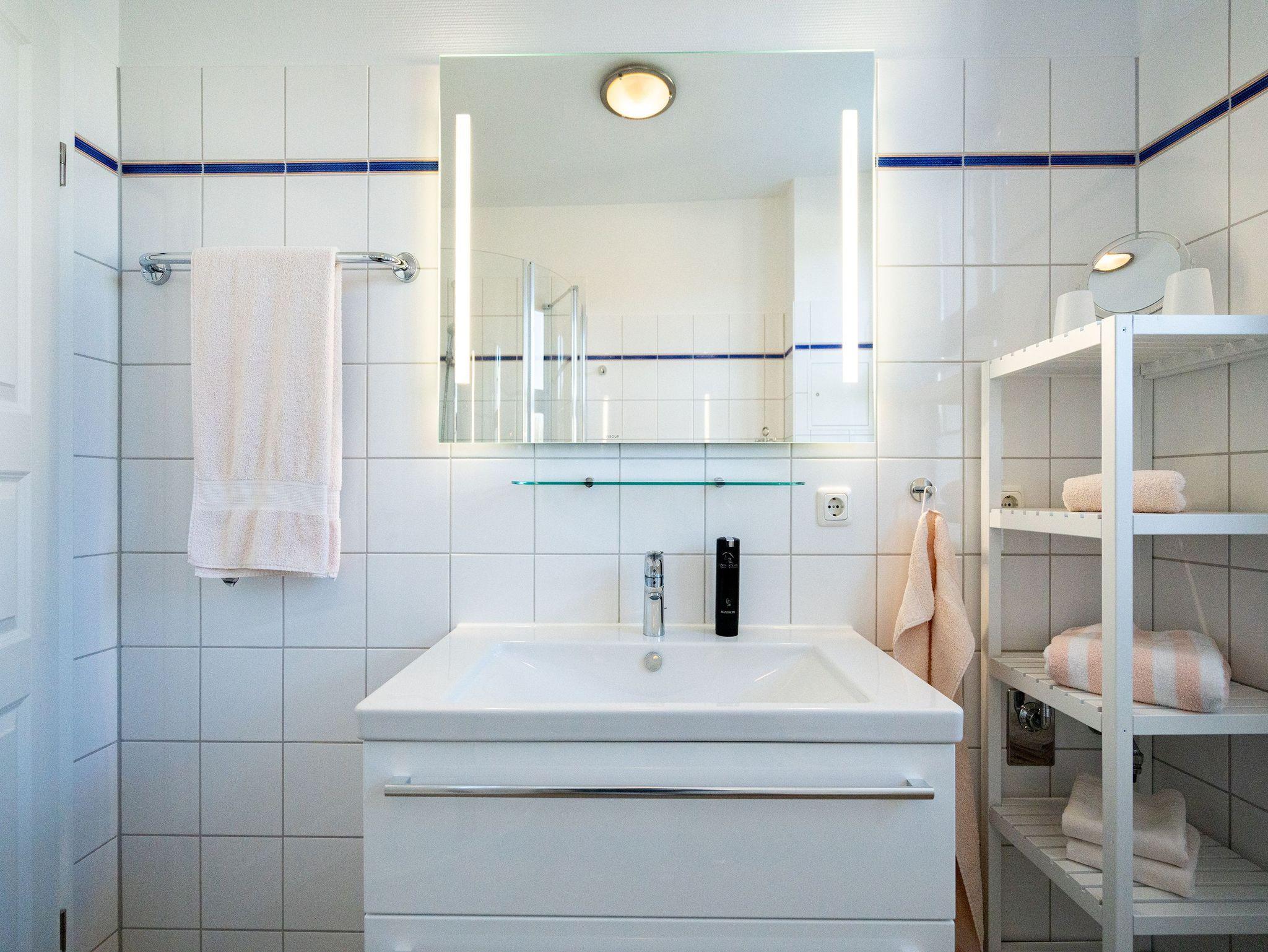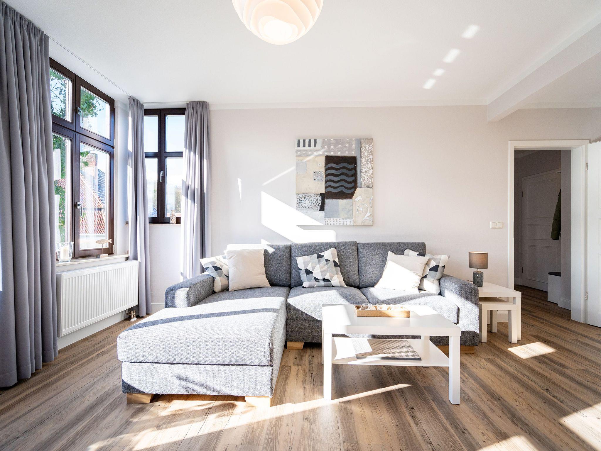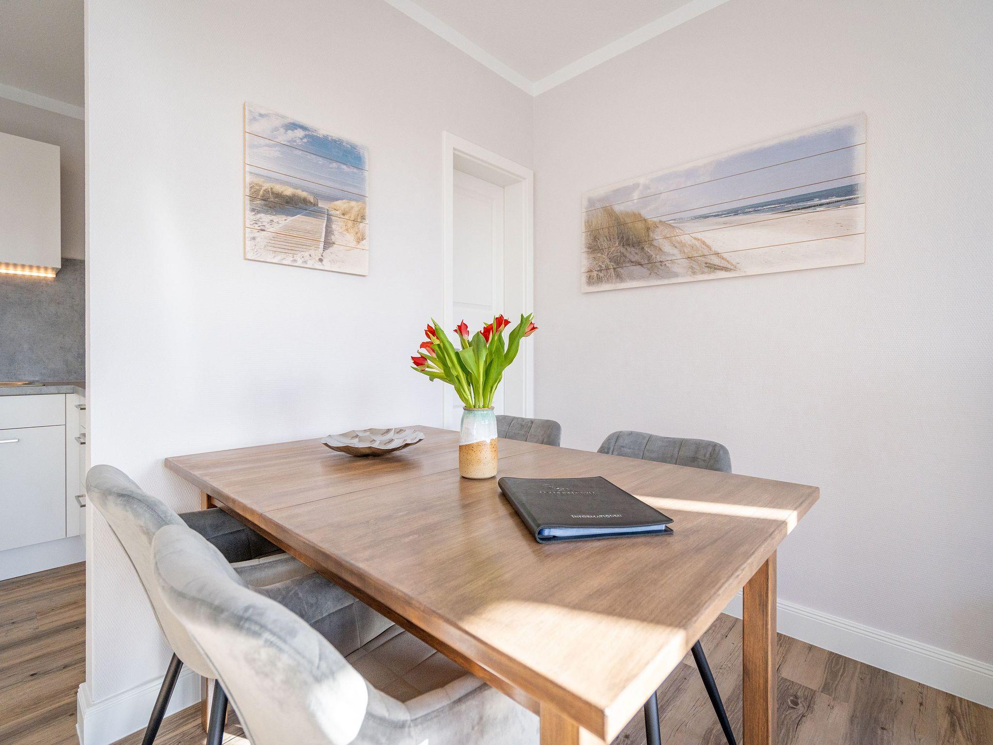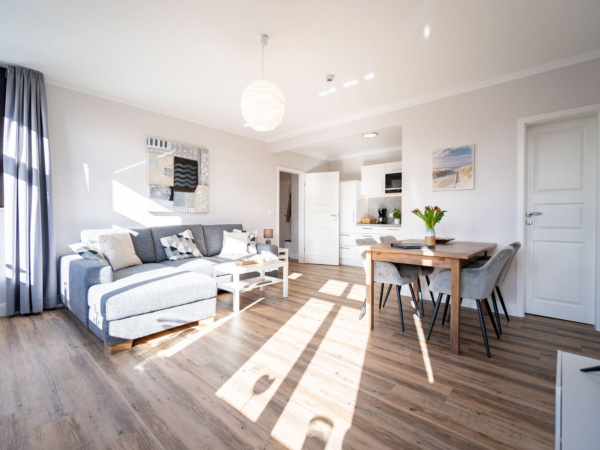 Die helle, lichtdurchflutete 2-Raum-Ferienwohnung (58 qm max. 4 Personen) empfängt Sie in der 2. Etage des Hauses. Für Ihren Komfort ist es komplett ausgestattet und verfügt über einen großzügigen Wohnbereich mit Flat-TV, Radio mit Bluetooth-Box sowie integrierter Küchenzeile und separatem Essplatz. Das Schlafzimmer bietet Platz für 2 Personen und verfügt über ein Doppelbett, für die 3. und 4. Person bietet die Couch mit Schlaffunktion im Wohnzimmer Platz. Ergänzt wird die Wohnung durch ein Bad mit Dusche und WC. Auf Wunsch stellen wir für unsere kleinen Gäste ein Kinderreisebett (ohne zusätzliche Matratze [&] Bettzeug) und einen Kinderhochstuhl ( gegen einen Aufpreis) zur Verfügung. Für Ihren Komfort sind die Betten bei der Anreise bezogen und Handtücher liegen bereit (Erstausstattung). Am Haus kann ein kleiner Gartenanteil mit Terrasse und Strandkorb genutzt werden. Für den Tag am Meer steht Ihnen als besonderes Bonbon von Mitte Mai bis Ende September (je nach Witterung) ein Strandkorb am Strand kostenlos zur Verfügung. Das WLAN-Netz ist kostenfrei nutzbar.