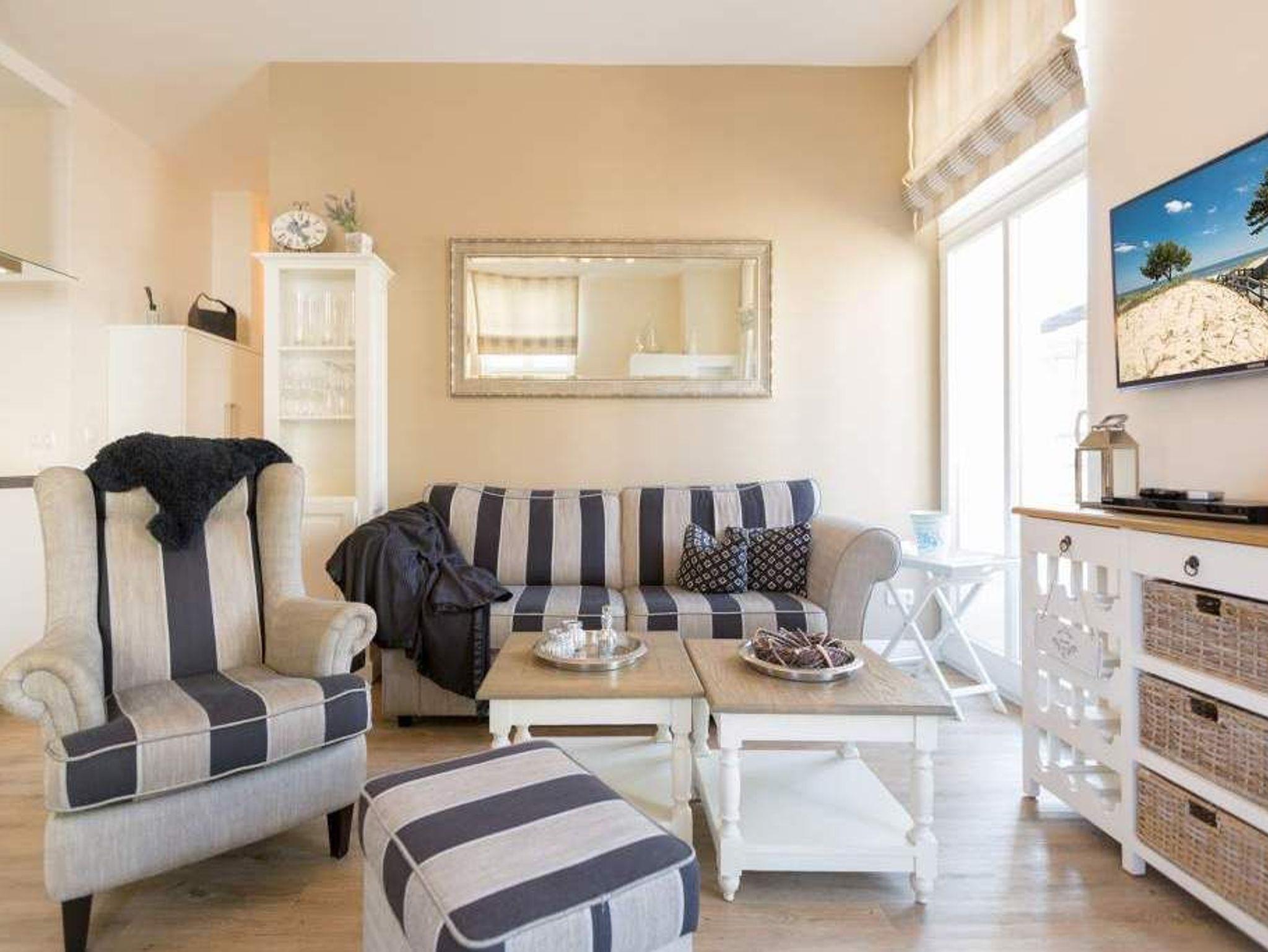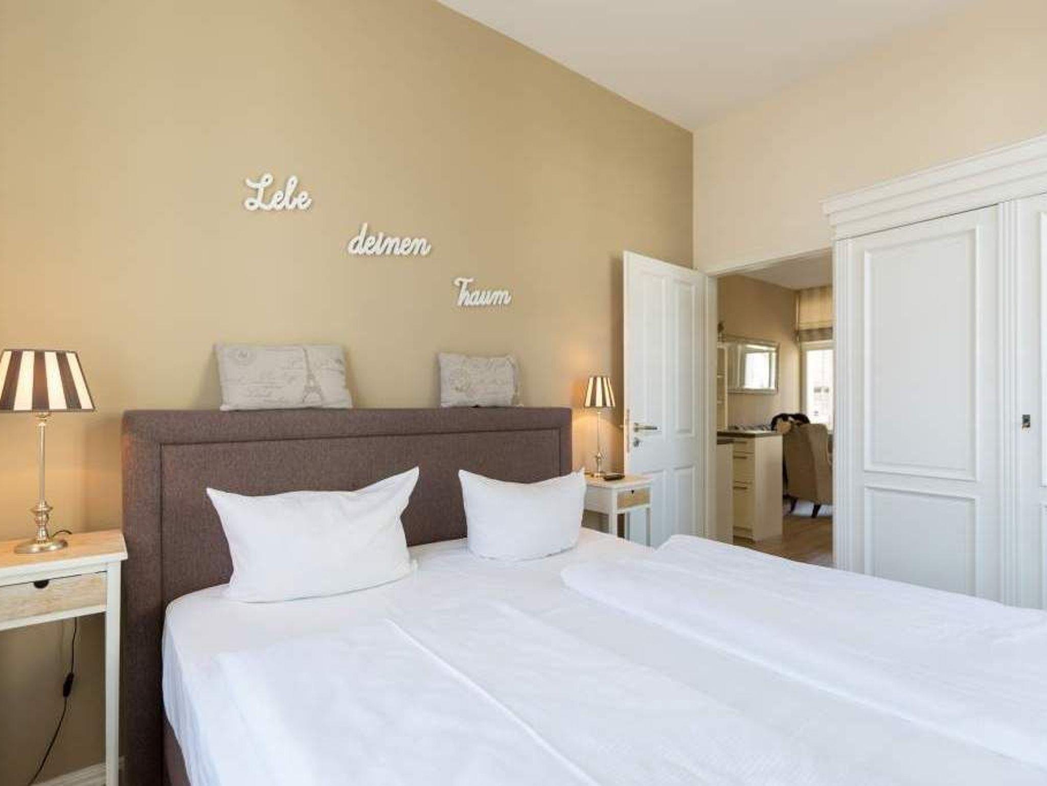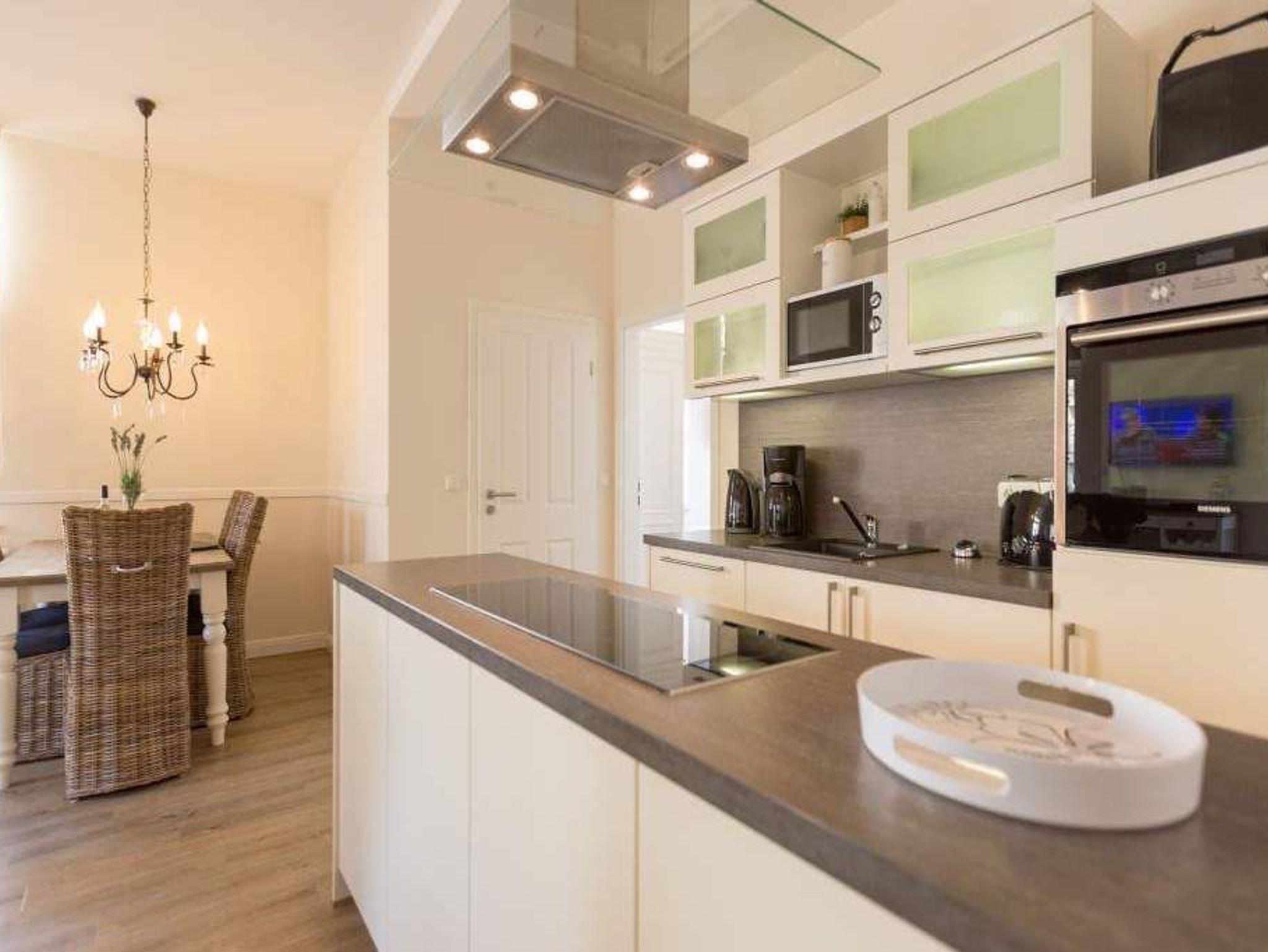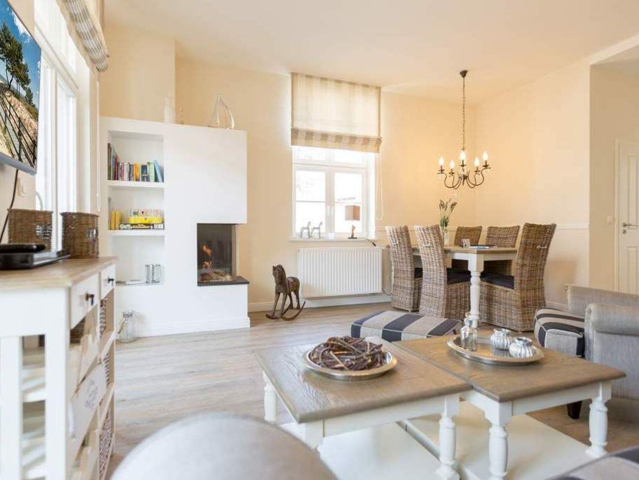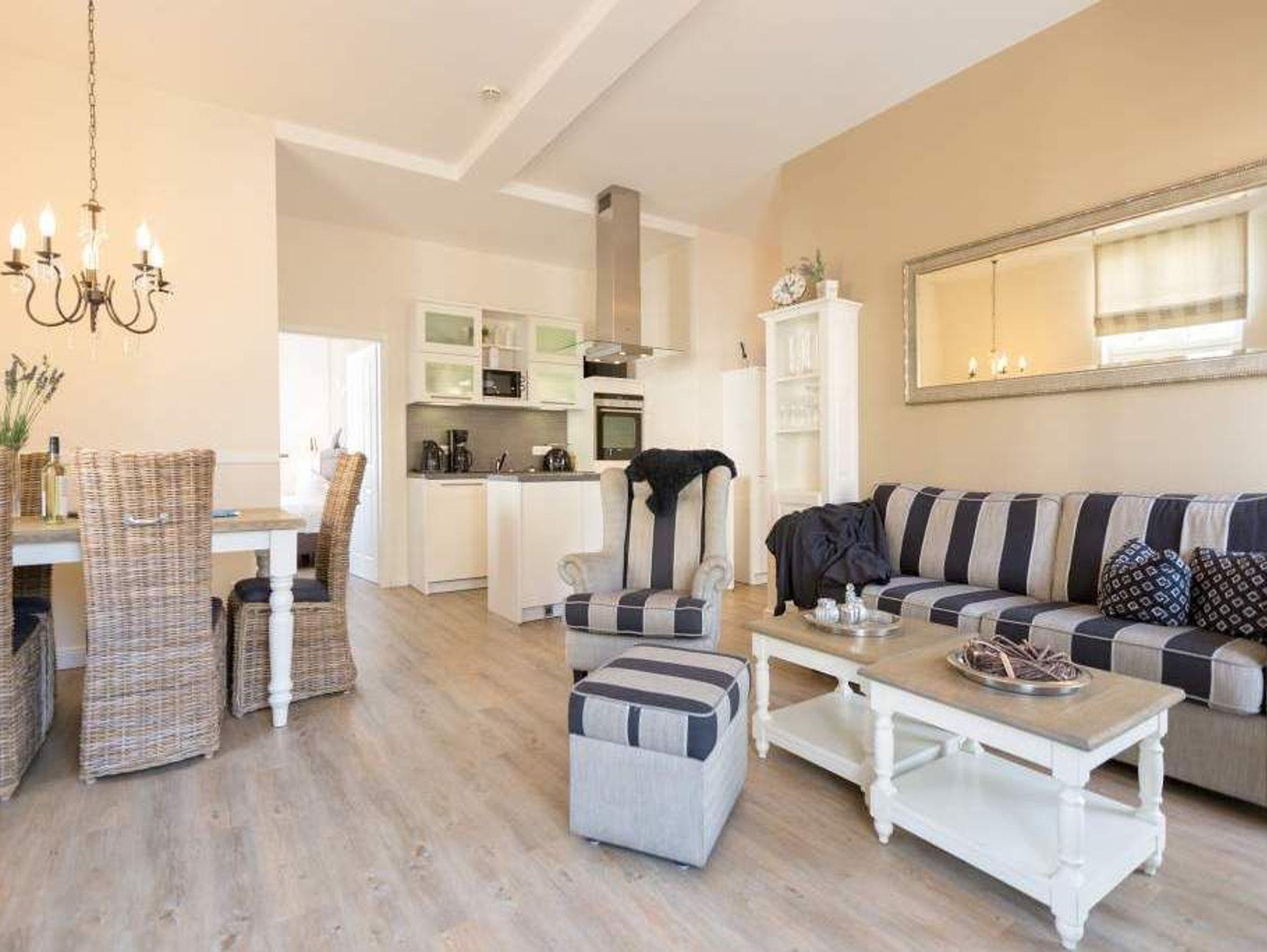 Zauberhafte Details [&] genug Platz für max. 4 Personen. In dieser charmanten 3-Raum-Ferienwohnung ( 70 qm) im ersten Geschoss der Villa trifft ein gekonnter Mix aus charmanten Landhausstil auf eine moderne Technikausstattung. Die Möblierung ist selbstverständlich äußerst geschmackvoll gewählt, der Wohnbereich mit Samsung-Smart-TV und Blue-Ray-Player bietet auch einen per Fernbedienung bedienbaren Gas-Designkamin. Ein Highlight besonders in der kalten Jahreszeit. Ergänzt wird der Raum durch die offene, komplett ausgestattete Küche (Induktionskochfeld) und den gemütlichen Essbereich. Auch die beiden Schlafzimmer mit Boxspringbetten ( 1,80 m) sind mit je einem Flat-TV ausgestattet. Für Ihren Komfort steht die Erstausstattung Wäsche für Sie bereit. Zusätzlich zum schönen Bad mit großem Waschtisch und Echtglasdusche gibt es ein Gäste-WC. Wer keine Lust auf Strand hat, macht es sich auf dem sonnigen Südbalkon gemütlich. Das WLAN-Netz im Haus kann kostenfrei genutzt werden. Für den Tag am Meer steht Ihnen als besonderes Bonbon von Mitte Mai bis Ende September (je nach Witterung) ein Strandkorb am Strand kostenlos zur Verfügung.