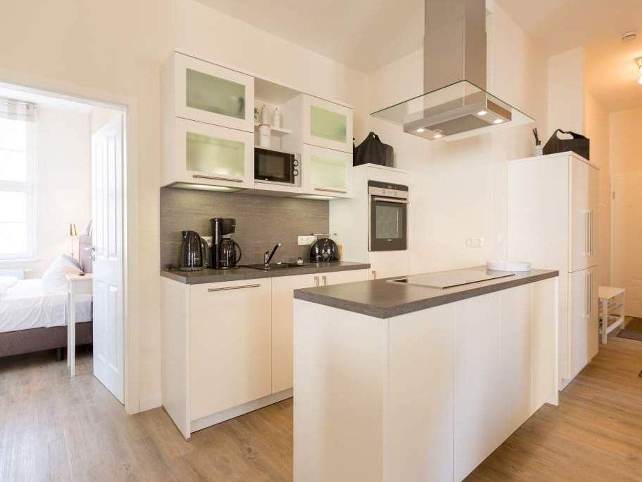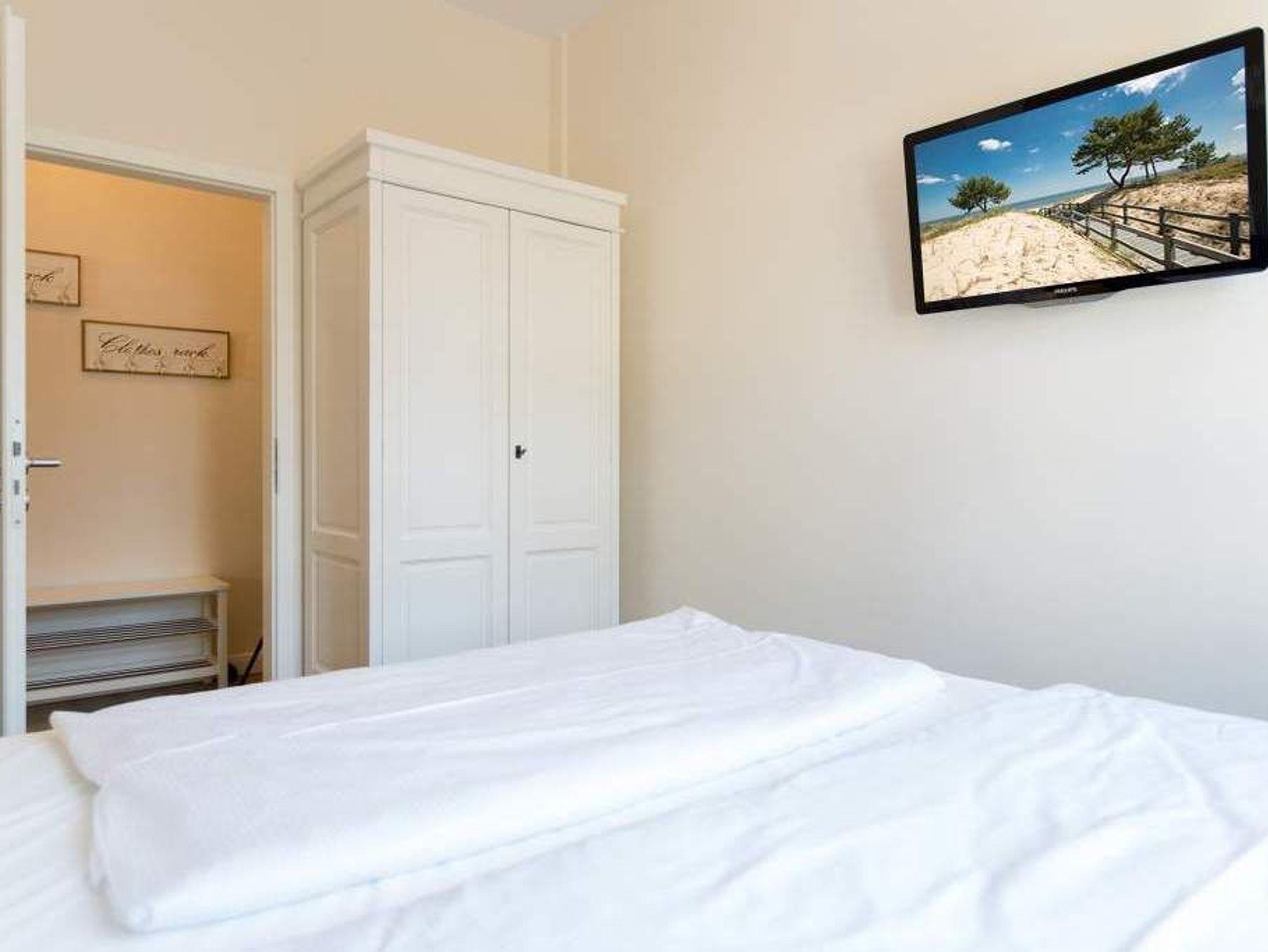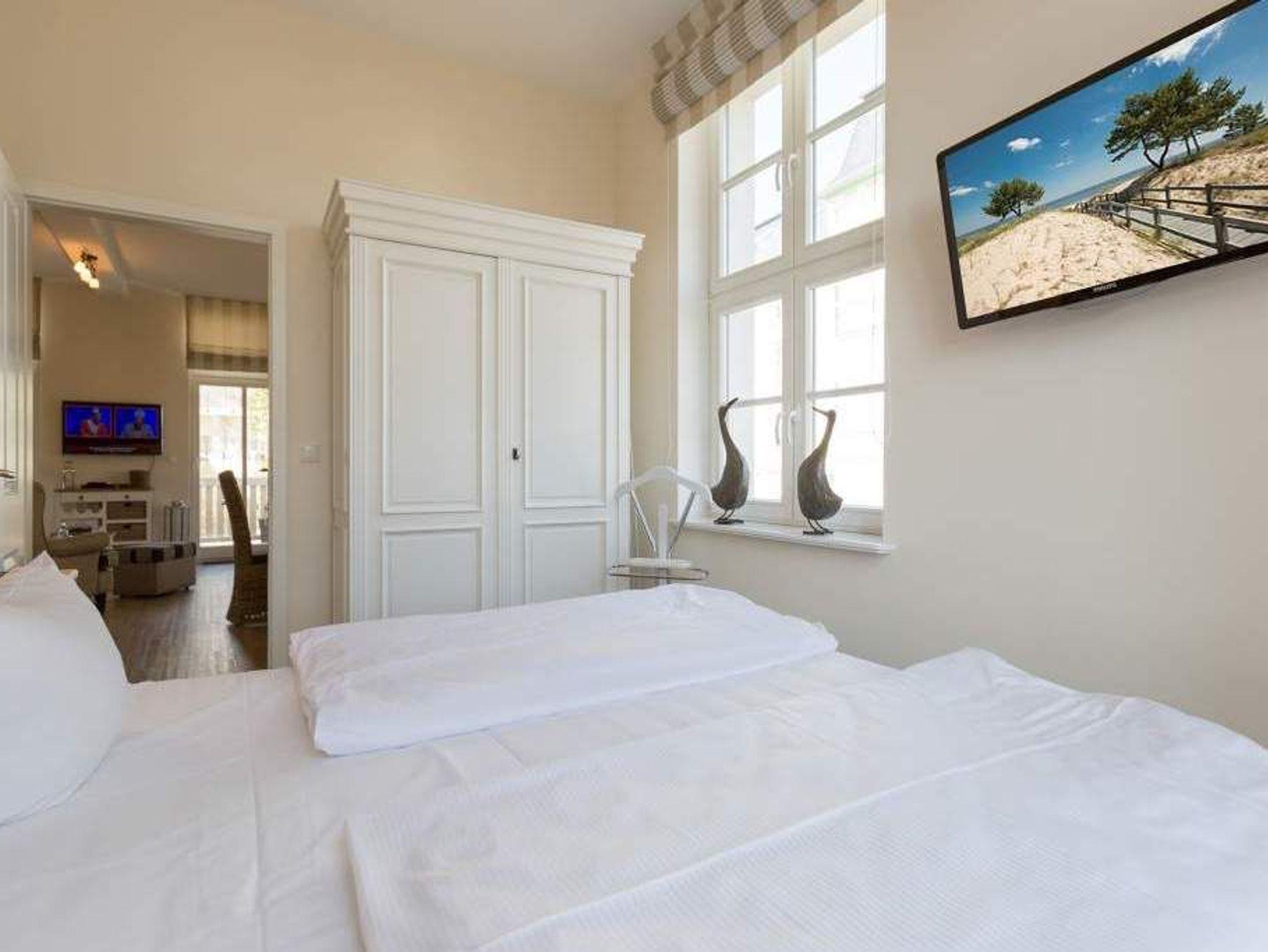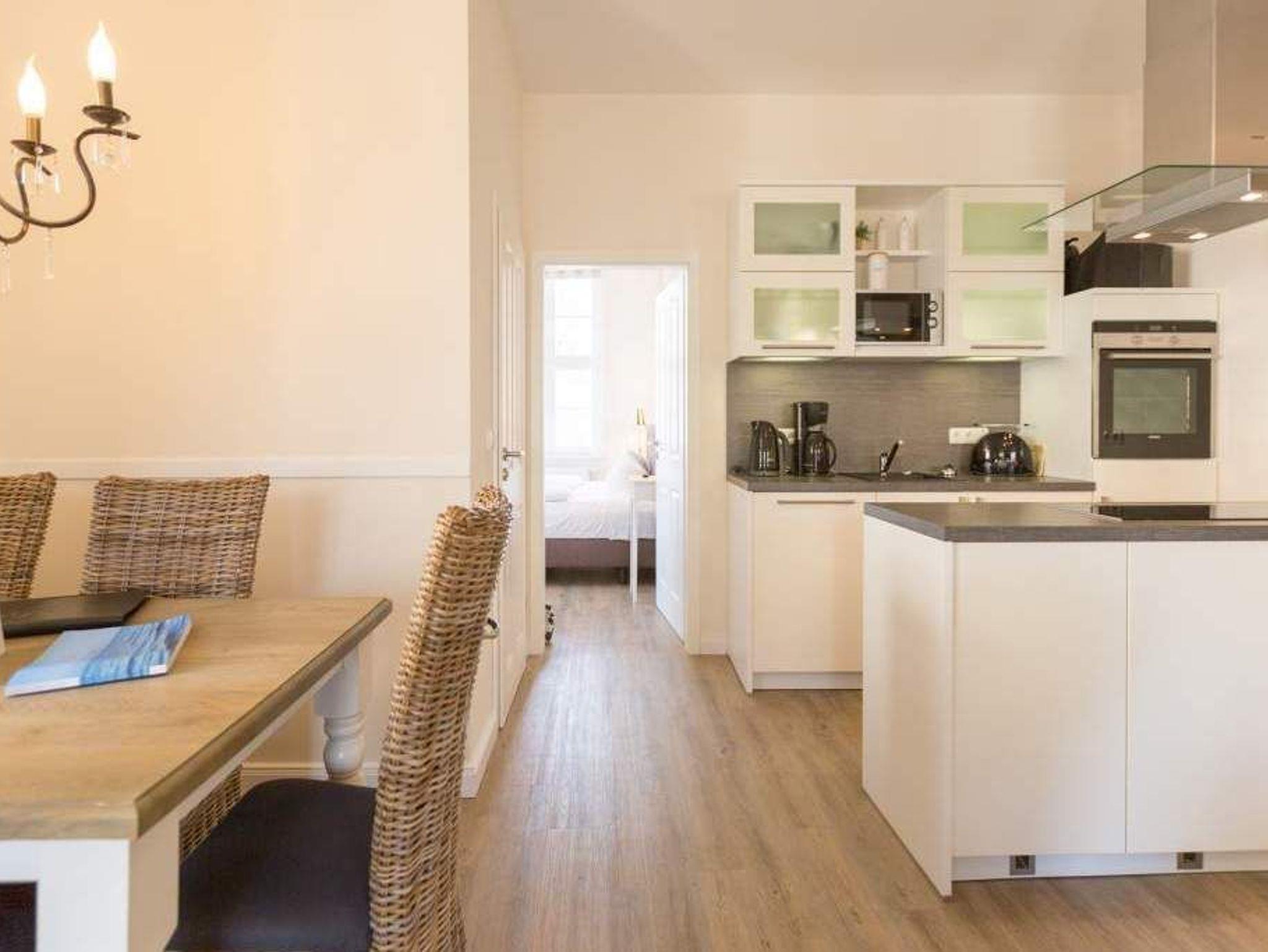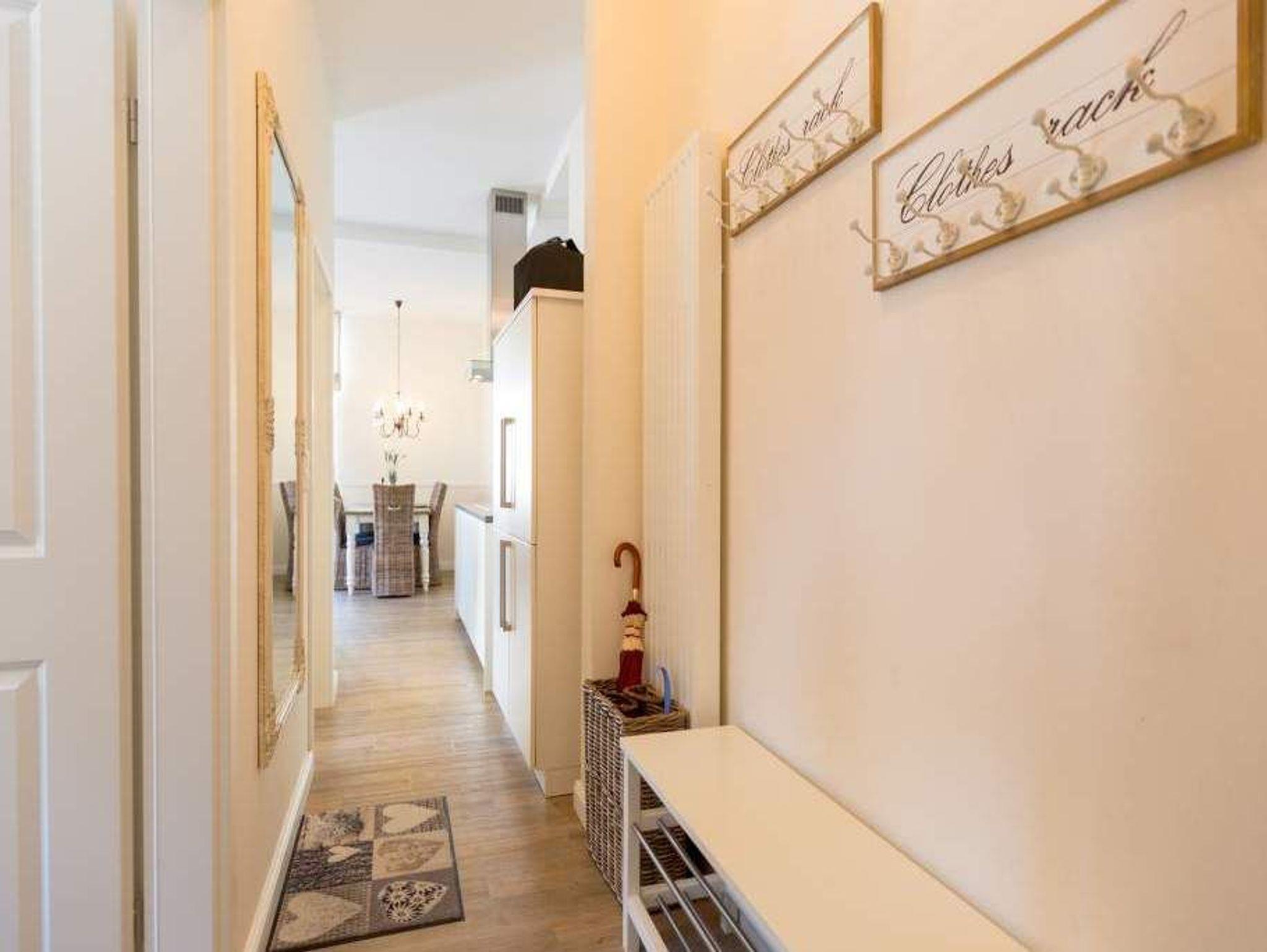 Zauberhafte Details [&] genug Platz für max. 4 Personen. In dieser charmanten 3-Raum-Ferienwohnung ( 70 qm) im ersten Geschoss der Villa trifft ein gekonnter Mix aus charmanten Landhausstil auf eine moderne Technikausstattung. Die Möblierung ist selbstverständlich äußerst geschmackvoll gewählt, der Wohnbereich mit Samsung-Smart-TV und Blue-Ray-Player bietet auch einen per Fernbedienung bedienbaren Gas-Designkamin. Ein Highlight besonders in der kalten Jahreszeit. Ergänzt wird der Raum durch die offene, komplett ausgestattete Küche (Induktionskochfeld) und den gemütlichen Essbereich. Auch die beiden Schlafzimmer mit Boxspringbetten ( 1,80 m) sind mit je einem Flat-TV ausgestattet. Für Ihren Komfort steht die Erstausstattung Wäsche für Sie bereit. Zusätzlich zum schönen Bad mit großem Waschtisch und Echtglasdusche gibt es ein Gäste-WC. Wer keine Lust auf Strand hat, macht es sich auf dem sonnigen Südbalkon gemütlich. Das WLAN-Netz im Haus kann kostenfrei genutzt werden. Für den Tag am Meer steht Ihnen als besonderes Bonbon von Mitte Mai bis Ende September (je nach Witterung) ein Strandkorb am Strand kostenlos zur Verfügung.