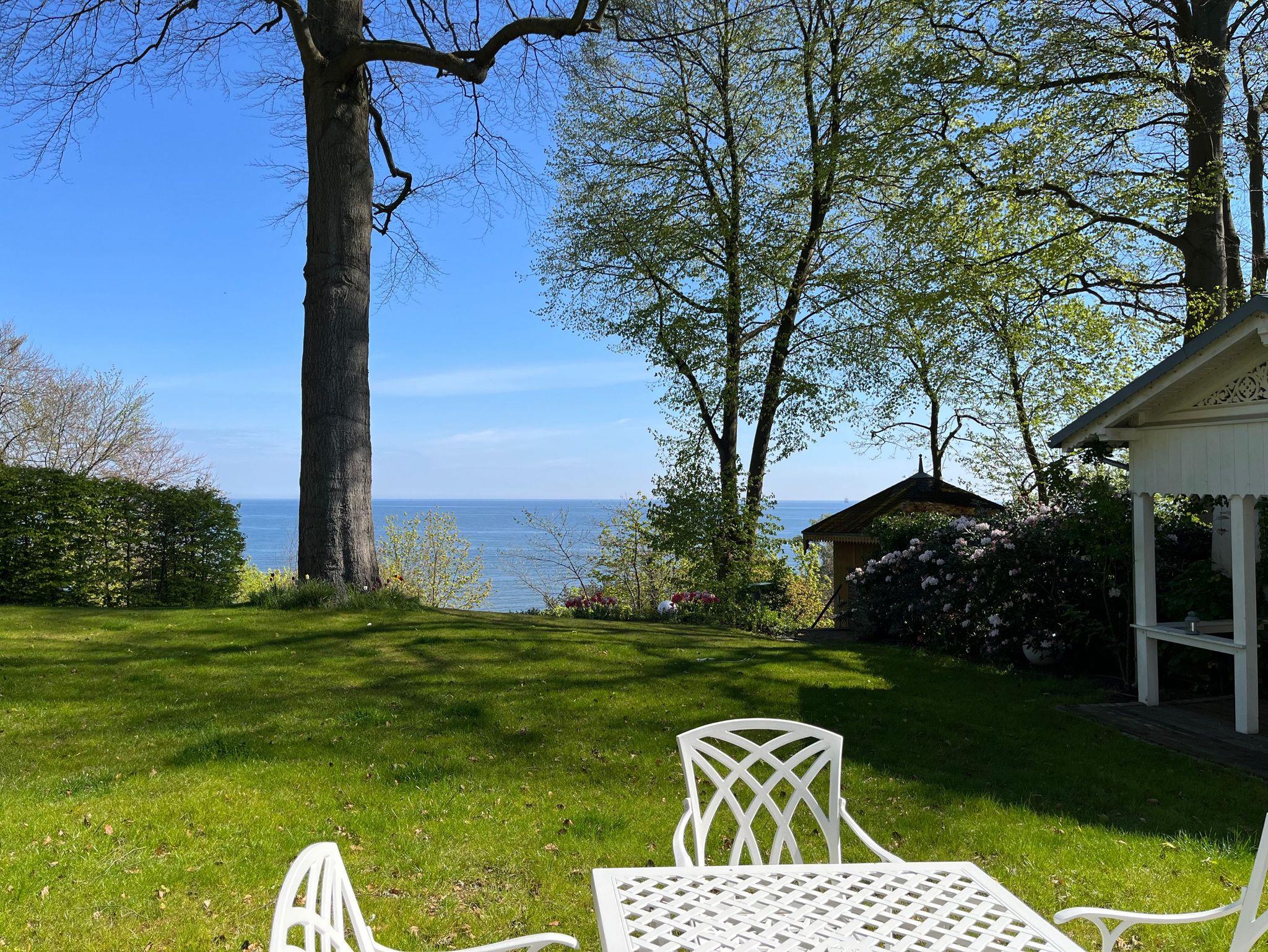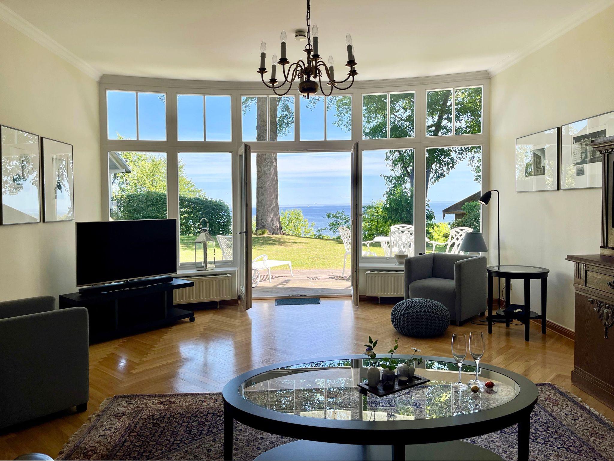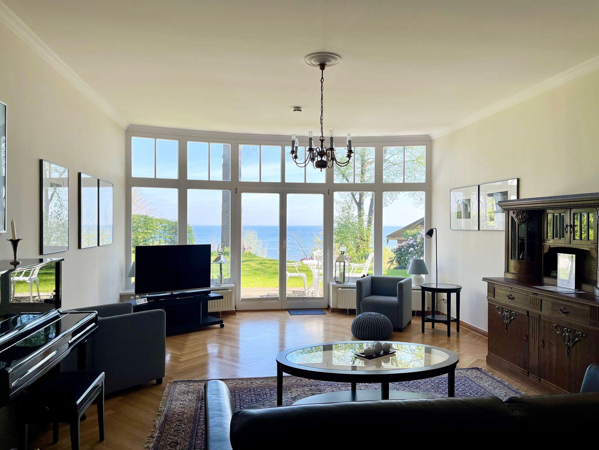 Durch die großen Fensterfassaden dieser ca. 85 qm großen Wohnung geht der Innen- in den Außenraum über und bietet Weite und Aufenthaltsqualität. Der Blick geht über den gepflegten Garten hin zur Ostsee und ist zu jeder Jahreszeit beeindruckend. Im Sommer das satte Grün der Bäume und das herrliche Blau des Meeres, mit Schiffen am Horizont, mit Möwengeschrei und dem vom Strand herauf wehenden Lachen der Badenden. Und bei all dem ist man ganz für sich und kann erholsam die Seele baumeln lassen. Als besonderes Ausstattungsmerkmal dieser Wohnung ist das Klavier hervorzuheben.
