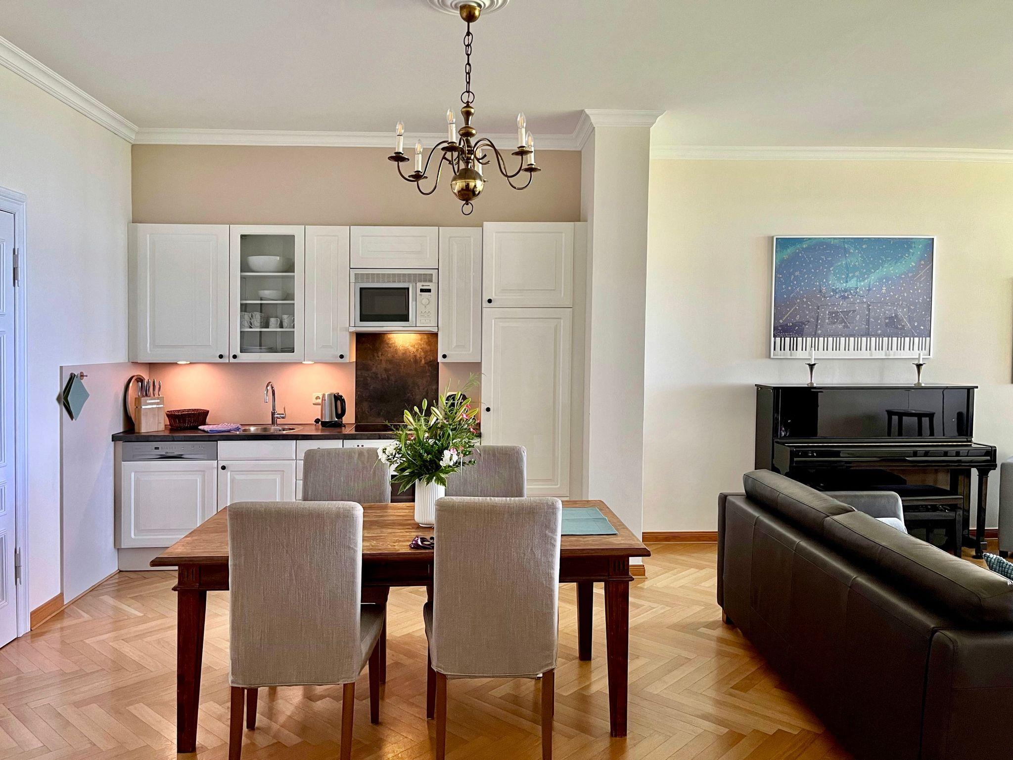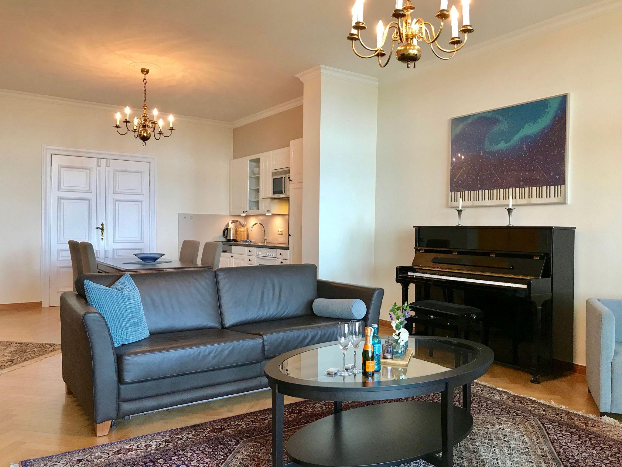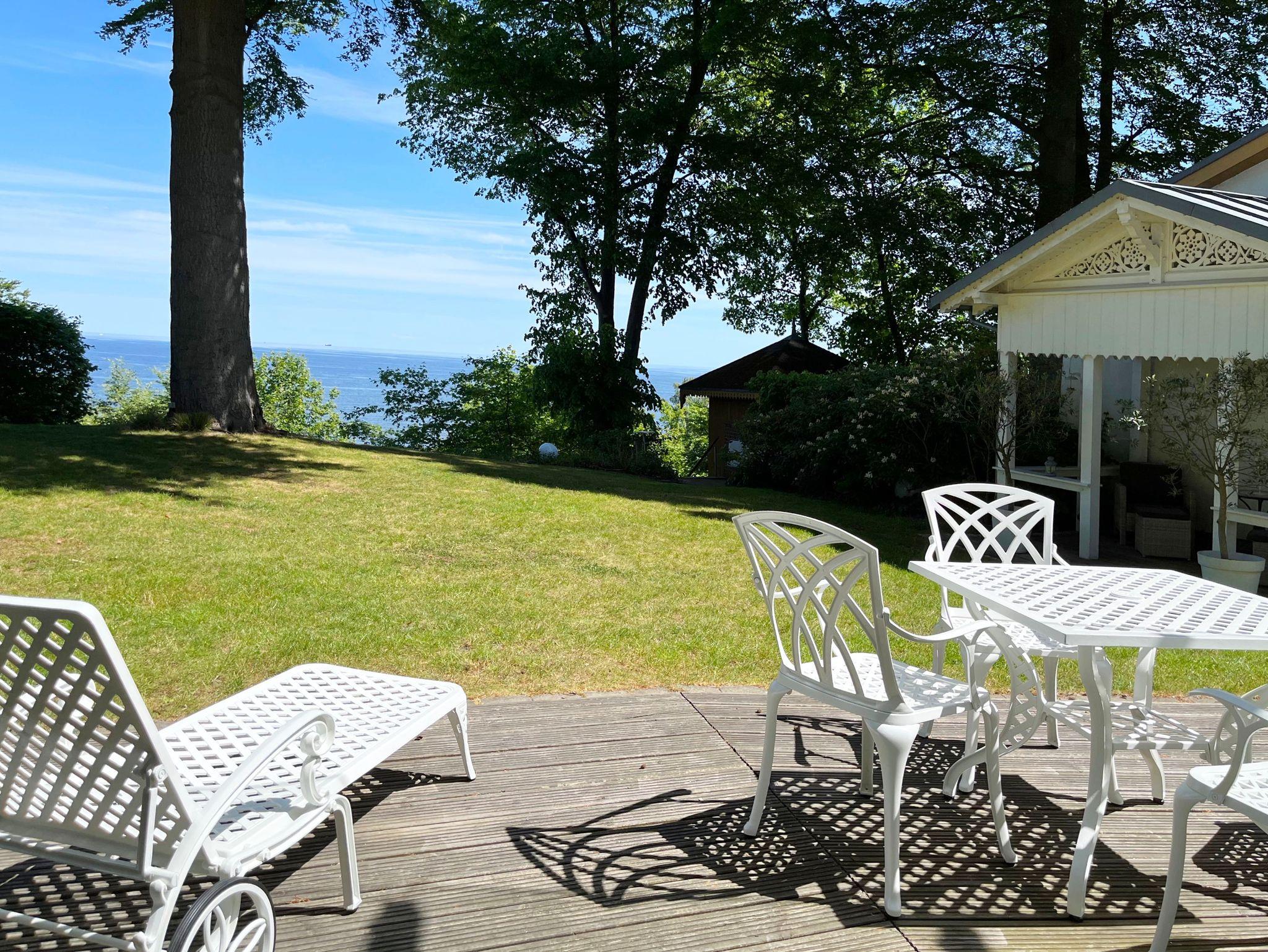 Durch die großen Fensterfassaden dieser ca. 85 qm großen Wohnung geht der Innen- in den Außenraum über und bietet Weite und Aufenthaltsqualität. Der Blick geht über den gepflegten Garten hin zur Ostsee und ist zu jeder Jahreszeit beeindruckend. Im Sommer das satte Grün der Bäume und das herrliche Blau des Meeres, mit Schiffen am Horizont, mit Möwengeschrei und dem vom Strand herauf wehenden Lachen der Badenden. Und bei all dem ist man ganz für sich und kann erholsam die Seele baumeln lassen. Als besonderes Ausstattungsmerkmal dieser Wohnung ist das Klavier hervorzuheben.
