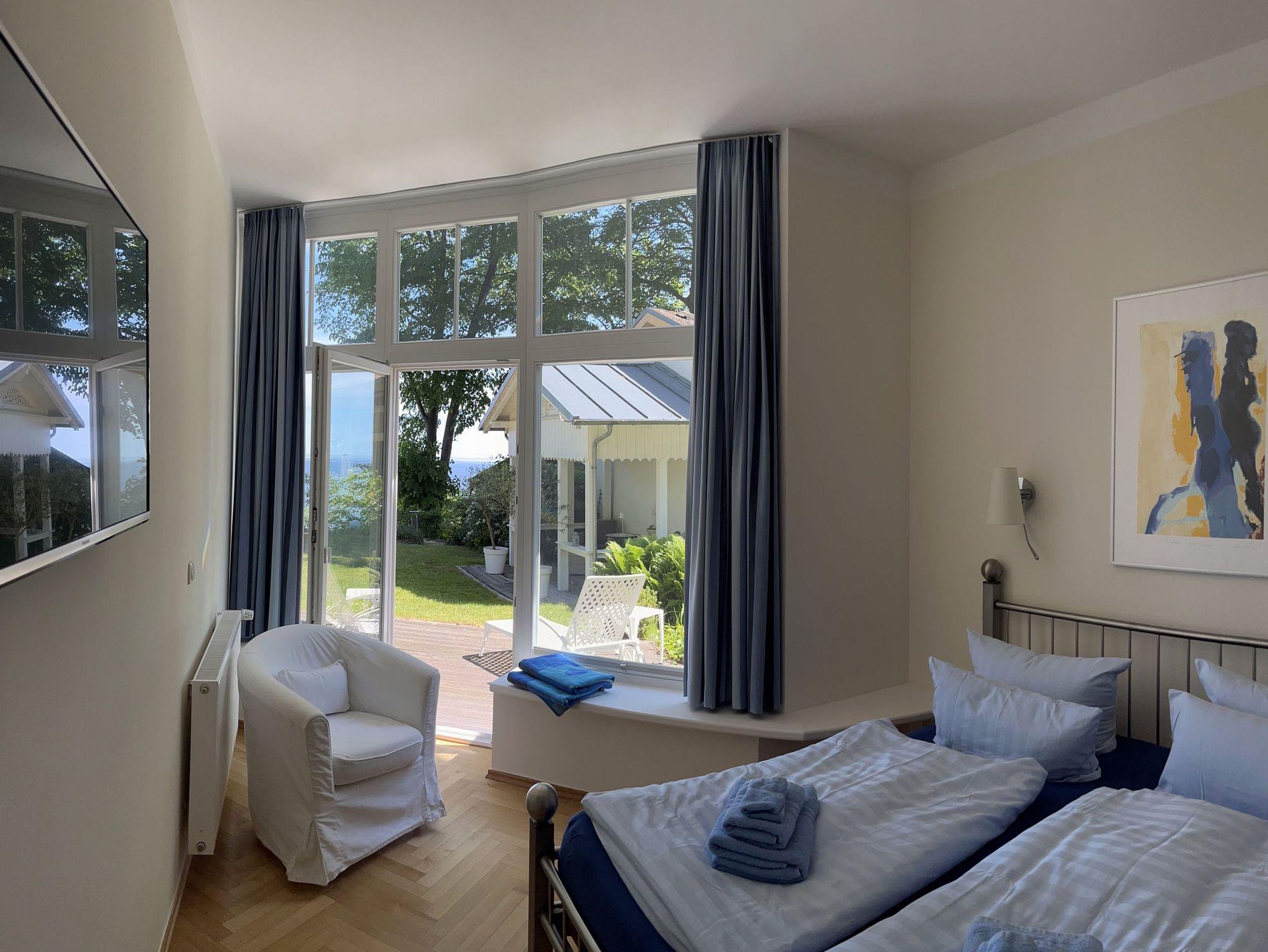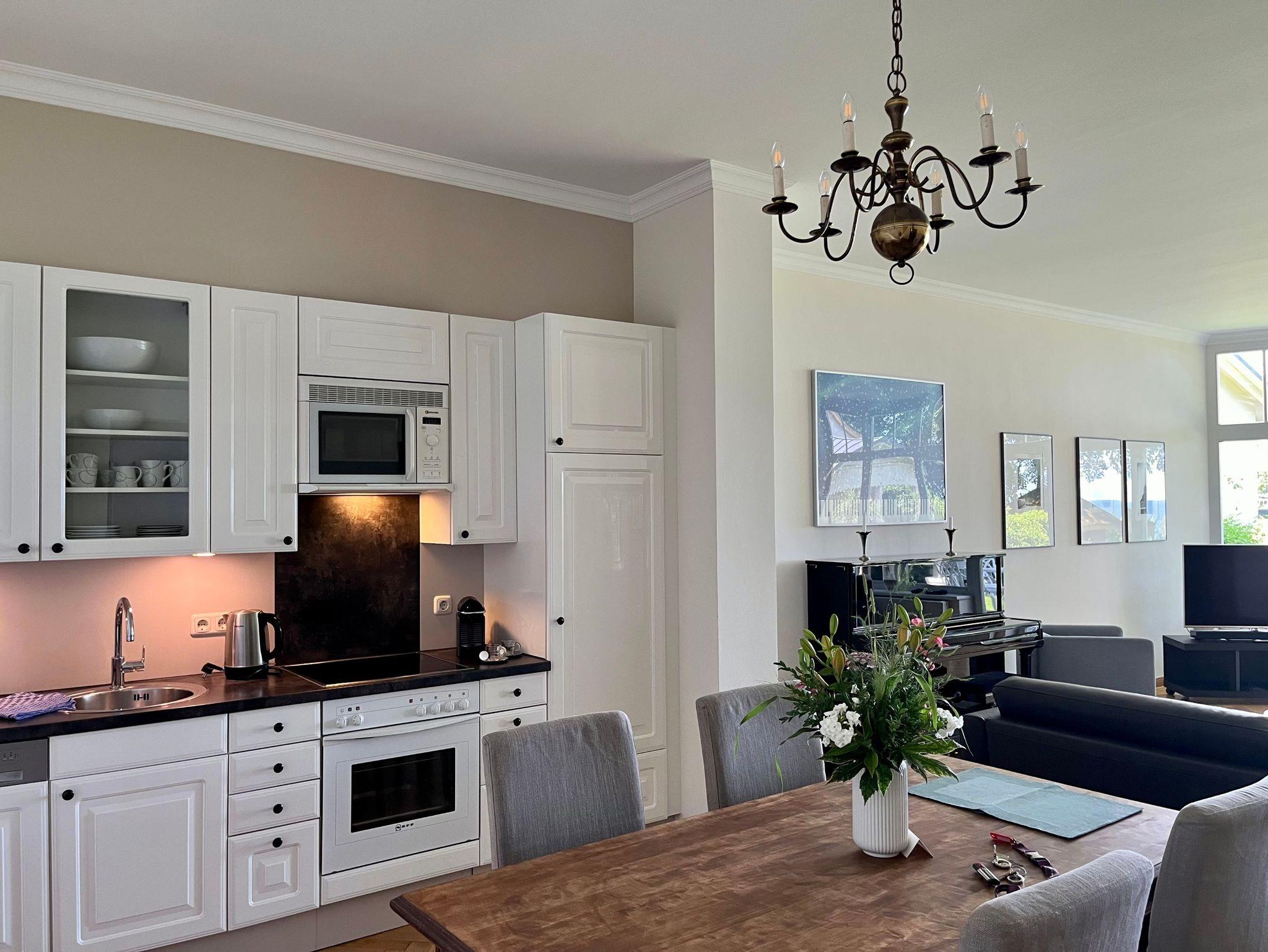 Komfortable Ferienwohnung mit Meerblick aus dem Wohn- und Schlafzimmer. Von der großzügigen Terrasse mit Liegestühlen und Essplatz genießen Sie einen herrlichen Blick auf die Ostsee. All unsere Wohnungen sind geschmackvoll und individuell eingerichtet. Das Schlafzimmer ist mit einem manufakturgefertigten Edelstahlbett, Einbauschrank incl. Safe, Flachbild-TV und Verdunklung ausgestattet, die Terrassentür ist mit Insektenschutz versehen. Ausgesuchte Möbelstücke und Bilder des Braunschweiger Künstlers Achim Kiel, Echtholz-Parkett - teils mit hochwertigen Teppichen belegt ? prägen den Stil des Hauses. Als zusätzliche Schlafgelegenheit befindet sich im Wohnbereich eine komfortable ausklappbare Ledercouch. Zur Ausstattung gehört ein Smart-TV mit Soundbar - zur einfachen Verbindung mit Ihrem Smartphone, iPad oder anderen bluetoothfähigen Geräten - sowie ein DVD-Player. In den Wohn-/Essbereich integriert ist ein Tisch für vier Personen und eine komplett ausgestattete Küchenzeile (Kühlschrank mit Gefrierfach, Backofen, Cerankochfeld, Dunstabzug, Mikrowelle, Toaster, Wasserkocher, Filter-Kaffeemaschine u. Nespresso-Kapselmaschine, Rührgerät etc.). Das Badezimmer ist ein Tageslicht-Bad mit Dusche.