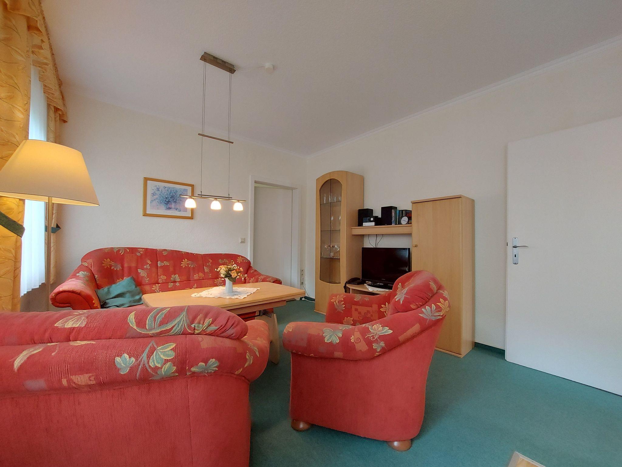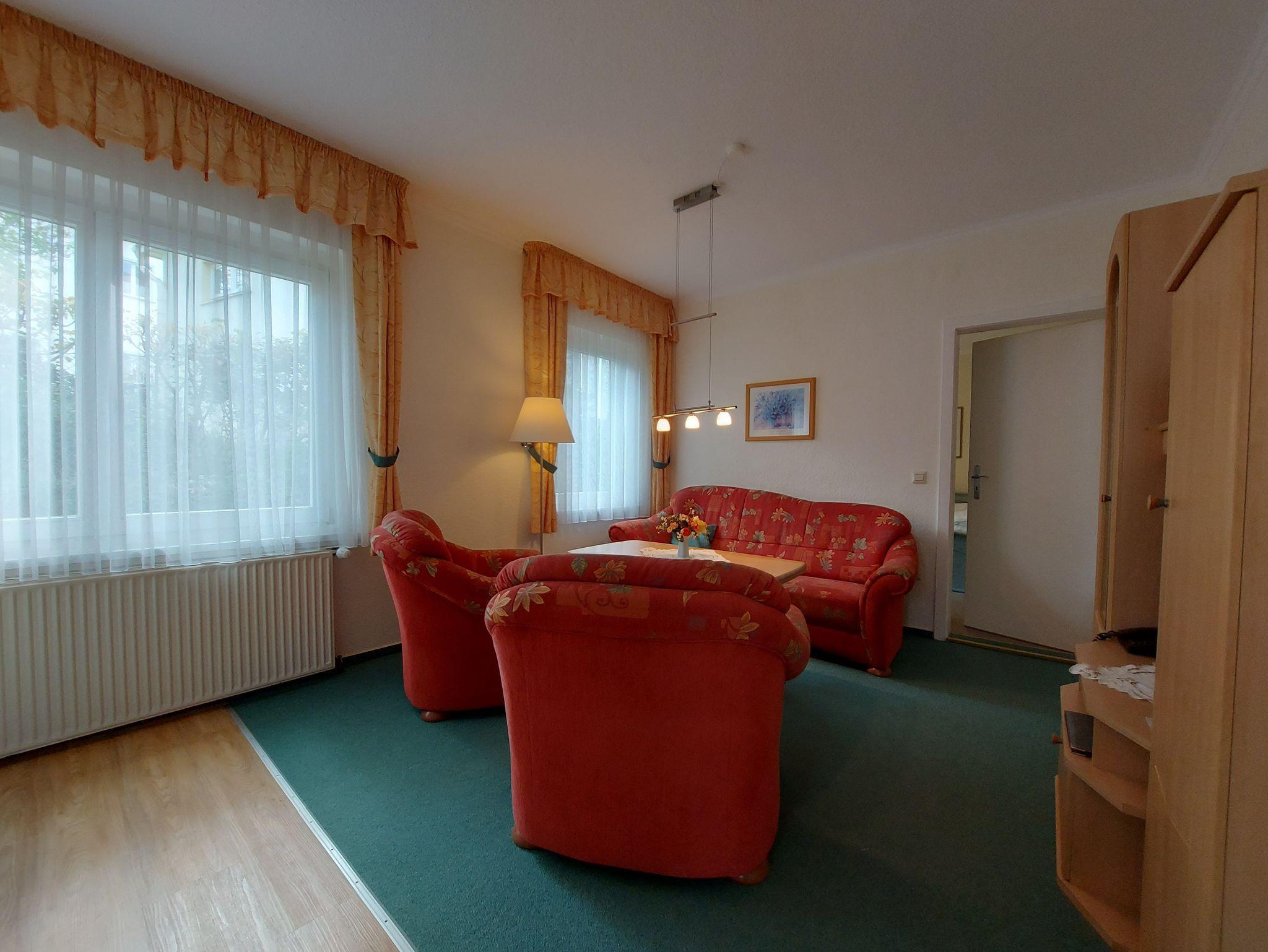 Die Ferienwohnung 1 befindet sich im Erdgeschoss des Hauses im Anbau. Die Wohnung ist jedoch nicht stufenlos erreichbar. Sie teilt sich auf in ein Wohnzimmer mit offener Pantry-Küche und Sitzbereich. Im Wohnzimmer befindet sich eine gemütliche Couch, ein Sessel und ein Flachbildfernseher. Der Sitzbereich dient auch als Essbereich mit einem höhenverstellbaren Tisch. Die Pantry-Küche ist ausgestattet mit 2-Platten-Herd, Kühlschrank mit Gefriermöglichkeit, Mikrowelle, Kaffeemaschine, Wasserkocher und Toaster.