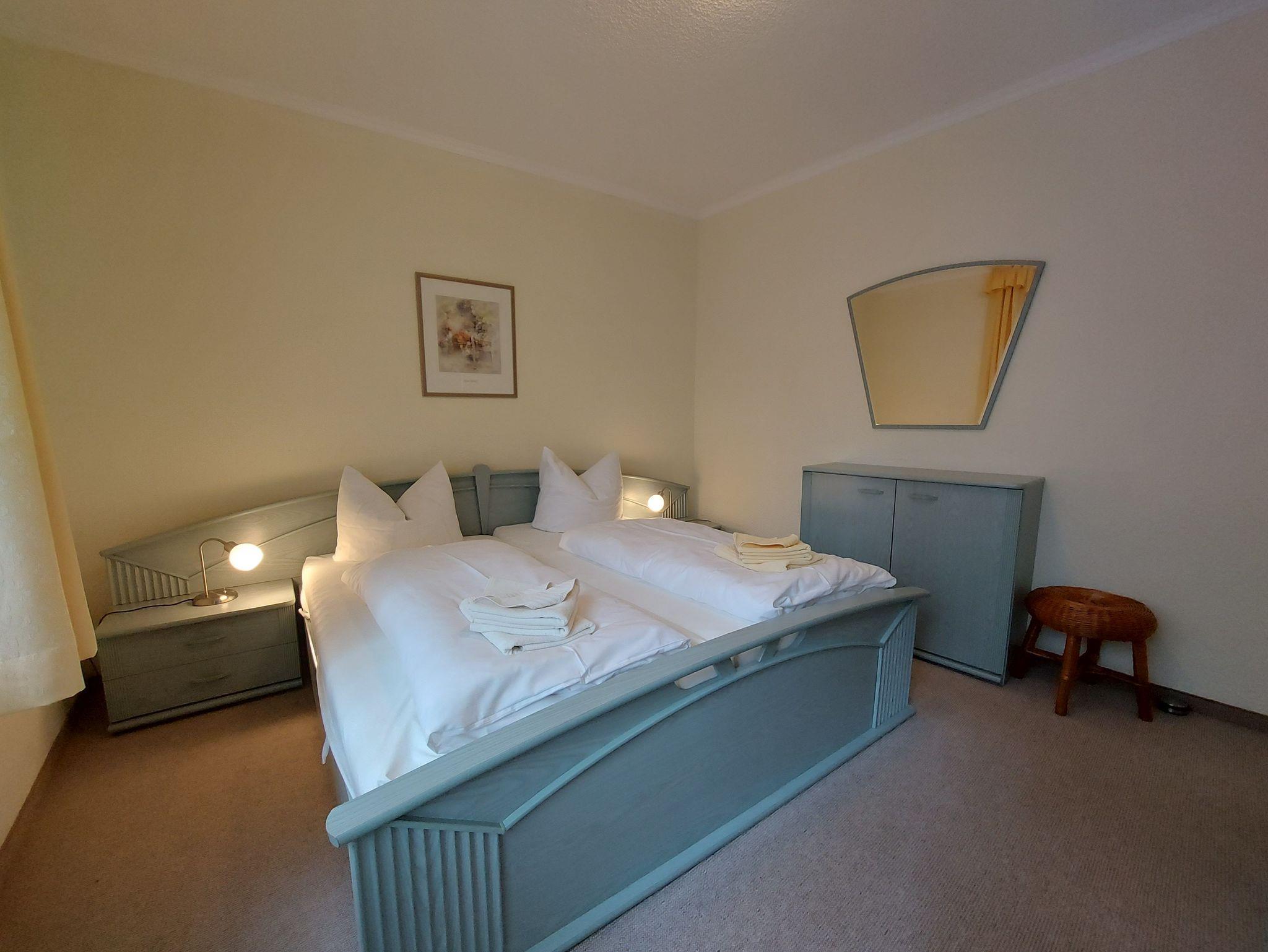 Das separate Schlafzimmer ist mit einem gemütlichen Doppelbett, Kleiderschrank und Kommode ausgestattet. Das Badezimmer verfügt über eine Dusche.