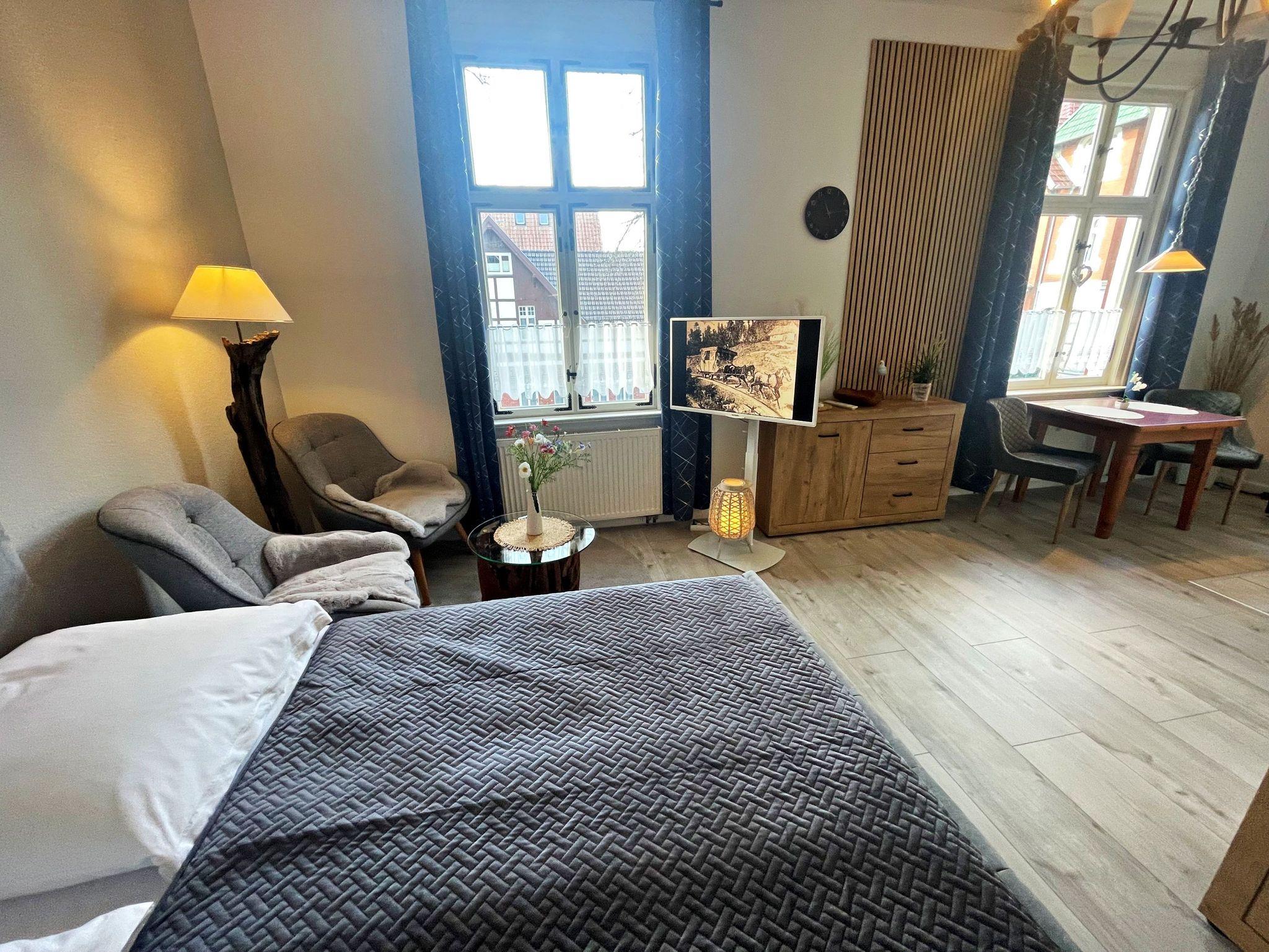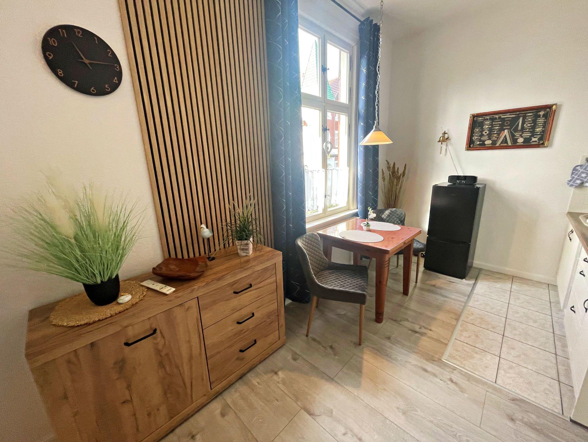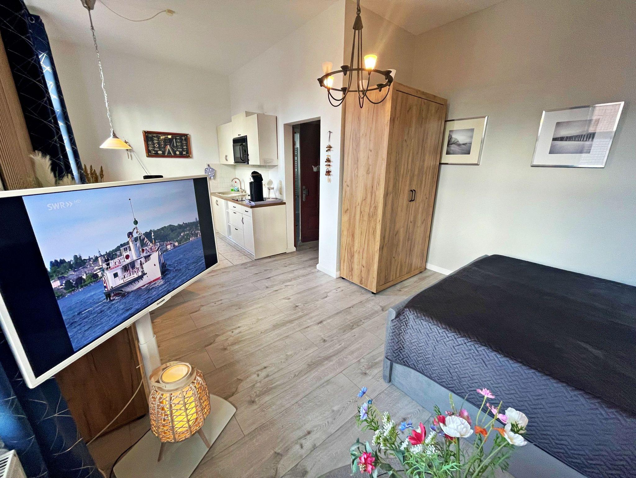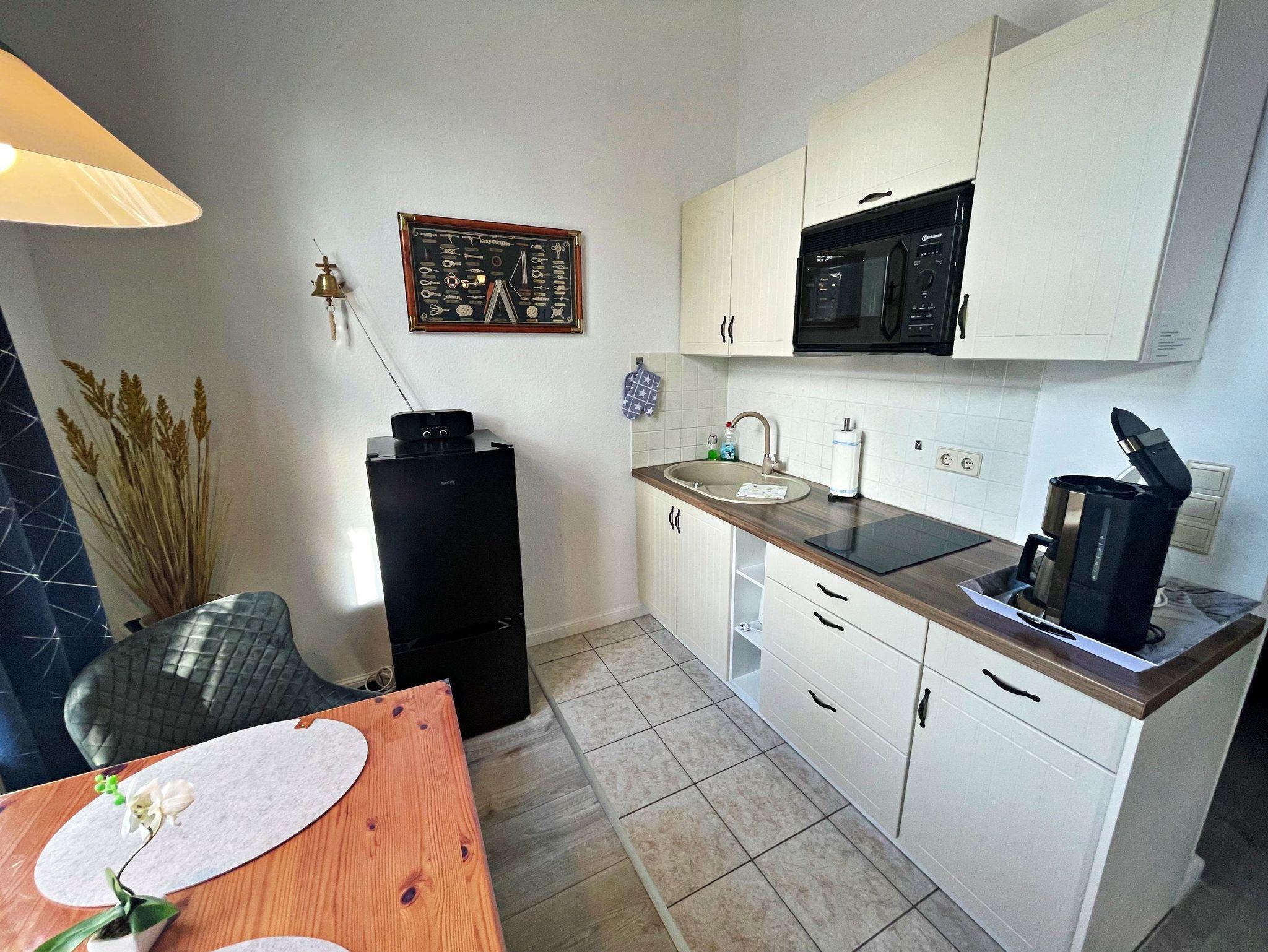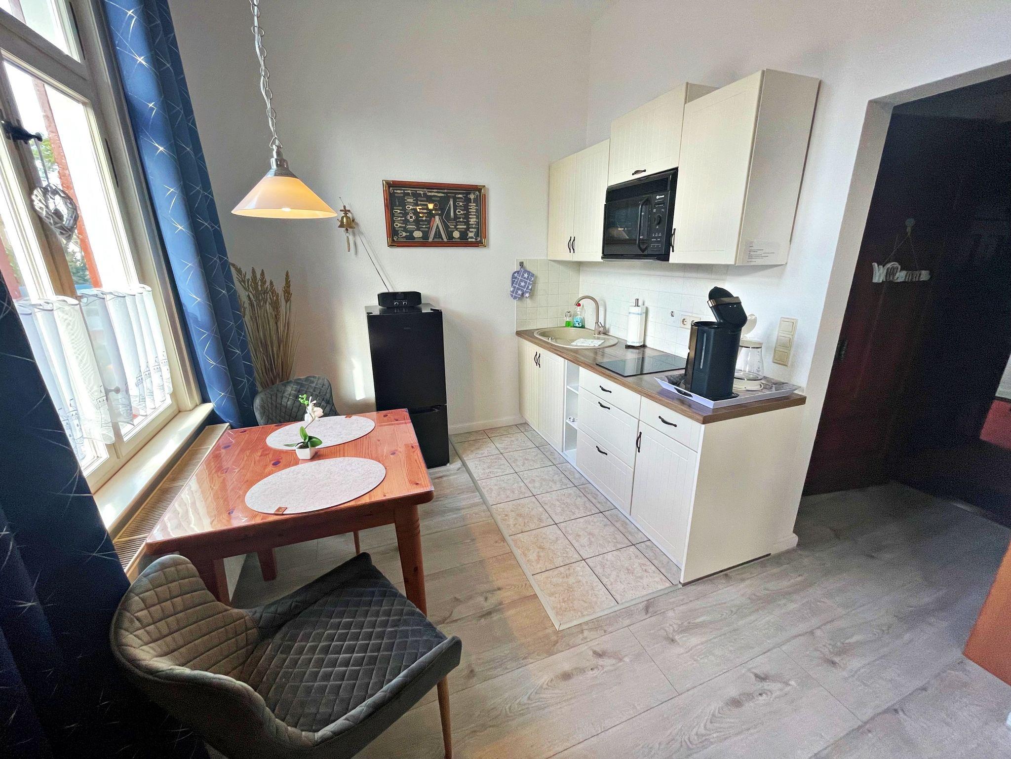 Diese charmante Unterkunft im Obergeschoss auf der rechten Seite bietet auf 34 m² ausreichend Platz für bis zu 2 Personen, um einen entspannten und erholsamen Urlaub zu genießen. Der kombinierte Wohn- und Schlafbereich ist gemütlich eingerichtet und verfügt über ein komfortables Doppelbett (1,60 x 2,00 m), Flachbild-TV sowie einen einladenden Essbereich mit 2 Stühlen. Die praktische Küchenzeile ist mit einem 2-Platten-Herd, Kühlschrank, Mikrowelle, Wasserkocher und Kaffeemaschine ausgestattet, sodass Sie sich ganz wie zu Hause fühlen können. Das Badezimmer ist mit einer Dusche und WC ausgestattet und bietet Ihnen alles, was Sie für Ihren Aufenthalt benötigen. Genießen Sie den kleinen Balkon mit Meerblick, der über den Hausflur erreichbar ist - der perfekte Ort, um den Tag ausklingen zu lassen. Für Ihr Fahrzeug steht ein Pkw-Stellplatz auf dem umzäunten Grundstück zur Verfügung. Zudem können Sie gegen Entgelt eine Waschmaschine sowie einen Wäschetrockner im Objekt nutzen. WLAN-Zugang ist für ein Gerät kostenfrei, für jedes weitere Gerät werden 10 € pro Woche berechnet.
