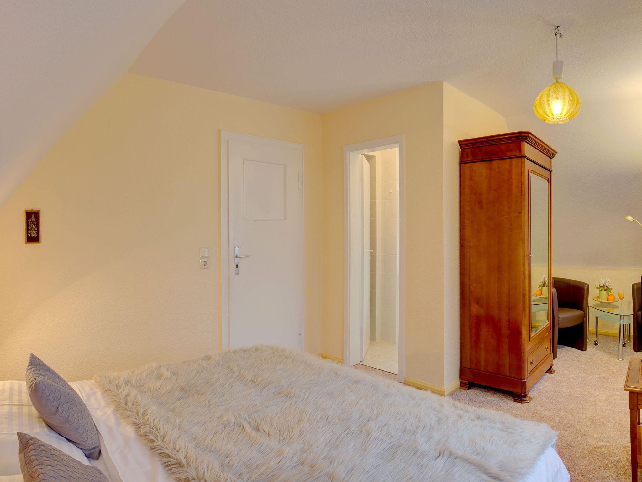 Über eine Treppe gelangen Sie in den oberen Bereich des Hauses, der aufgrund seiner Möblierung und zwei abschließbaren Türen wie ein separates kleines Appartement betrachtet werden kann. Links befindet sich ein Flur mit kleiner Pantryküche (kleine Ausstattung an Geschirr, Gläsern, Kühlschrank, Wasserkocher, Toaster, Kaffeemaschine, Kombigerät bestehend aus 2-Platten-Kochfeld mit Backfunktion), die während die Liebsten im Hochparterre noch schlummern zum ungestörten ersten Frühstückskaffee einlädt. Vom Flur ebenfalls abgehend befindet sich ein separates WC. Das Wohnzimmer verfügt über gemütliche Sitzmöbel, Flat-TV, einem angrenzendem Schlafzimmer mit Doppelbett (180 x 200cm / zwei getrennte Matratzen) sowie über ein Bad mit Dusche. Rechts befindet sich ein weiteres separates Schlafzimmer mit Doppelbett (180 x 200cm / zwei getrennte Matratzen) und Leseecke, Bad en Suite mit Dusche, WC und einem Haartrockner.