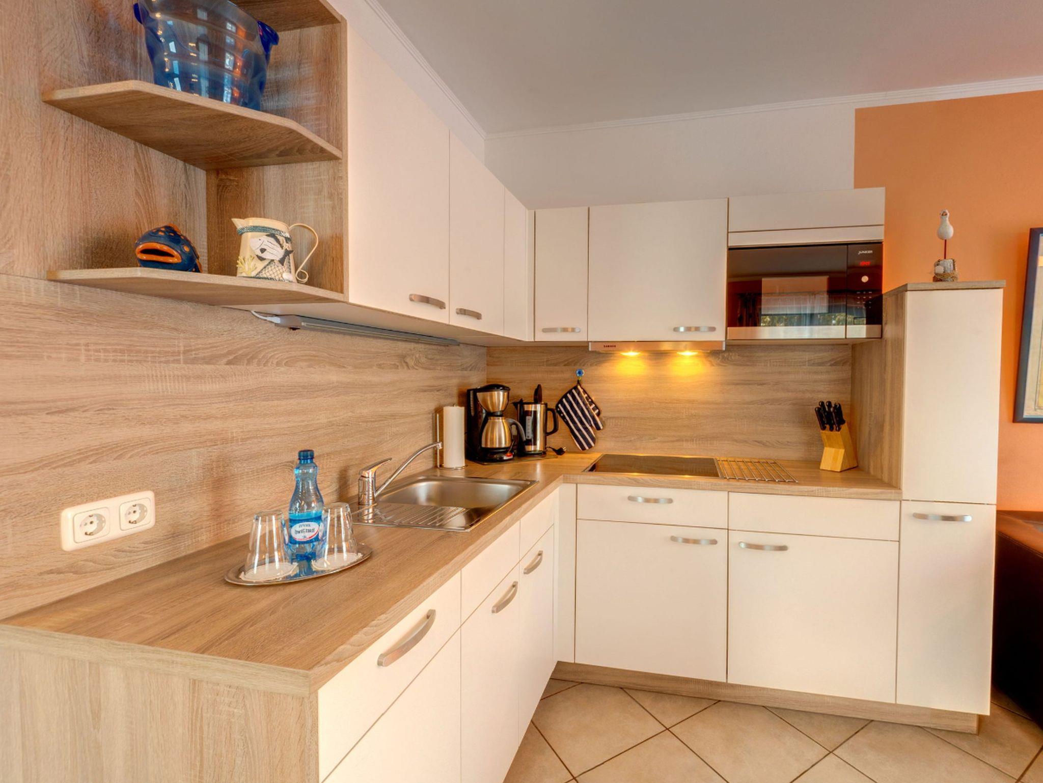 Der große Wohnbereich ist das Herzstück der Wohnung. Hier finden Sie einen einladenden Esstisch, sowie ein bequemes Sofa, welches als zusätzliche Aufbettung dienen kann. Ein Flat-TV sorgt für Unterhaltung an gemütlichen Abenden, während die Musikanlage für die passende musikalische Untermalung sorgt. Die offene Küche ist modern und funktional gestaltet. Sie ist mit einem Kühlschrank ausgestattet, der genügend Platz für Ihre Lebensmittel bietet. Eine Spülmaschine erleichtert Ihnen die Reinigung nach dem Kochen, während Wasserkocher, Mikrowelle und Kaffeemaschine dafür sorgen, dass Sie jederzeit schnell und unkompliziert Ihre Lieblingsgetränke zubereiten können.