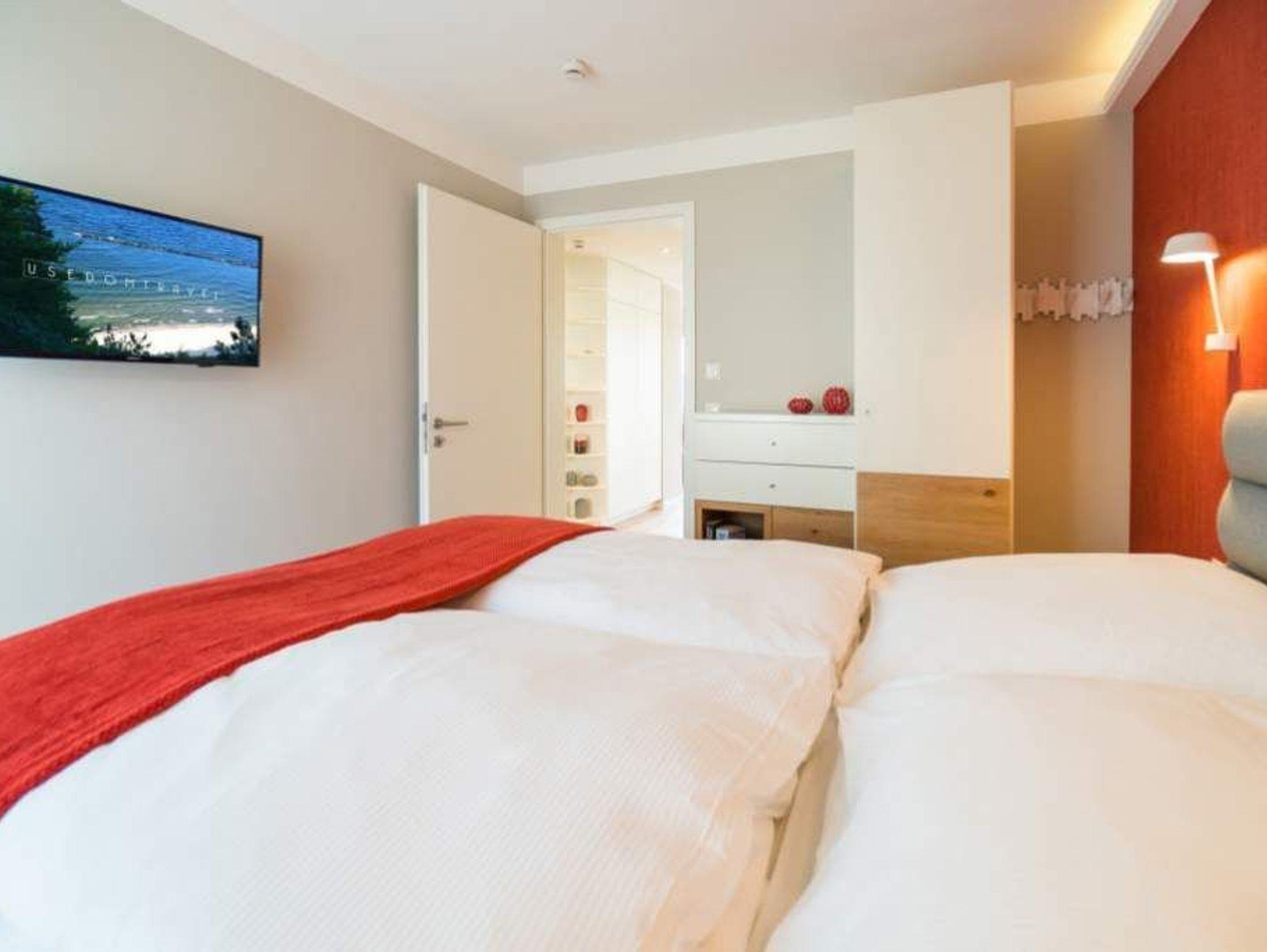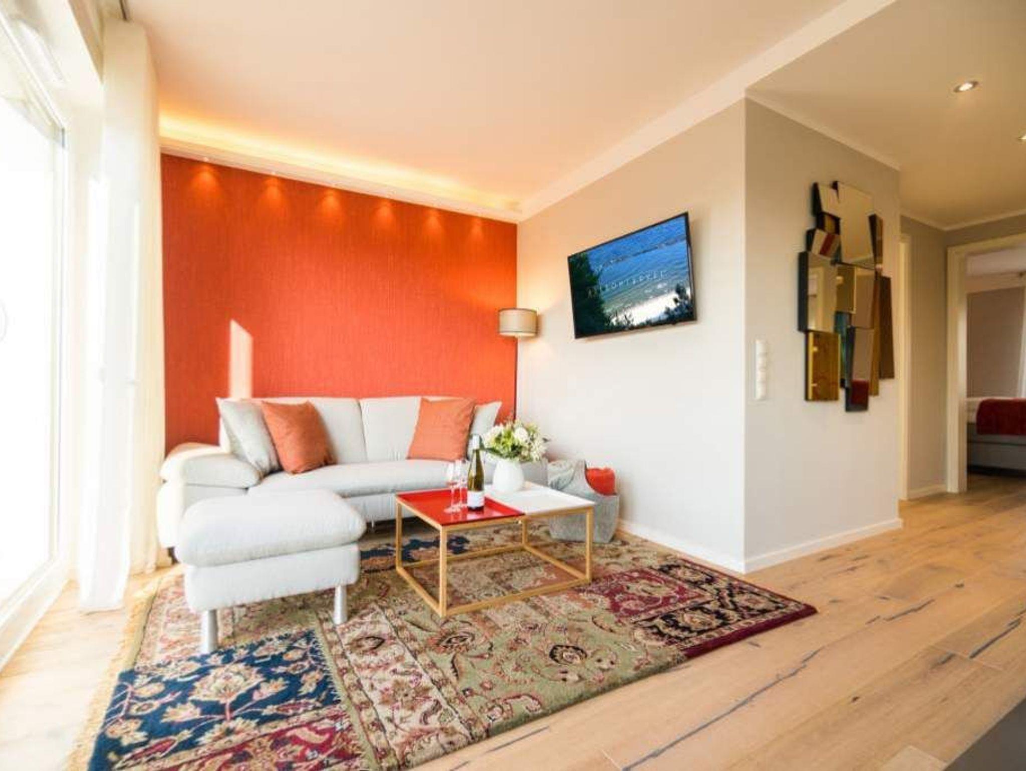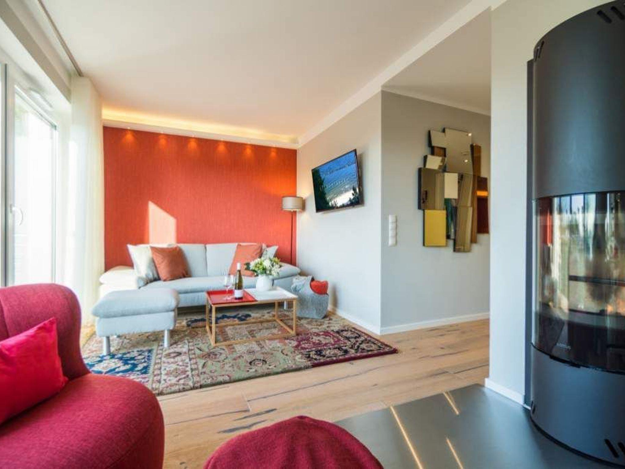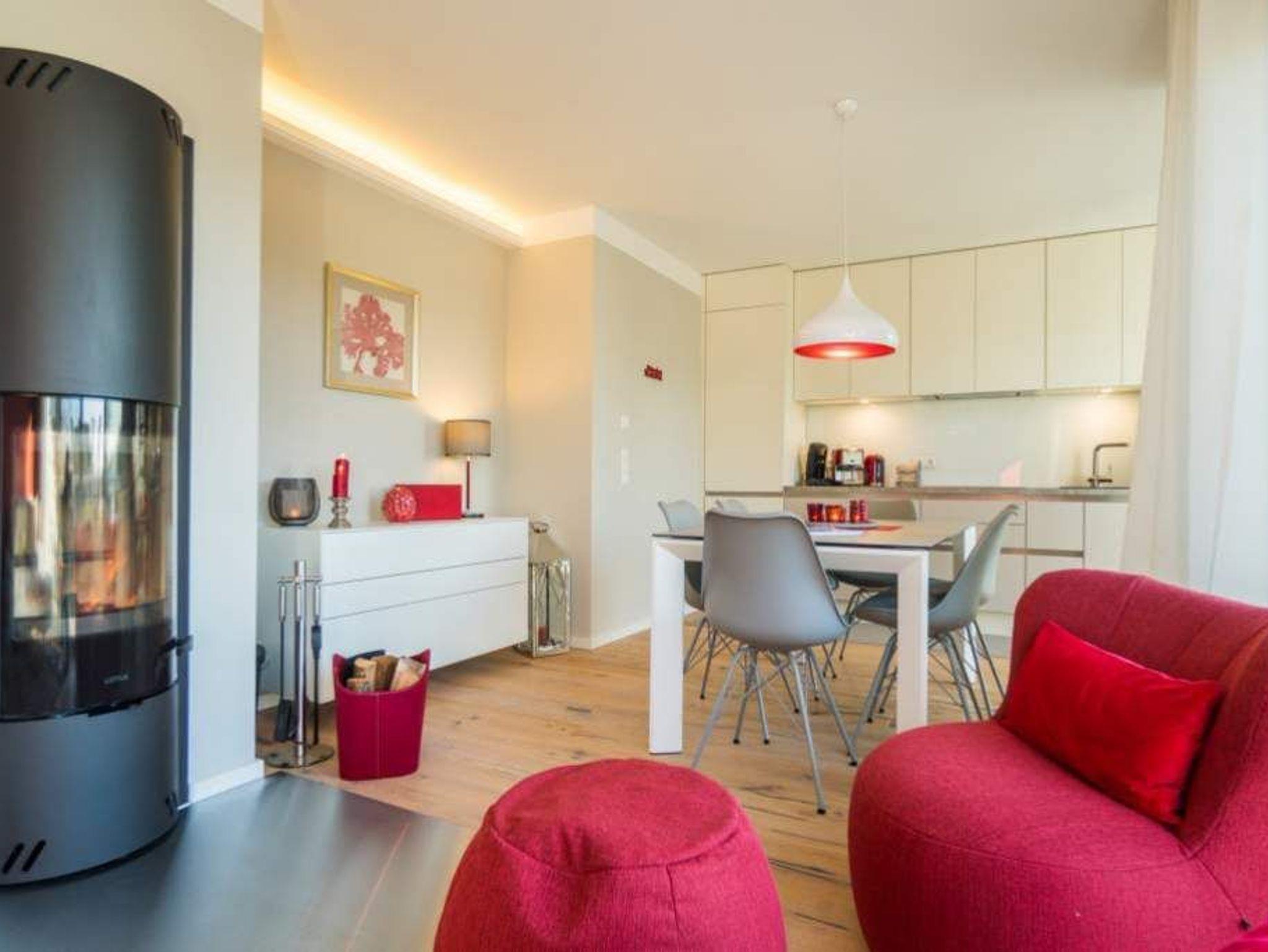 Sie lieben das Besondere und schätzen Design und Geschmack? Dann ist das zeitlos und noble Ferienappartement im Quartier am Fischerstrand Nummer 4 genau richtig für Sie, denn es ist von Innenarchitekten designt und lässt keine Wünsche offen. Bodentiefe, große Fenster lassen viel Licht in dieses Urlaubsdomizil für 4 Personen. Viel Weiß in Verbindung mit wohlgesetzten Farbakzenten in Orange und Rot bringen Leichtigkeit und Luftigkeit hinein. Hier können Sie tief durchatmen, sich wohlfühlen und ihren Urlaub in vollen Zügen genießen. Denn die 72 Quadratmeter sind geräumig, wunderbar hell und machen es zum idealen Urlauben, wo Sie Hektik und Stress schnell vergessen können. Vom großen Balkon aus vor Ihrem Wohnzimmer haben Sie einen weiten Blick über die Schönheit der alten Bädervillen von Heringsdorf. Genießen Sie von hier die frische Ostseebrise, relaxen Sie bei einem kühlen Getränk am Balkontisch oder auf der Sofalandschaft, die hinter den Glasscheiben nur darauf wartet, Ihnen entspannte Mußestunden zu schenken. An kühlen Tagen wärmt ein echter Kaminofen und verbreitet mit dem wohligen Knacken der brennenden Holzscheite urige Gemütlichkeit. Die offene Küche ist voll ausgestattet mit hochwertigen Geräten und Geschirr und verfügt über einen schönen großzügigen Essplatz. Zwei Schlafzimmer warten mit komfortablen Boxspring-Doppelbetten (beide 1,60 x 2,00 m) zum Schlafen und Kuscheln auf Sie. Schränke und Kommoden bieten viel Platz. Jedes Schlafzimmer besitzt wie auch das Wohnzimmer einen Flat-TV. Zur Wohnung gehört ein geräumiges Tageslichtbad mit einer großen geräumigen Dusche. Ein echtes Highlight an ungemütlichen Tagen ist die ins Bad integrierte Panoramasauna. Ein zweites Bad ist ebenfalls mit Dusche und WC ausgestattet. Für einen entspannten Urlaub haben wir Ihre Betten bereits bezogen. Handtücher liegen bereit. Zur Wohnung gehört ein Pkw-Stellplatz am Haus. Ein Abstellplatz für Ihre Fahrräder ist im Keller vorhanden. Das WLAN kann kostenfrei genutzt werden.