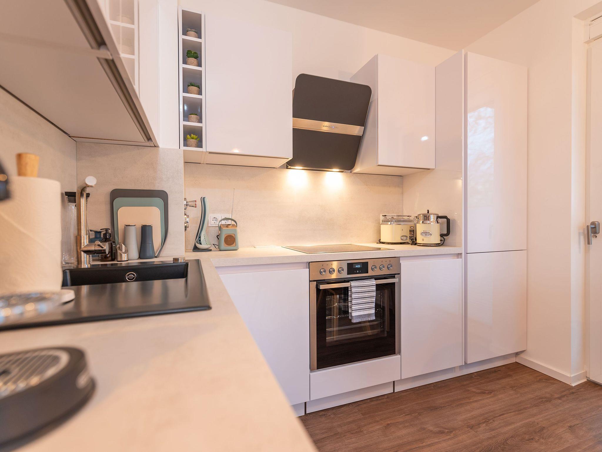 Der Wohnbereich ist lichtdurchflutet und lädt mit einem bequemen Sofa, Flat-TV und einem Elektrokamin zum Entspannen ein. Die voll ausgestattete Küchenzeile mit Essplatz für 4 Personen macht Selbstversorgung zum Vergnügen. Das großzügige, moderne Badezimmer verfügt über eine große Dusche und eine Waschmaschine, die den Komfort während Ihres Aufenthalts erhöht.