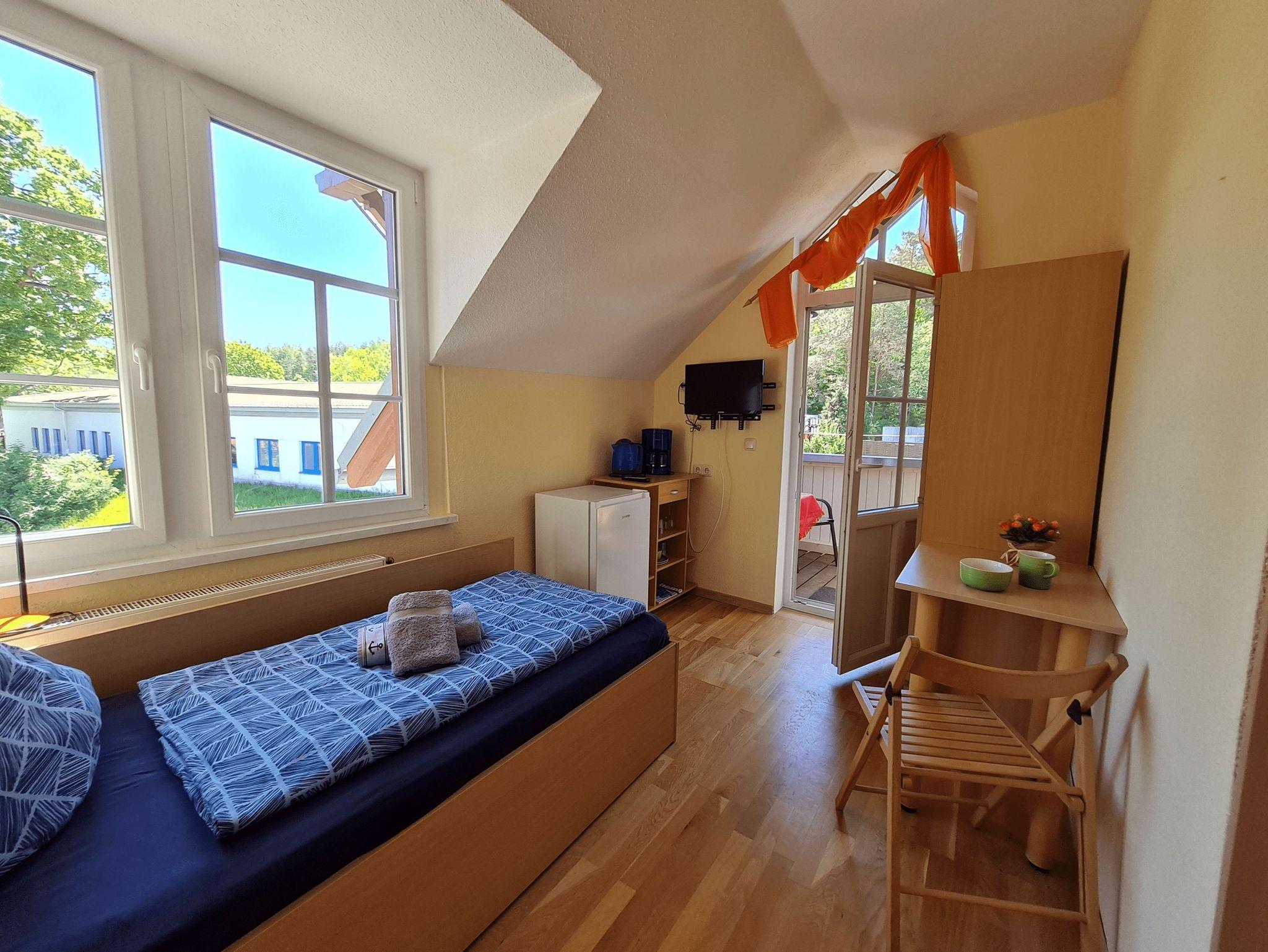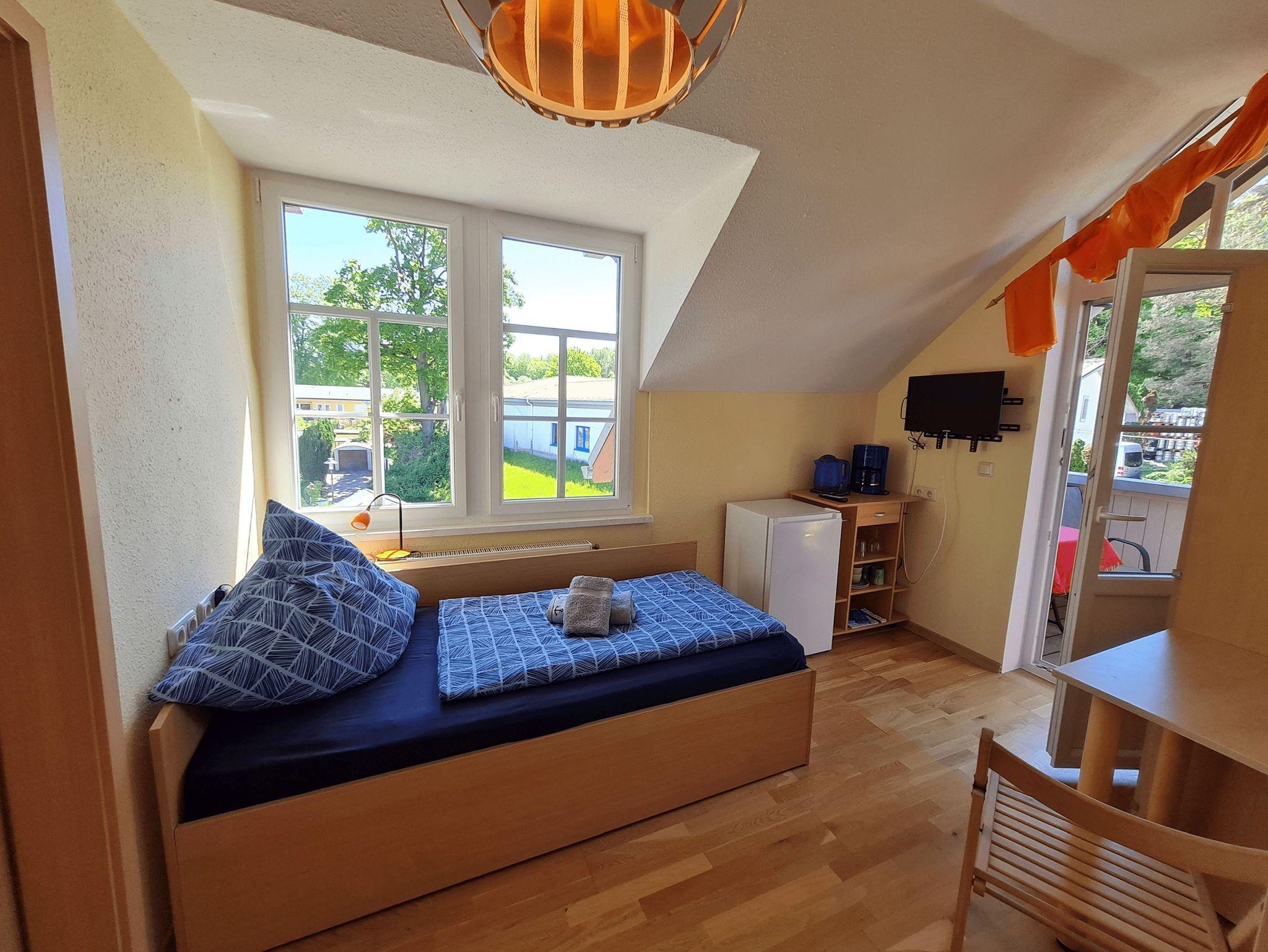 Das Appartement 1 eignet sich optimal für einen ruhigen Urlaub allein oder für eine zusätzliche Person. Sie ist klein aber fein mit 14m² und bietet Ihnen einen Wohn- und Schlafraum mit einem Einzelbett, sowie ein kleines Badezimmer mit Dusche und WC. Ebenfalls können Sie einen Wasserkocher, eine Kaffeemaschine und ein Mini-Kühlschrank benutzen.
