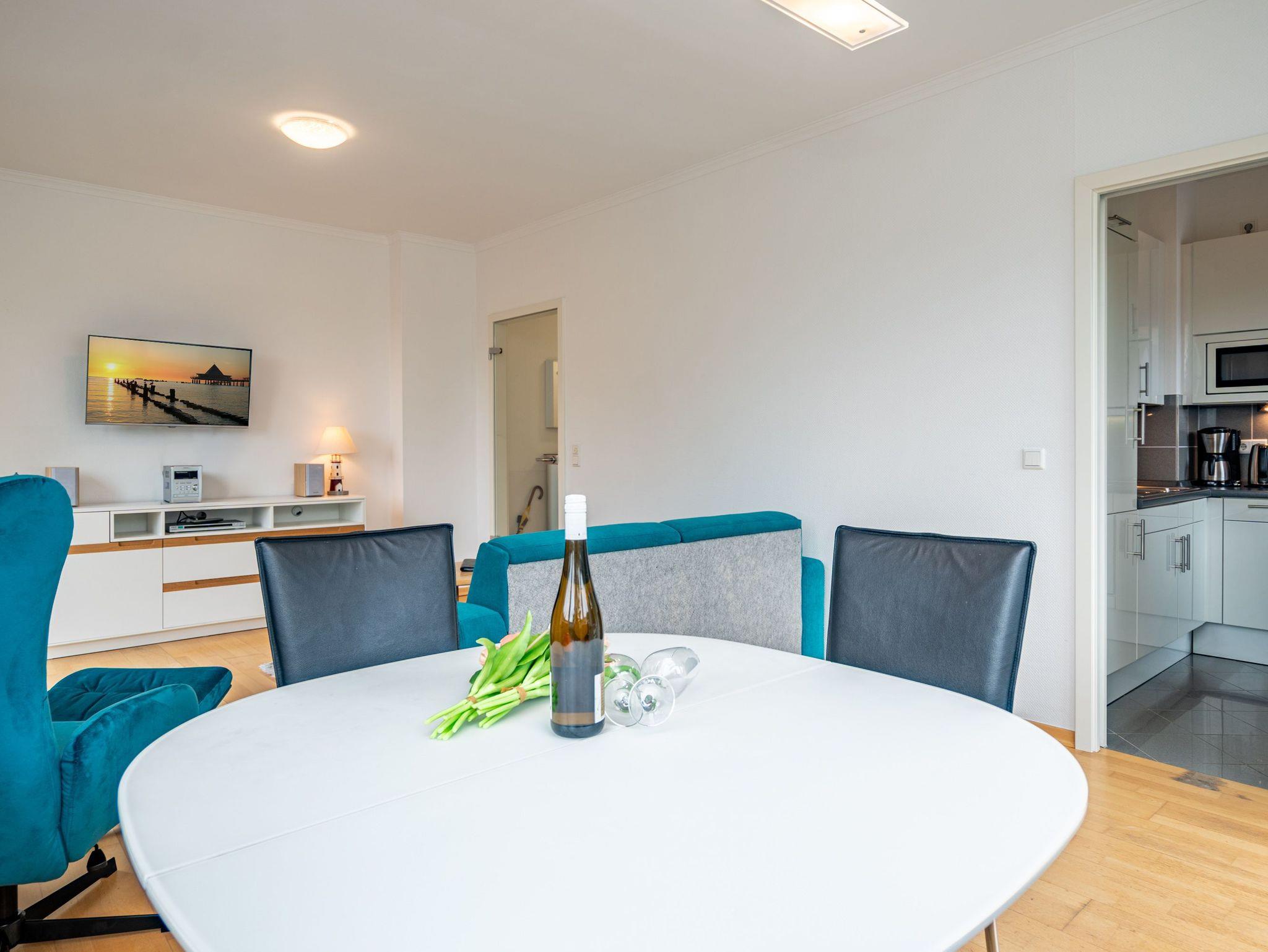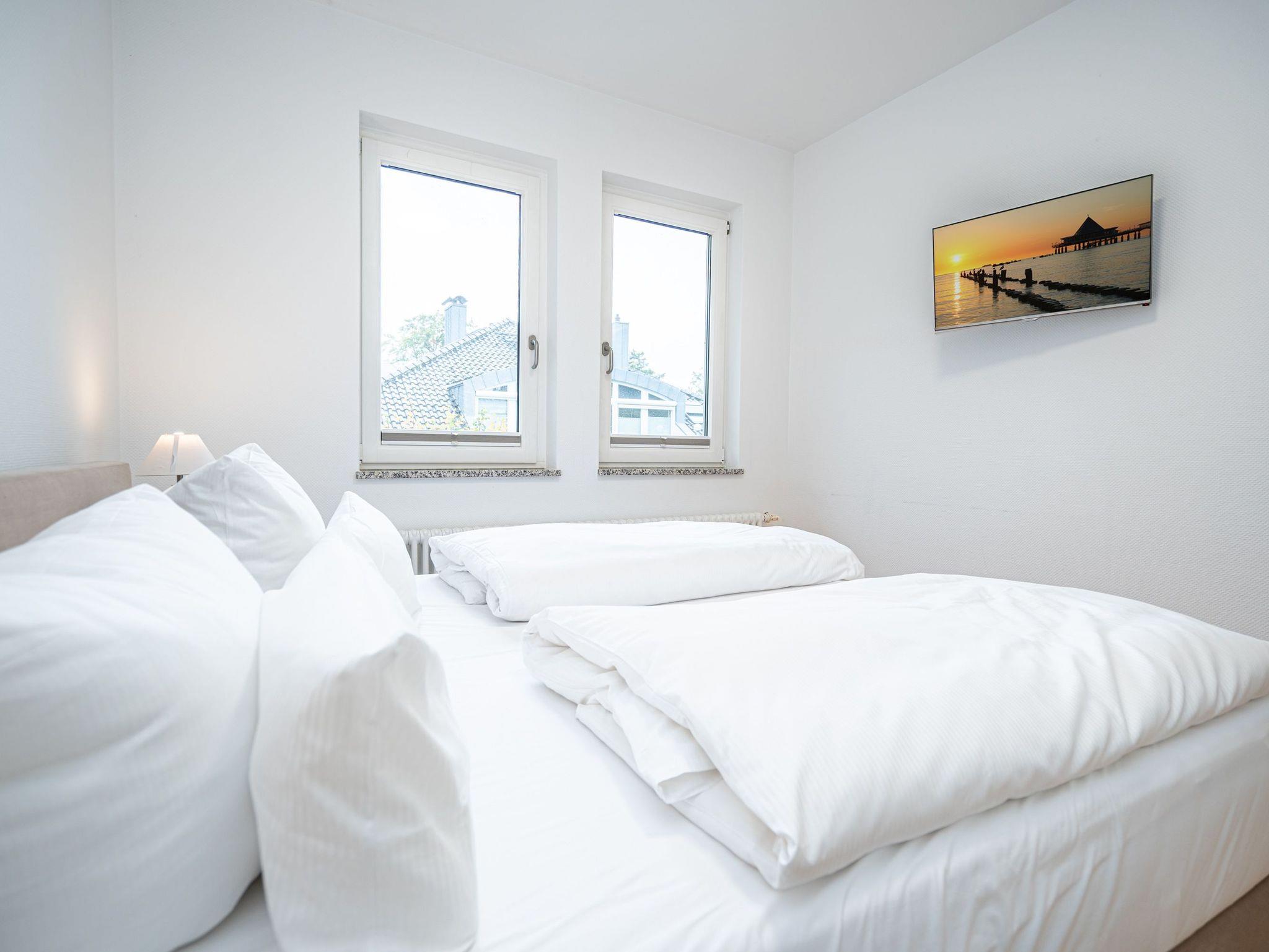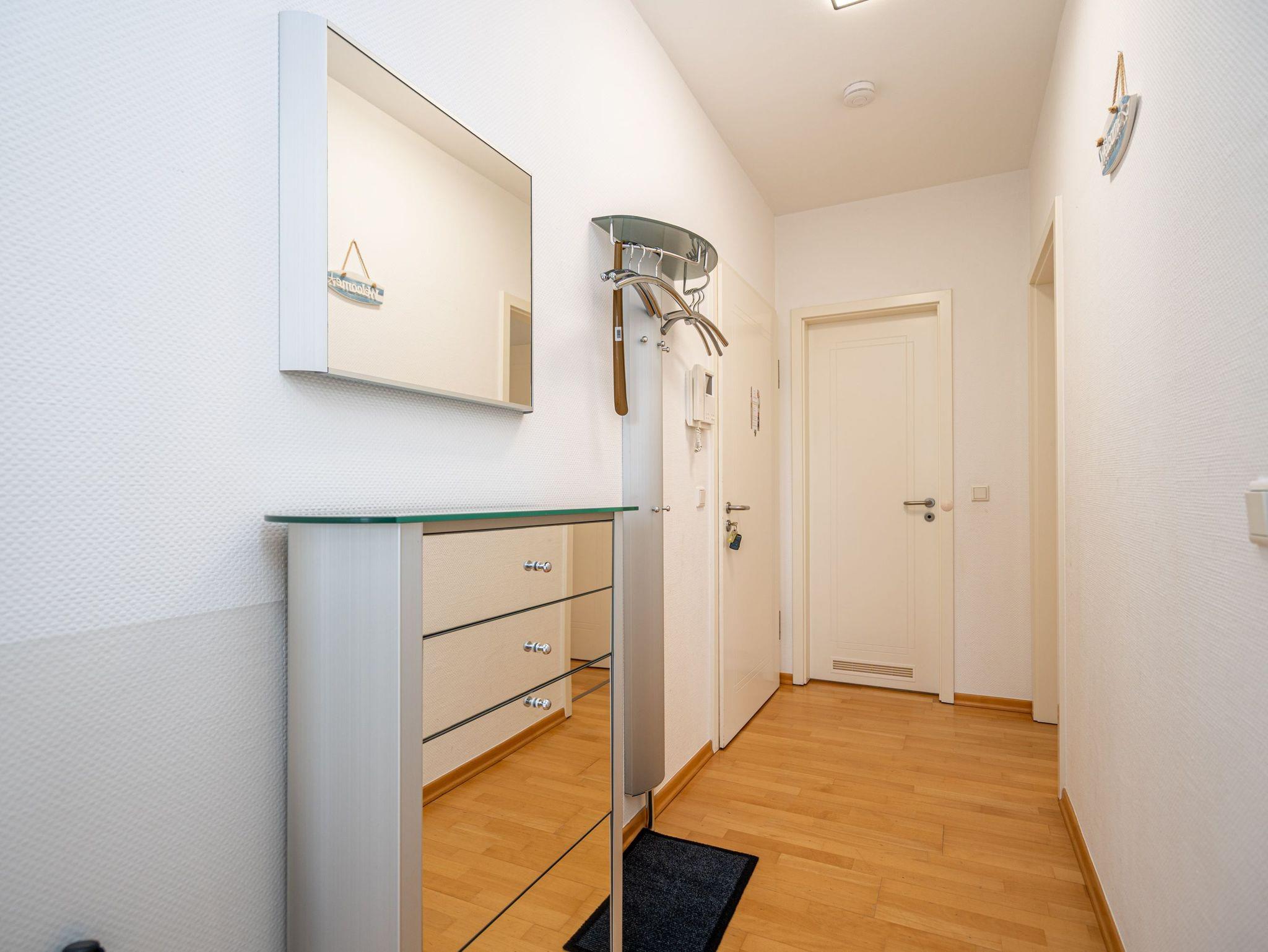 Dem Meeresrauschen ganz nah - in diesem wunderschönen 2-Zimmer-Appartement im 3. Obergeschoss können Sie den Rhythmus der Ostsee gleich auf zwei Balkonen genießen. Das 64 Quadratmeter große Wohlfühl-Domizil schenkt bis zu vier Ostseeliebhabern eine Traumauszeit mit Ausblick. Denn die windschiefen Kiefern gewähren vom Südost-Balkon aus Sicht auf glitzernde Wellen und blaue Weite. Doch auch der zweite Balkon hat in Südwest-Ausrichtung seine sonnig schönen Seiten. Ist es zu heiß, spannen Sie einfach den Sonnenschirm auf und genießen das laue Lüftchen aus dessen Schatten heraus. Beide Balkone können Sie vom geräumigen Wohn-Esszimmer aus betreten. Hier finden Sie viel Platz für entspannte Stunden. Das große Sofa lässt sich ausziehen, so dass zwei Personen darauf bequem übernachten können. Der Flat-TV ist mit einem DVD-Player verbunden. Am großzügigen Esstisch mit vier Stühlen werden gemeinsame Essen zu unterhaltsamen Mußestunden. Die separate Küche ist mit allem Nötigen ausgerüstet. Moderne Markengeräte erleichtern jeden Arbeitsschritt. Im Schlafzimmer schenkt Ihnen ein komfortables Boxspringdoppelbett (1,80 m x 2,00 m) erholsames Schlafvergnügen. Ein geräumiger Einbauschrank offenbart reichlich Ablageflächen. Auch im Schlafzimmer befindet sich ein Flat-TV. Das Appartement verfügt über zwei Bäder. Eines hat eine Badewanne. Das zweite ist mit einer Dusche versehen. Handtücher liegen für Sie bereit. Für die schnelle Wäsche zwischendurch befindet sich im Untergeschoss des Hauses eine Münzwaschmaschine und ein Münztrockner. Das WLAN ist kostenfrei. Bei Anreise sind die Betten bezogen. Für Ihr Auto gibt es im Doppelparker Nummer 1 einen Stellplatz (max. Pkw-Höhe 1,50 m, Pkw-Länge max. 5,00 m / Gewicht max. 2t).