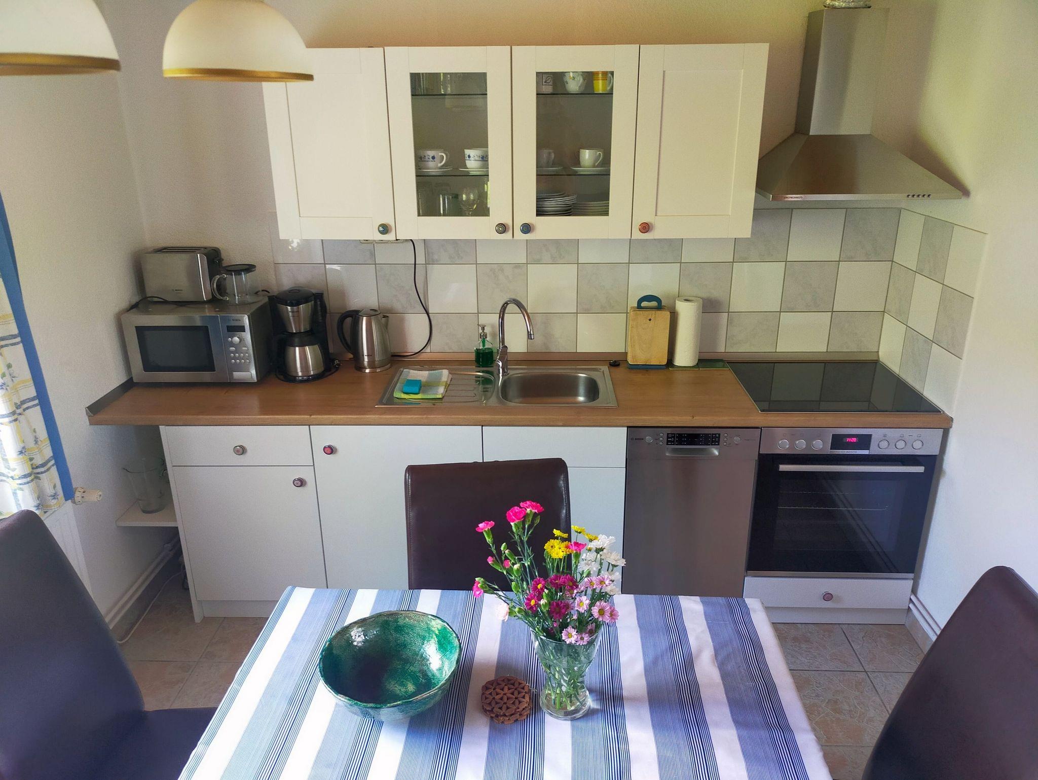 Dieser liebevoll eingerichtete Bungalow mit separatem Eingang bietet mit seinen 60 qm einen idealen Rückzugsort für bis zu 4 Erwachsenen und 1 Kleinkind bis 3 Jahre. Im hellen Wohnbereich gibt es eine gemütliche Couch, Sessel, Esstisch mit 5 Stühlen sowie einen Flachbild-TV. Eine komplette Küchenzeile mit Cerankochfeld, Backofen, Geschirrspüler, Mikrowelle, Toaster, Kaffeemaschine und Wasserkocher bietet beste Voraussetzungen für das gemütliche Frühstück oder das Abendessen zu fünft. Das größere Schlafzimmer beinhaltet ein Doppelbett (1,80 m x 2,00 m) mit einer Decke (2,00 m x 2,20 m), das kleinere Schlafzimmer hat zwei Einzelbetten. Das Badezimmer mit Fenster ist funktional gestaltet: mit Dusche, WC und Ablageflächen. Eine Terrasse mit Blick in den Garten lädt schon morgens dazu ein Ihren Kaffee zu genießen oder den Abend bei einem Glas Wein ausklingen zu lassen.