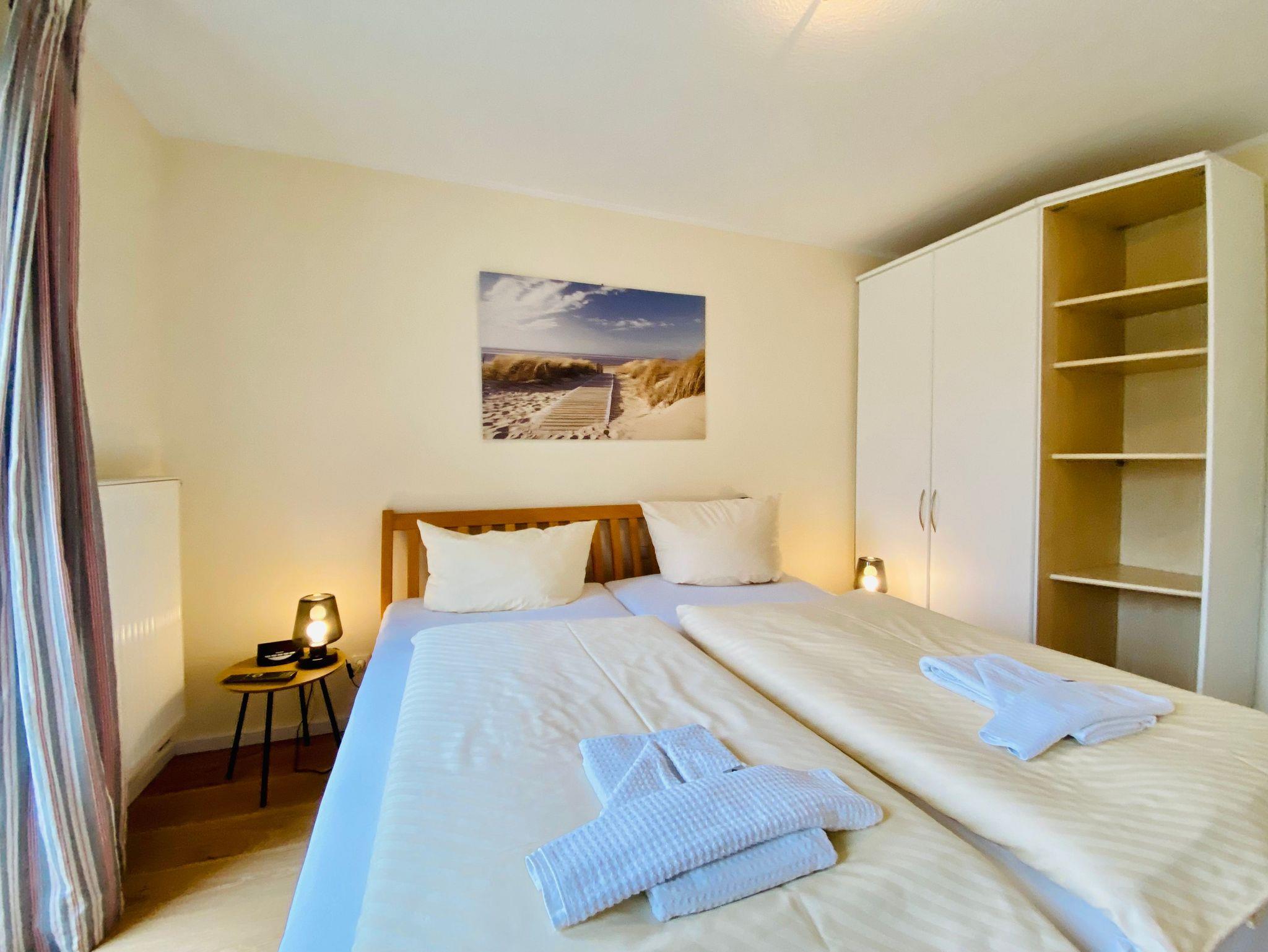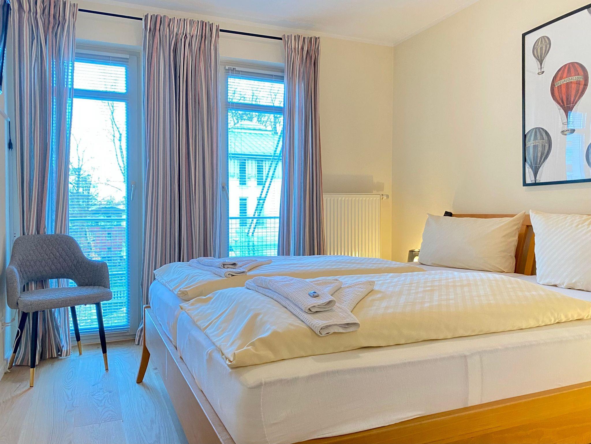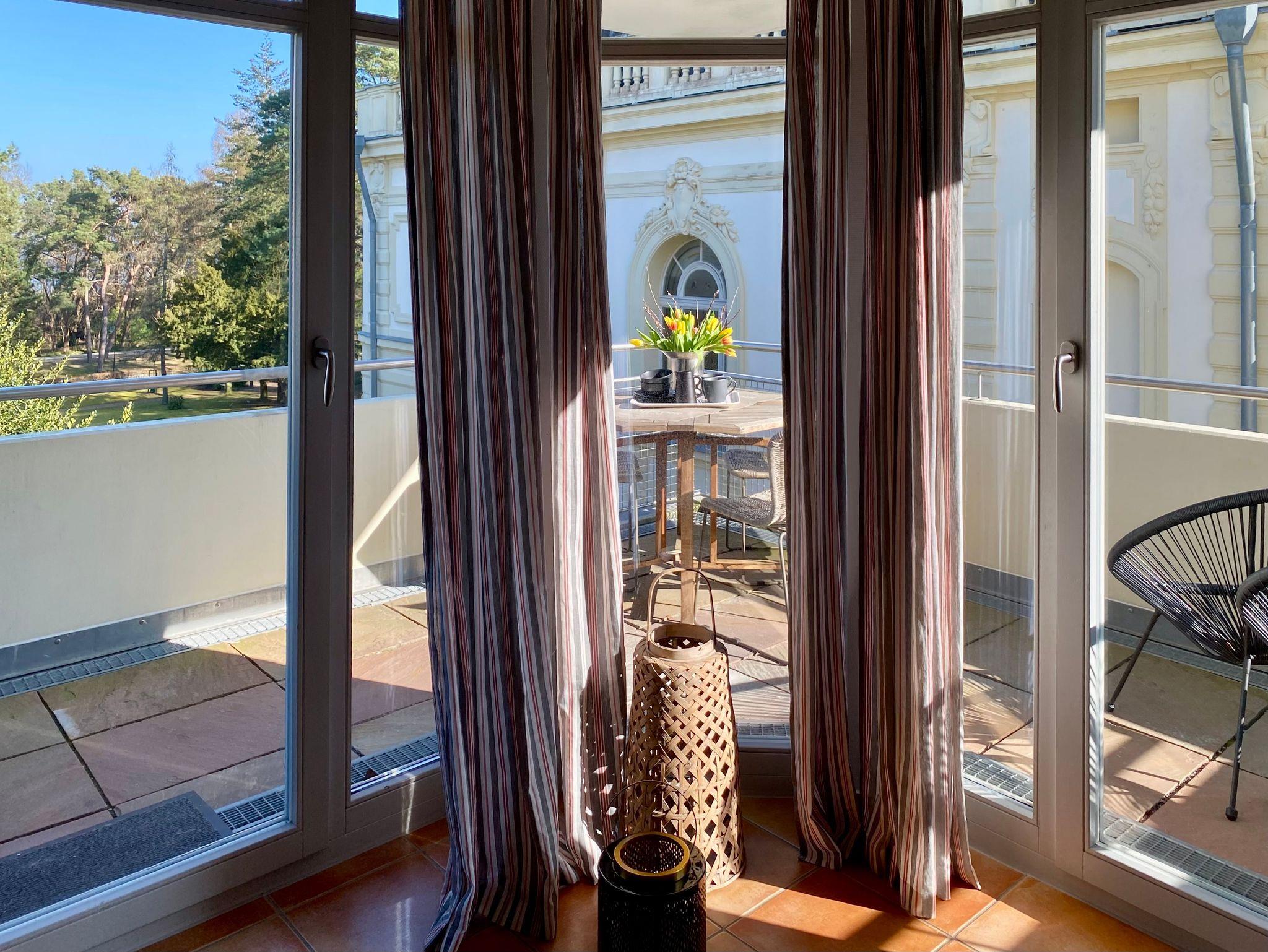 Sie besteht aus einem kombinierten Wohnraum mit Komplettküchenzeile und Sitzbereich mit Couch, Sessel und Flachbild-TV. Zur Ferienwohnung gehören zwei Schlafzimmer eins mit Doppelbett und TV, das andere mit ausziehbarem Einzelbett. Genießen Sie nach dem Strandspaziergang ein Bad in der Wanne. Lieblingsplatz jedoch ist der überdachte Balkon, von dort schauen Sie auf die prächtige Villa Bleichröder und in den Park.