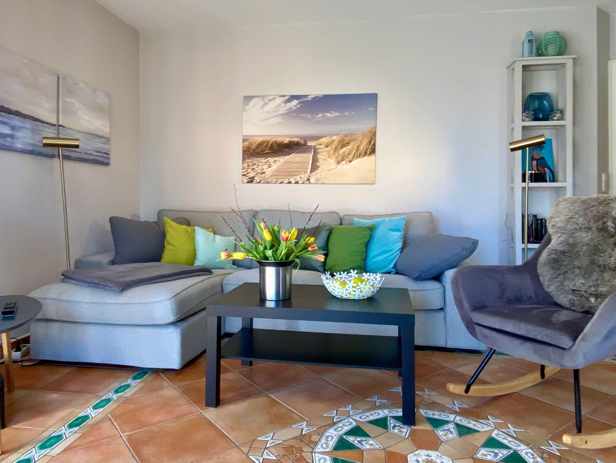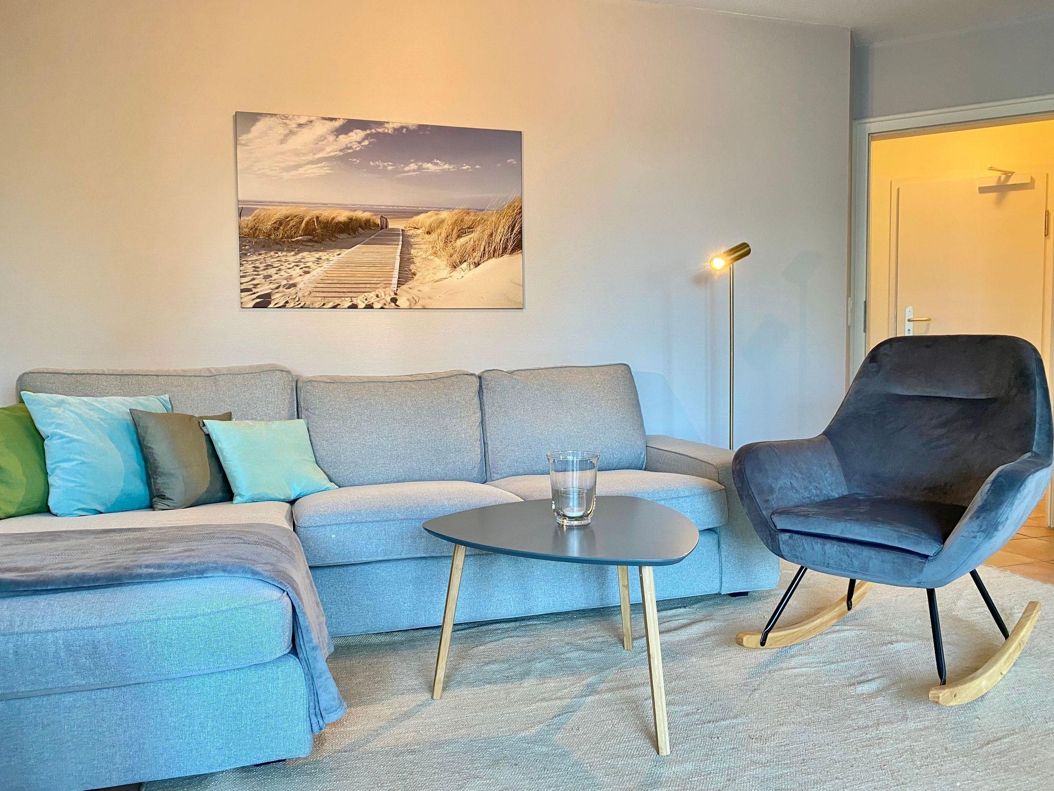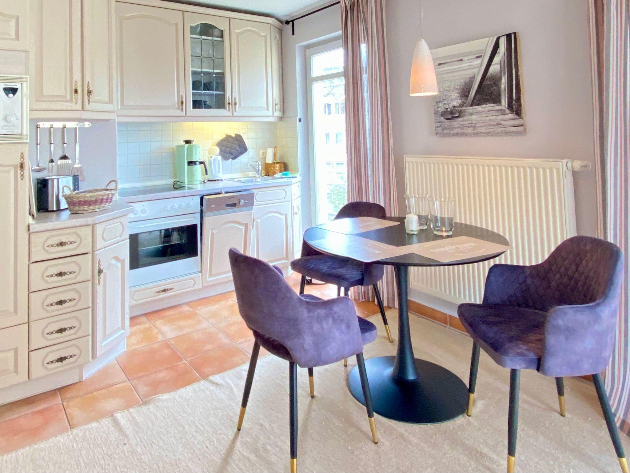 Sie besteht aus einem kombinierten Wohnraum mit Komplettküchenzeile und Sitzbereich mit Couch, Sessel und Flachbild-TV. Zur Ferienwohnung gehören zwei Schlafzimmer eins mit Doppelbett und TV, das andere mit ausziehbarem Einzelbett. Genießen Sie nach dem Strandspaziergang ein Bad in der Wanne. Lieblingsplatz jedoch ist der überdachte Balkon, von dort schauen Sie auf die prächtige Villa Bleichröder und in den Park.