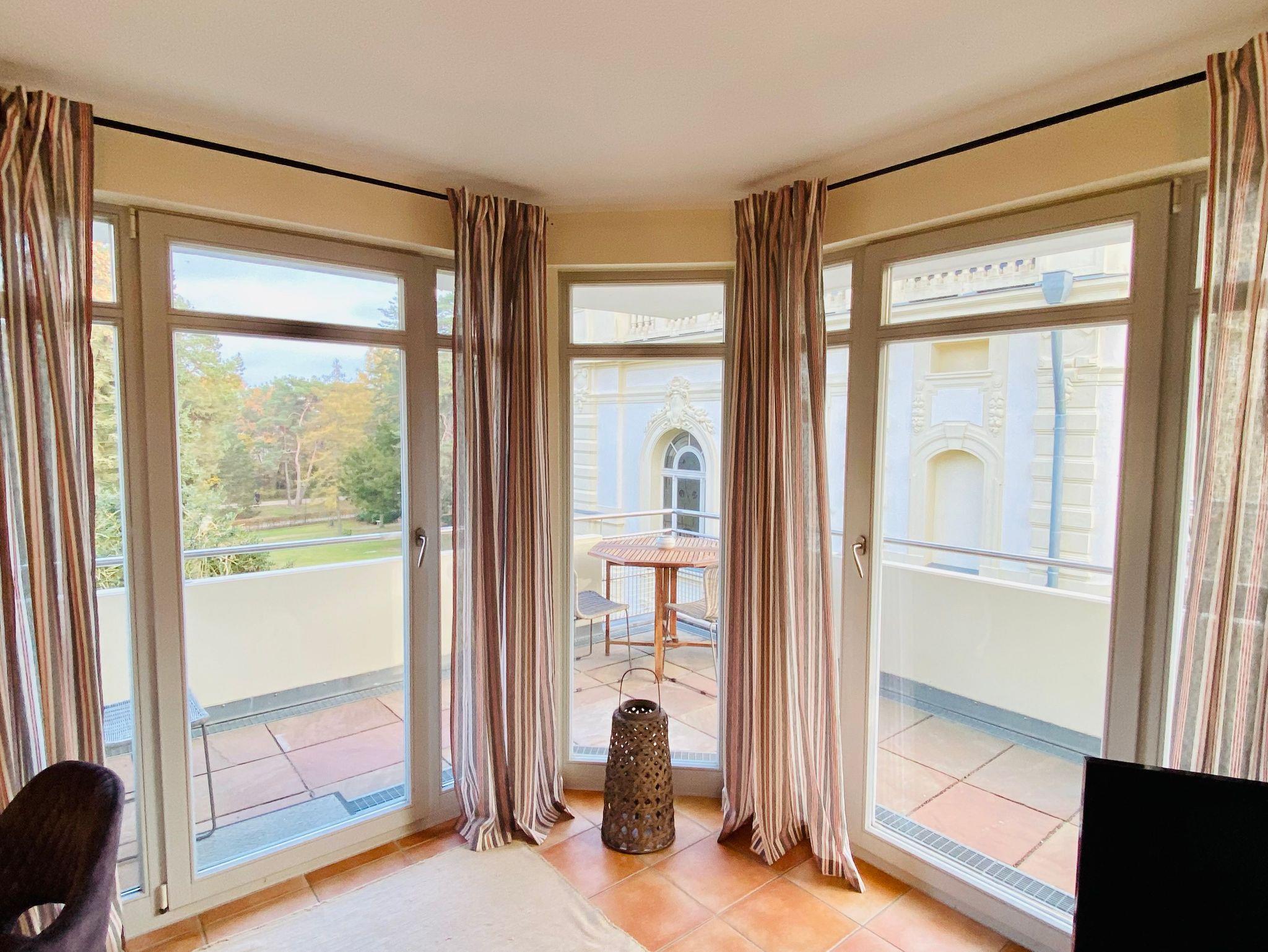 Die schöne Dreiraumwohnung 16 befindet sich im ersten Obergeschoss der Villa Rondell und ist mit einem Fahrstuhl erreichbar. Von hier aus genießt der Gast den Blick in den Park der Residenz Bleichröder. Die Ferienwohnung 16 wurde 2023 frisch renoviert und hochwertig sowie praktisch eingerichtet.