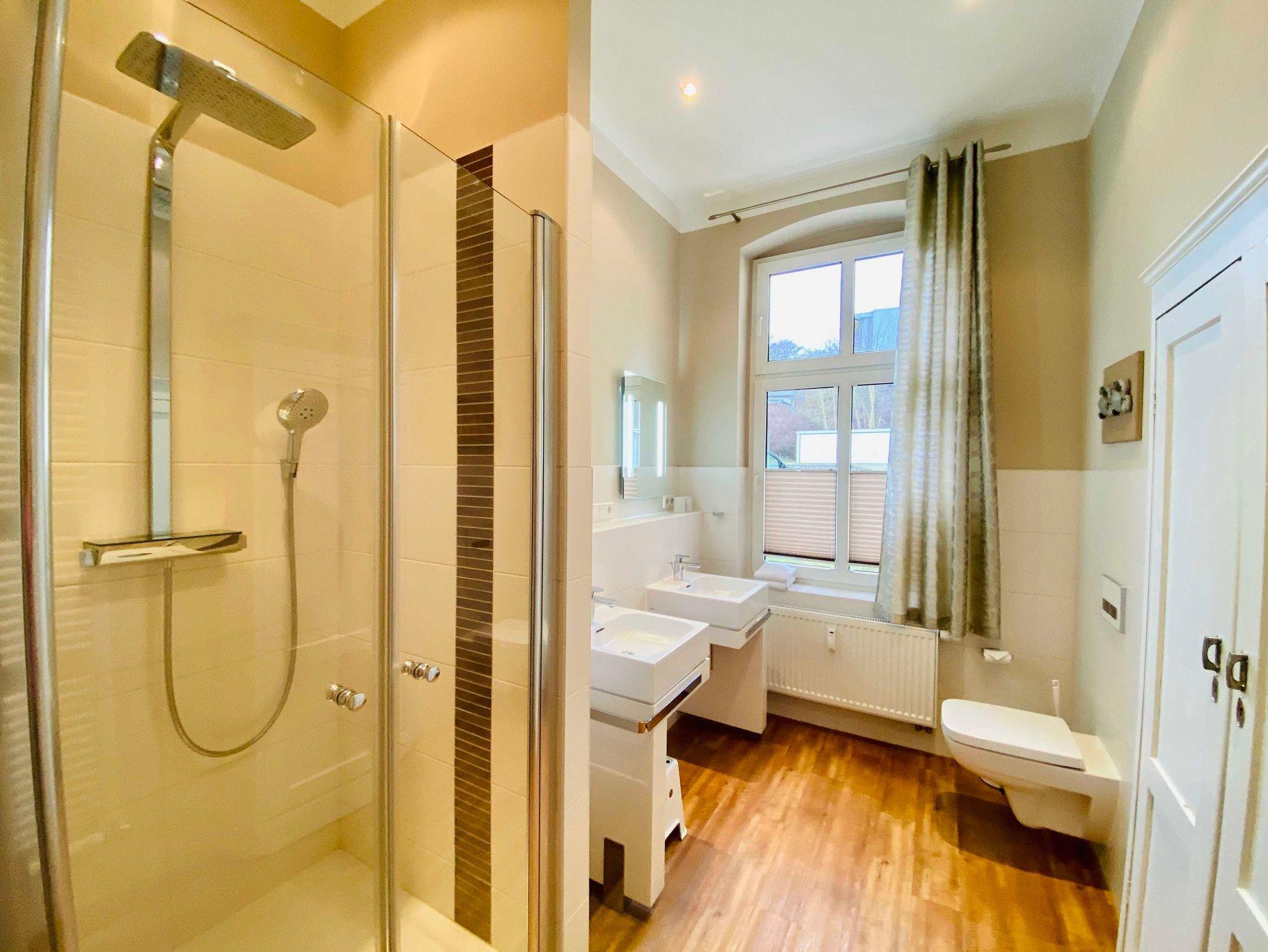 Die frische, innovative Dreiraumwohnung befindet sich im Erdgeschoss der Villa Anna und besteht aus einem großzügigen Wohnraum mit offener Veranda und integrierter moderner Küchenzeile. Zwei schöne Schlafzimmer mit Doppelbetten und zwei Bäder mit Luxusduschen komplettieren das Angebot. Die gesamte Wohnung ist mit einem hochwertigen, allergikerfreundlichen Boden ausgelegt. Der Kontrast zwischen moderner Einrichtung und alten, hohen Decken macht den besonderen Reiz der Ferienwohnung aus. Zur Ferienwohnung gehört ein Stellplatz am Haus und die Möglichkeit, das Gartengrundstück mit Terrassenmöbeln zu nutzen.