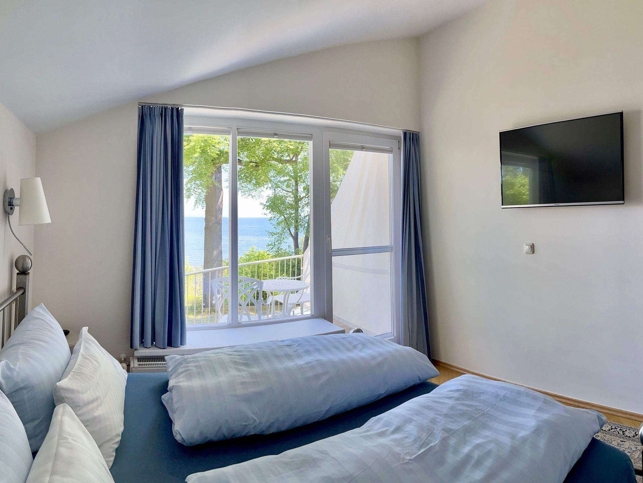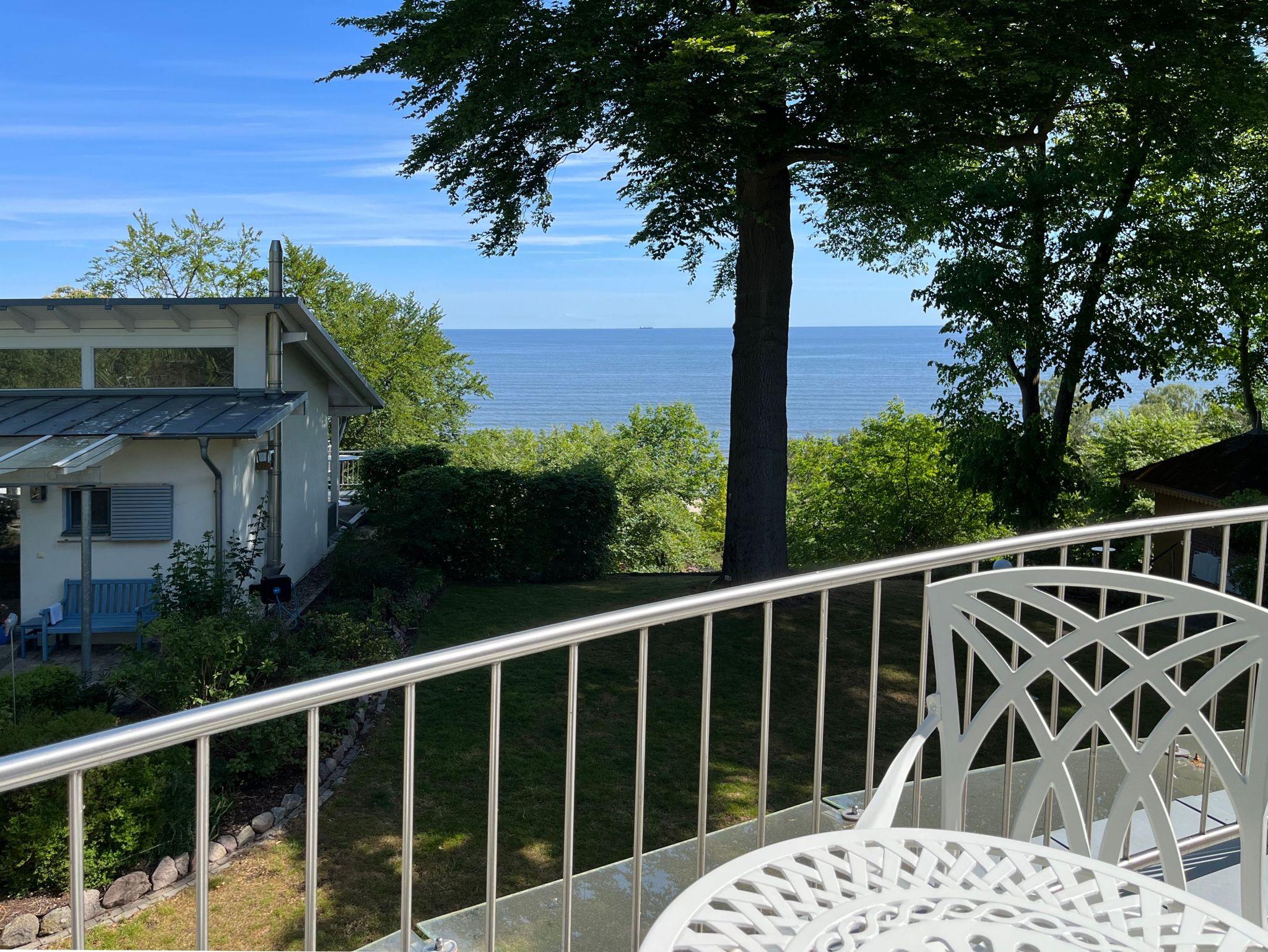 Großzügige Ferienwohnung mit herrlichem Meerblick vom Schlafzimmer und der dazugehörigen Terrasse. Zur Wohnung gehört der historische Verandenvorbau auf der sonnigen Süd-/Westseite mit Blick in den gepflegten Vorgarten und in die Kronen der stattlichen Bäume. All unsere Wohnungen sind geschmackvoll und individuell eingerichtet. Ausgesuchte Möbelstücke und Bilder, Echtholz-Parkett - teils mit hochwertigen Teppichen belegt ? prägen den Stil des Hauses. Das Meerblick-Schlafzimmer ist mit einem manufakturgefertigten Edelstahlbett, Einbauschrank incl. Safe, Flachbild-TV und Verdunklung ausgestattet, die Terrassentür ist mit Insektenschutz versehen. Als zusätzliche Schlafgelegenheit befindet sich im Wohnbereich eine komfortable ausklappbare Ledercouch. Zur Ausstattung gehört ein Smart-TV mit Soundbar - zur einfachen Verbindung mit Ihrem Smartphone, iPad oder anderen bluetoothfähigen Geräten - sowie ein DVD-Player. Die komplett ausgestattete Küche (Kühlschrank mit Gefrierfach, Backofen, Cerankochfeld, Dunstabzug, Mikrowelle, Toaster, Wasserkocher, Filter-Kaffeemaschine u. Nespresso-Kapselmaschine, Rührgerät etc.) ist in sich abgeschlossen. Es gibt ein Tageslicht-Badezimmer mit Wanne und eine Dusche.