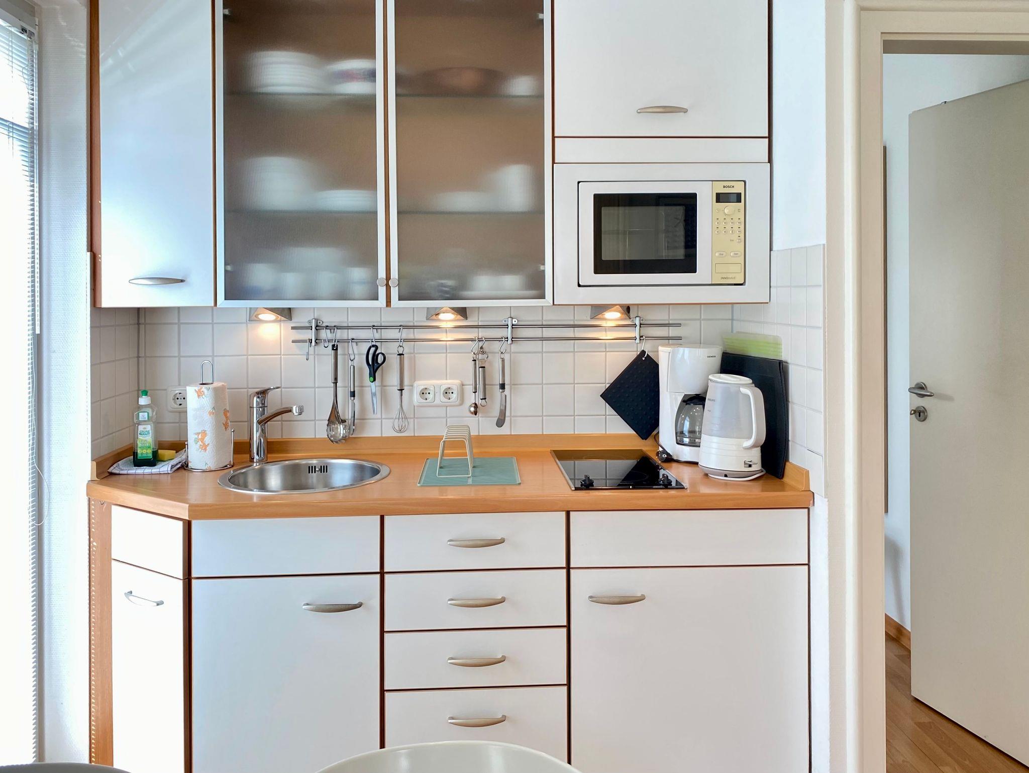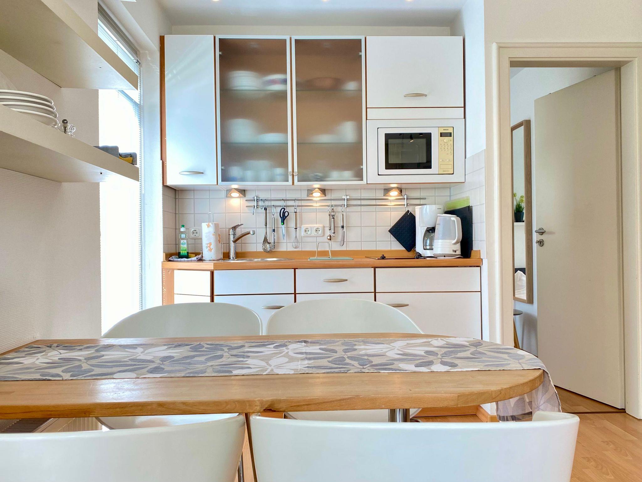 Die Ferienwohnung 13 im Haus Rondell ist eine modern eingerichtet 3 Raum-Wohnung und verfügt über einen kombinierten Wohn-Essraum mit kleiner Küchenzeile.