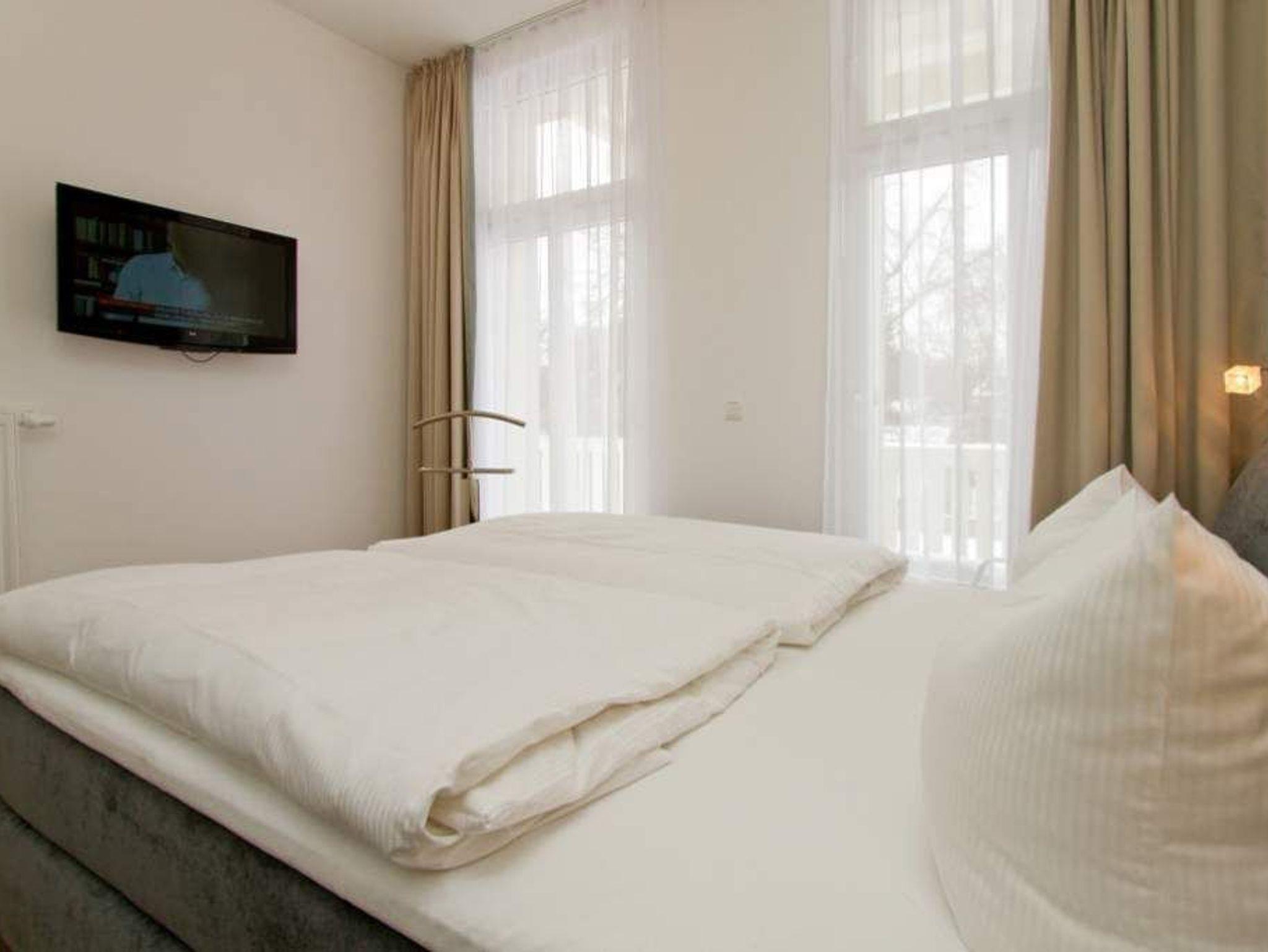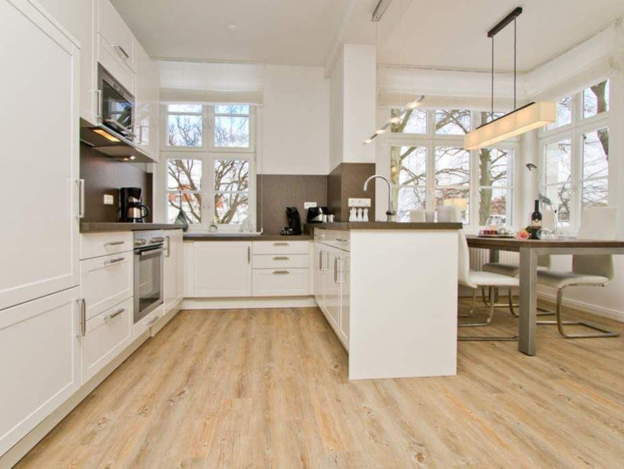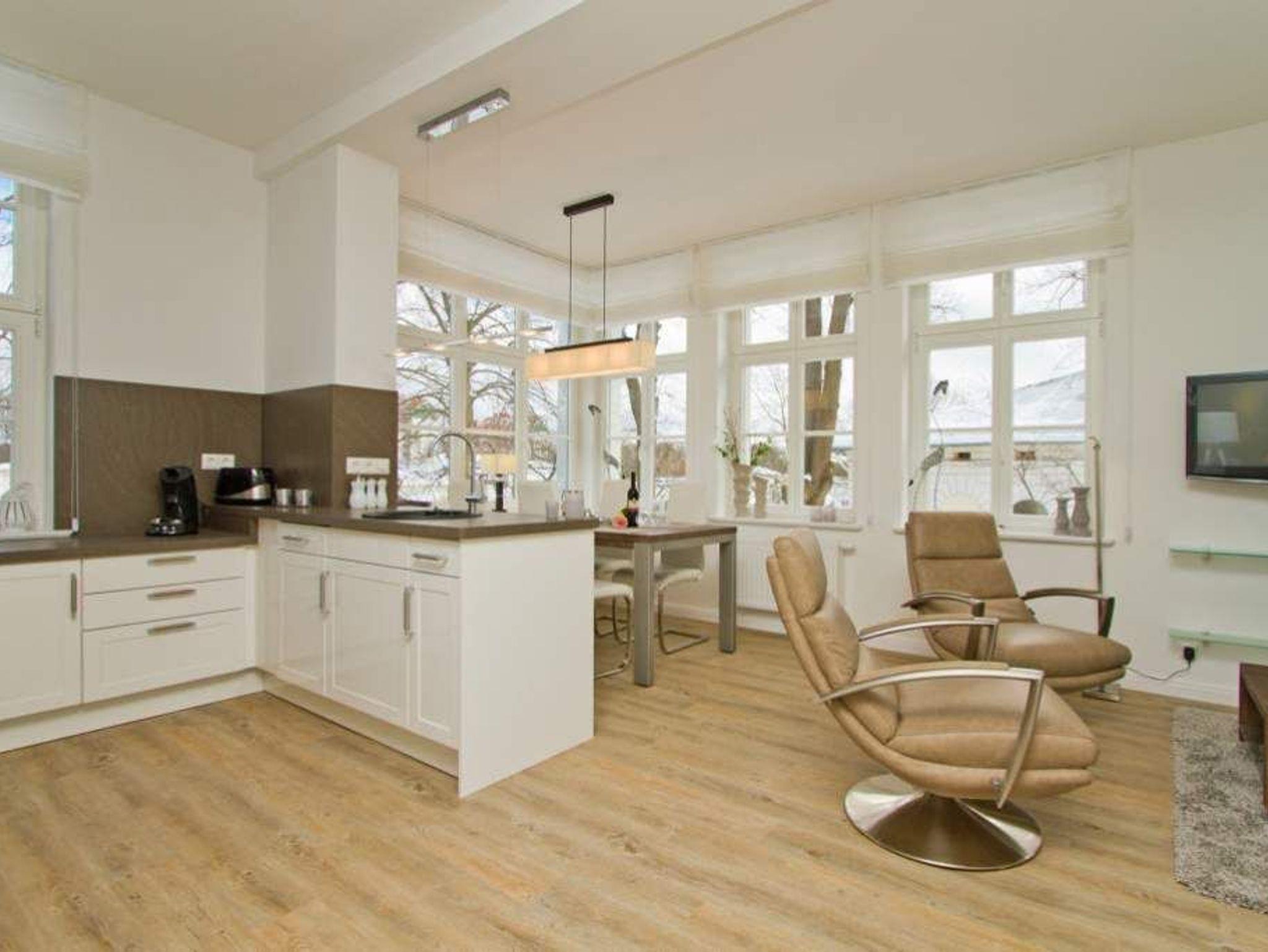 Hell, modern, stylisch! Auch diese großzügige 3-Raum-Ferienwohnung ( 70 qm) im 1.OG bietet neben ausreichend Platz für max. 4 Personen eine luxuriöse Ausstattung und Möblierung, die viel Urlaubsflair versprüht. Ausstattungstechnisch wurde selbstverständlich an alles gedacht. Der geschmackvoll möblierte Wohnbereich mit Flat-TV und Blue-Ray-Player Philips Heimkinosystem bietet auch einen per Fernbedienung bedienbaren Gas-Designkamin. Ein Highlight besonders in der kalten Jahreszeit. An den schönen Essbereich in der verglasten Veranda, schließt sich eine offene, komplett ausgestattete Küche an (auch Waschmaschine vorhanden). Auch die beiden Schlafzimmer mit Boxspringbetten ( 1,60 m) für erholsamen Schlaf sind mit je einem Flat-TV ausgestattet. Für Ihren Komfort steht die Erstausstattung Wäsche für Sie bereit. Ergänzt wird die Wohnung durch ein schönes Bad mit Doppelwaschtisch und Echtglasdusche und ein Gäste-WC. Wer keine Lust auf Strand hat, macht es sich auf dem großen, sonnigen Südbalkon gemütlich, bequeme Gartenmöbel und eine Sonnenliege warten hier auf Sie. Das WLAN-Netz im Haus kann kostenfrei genutzt werden.
