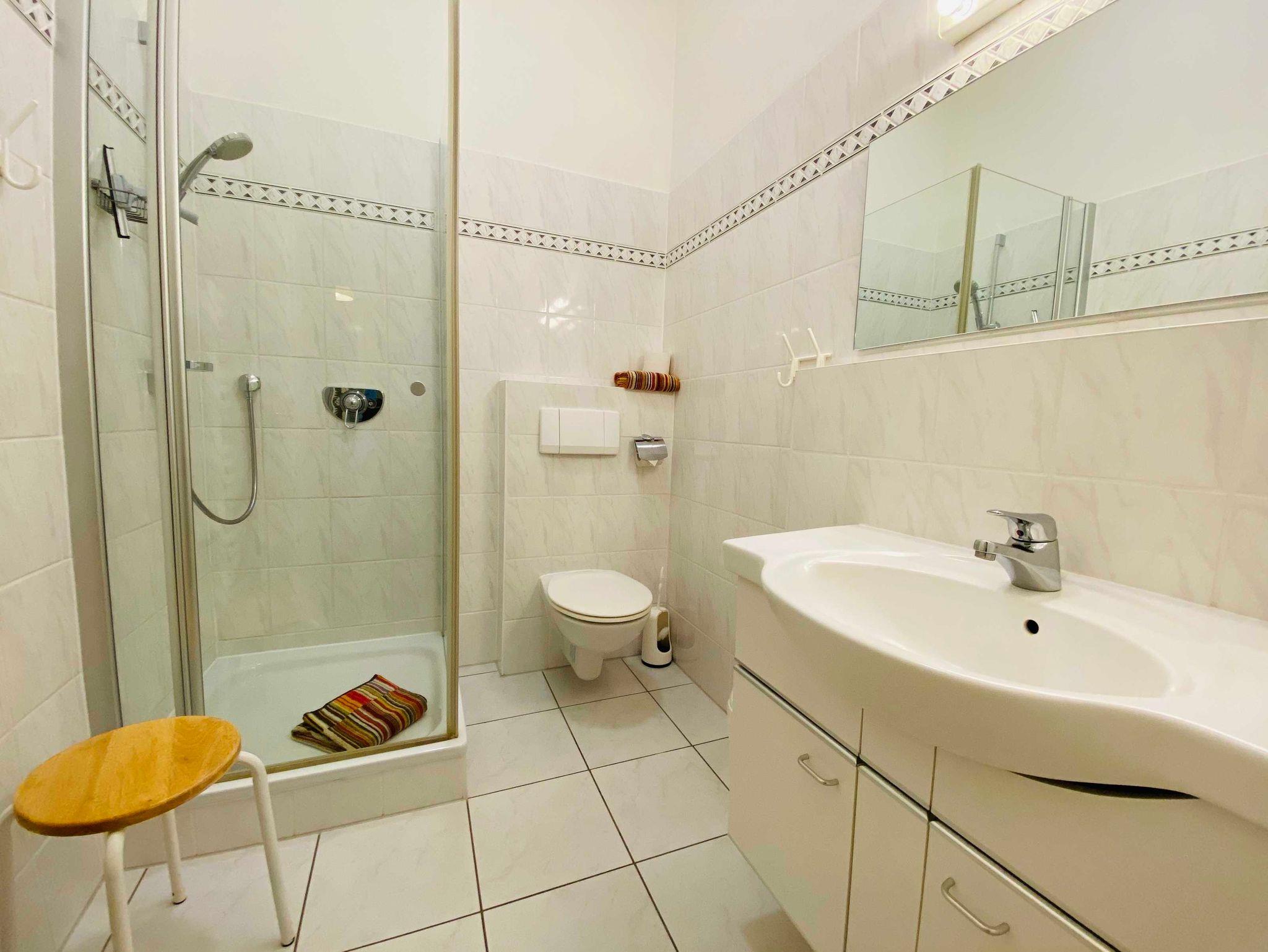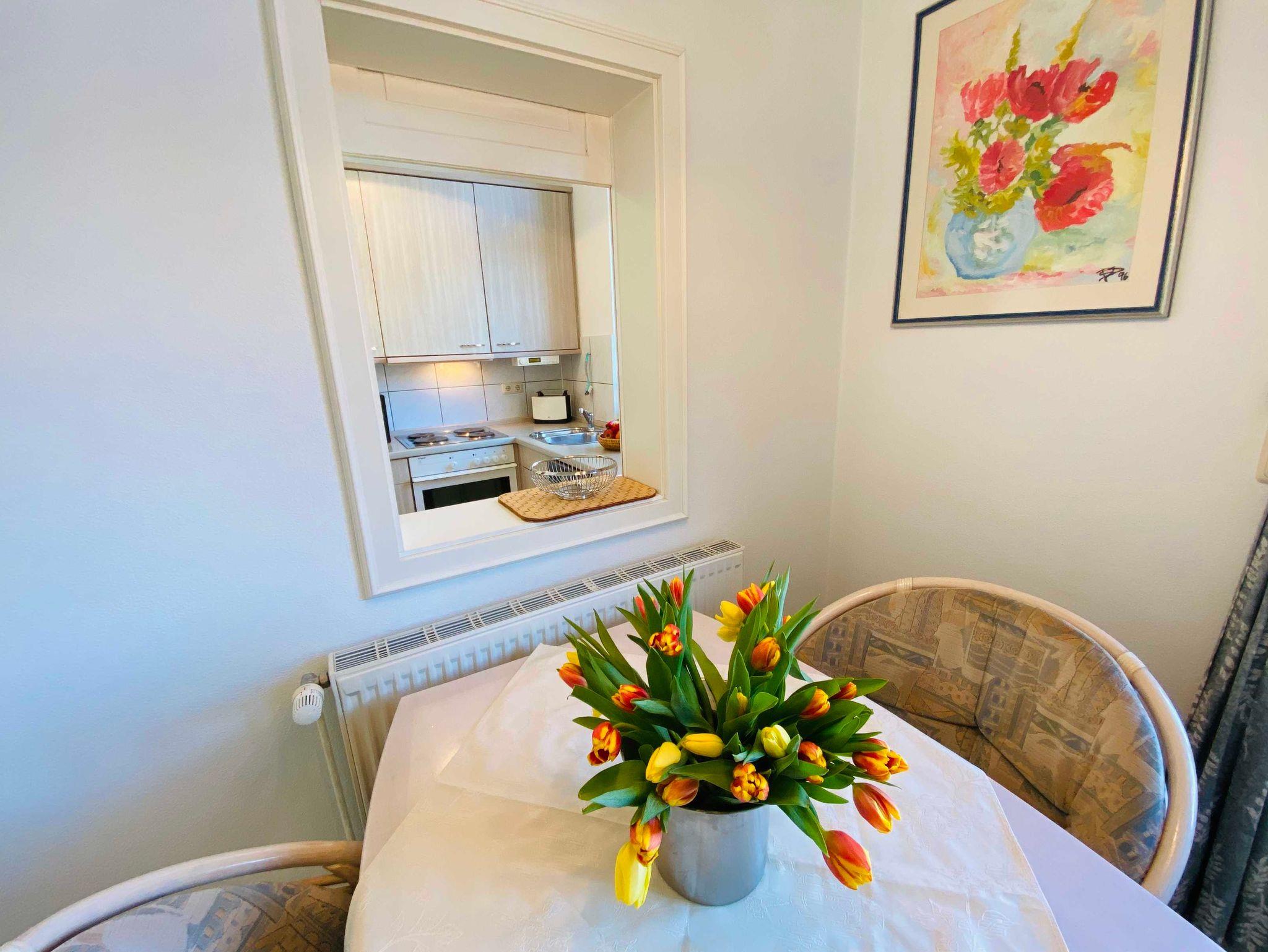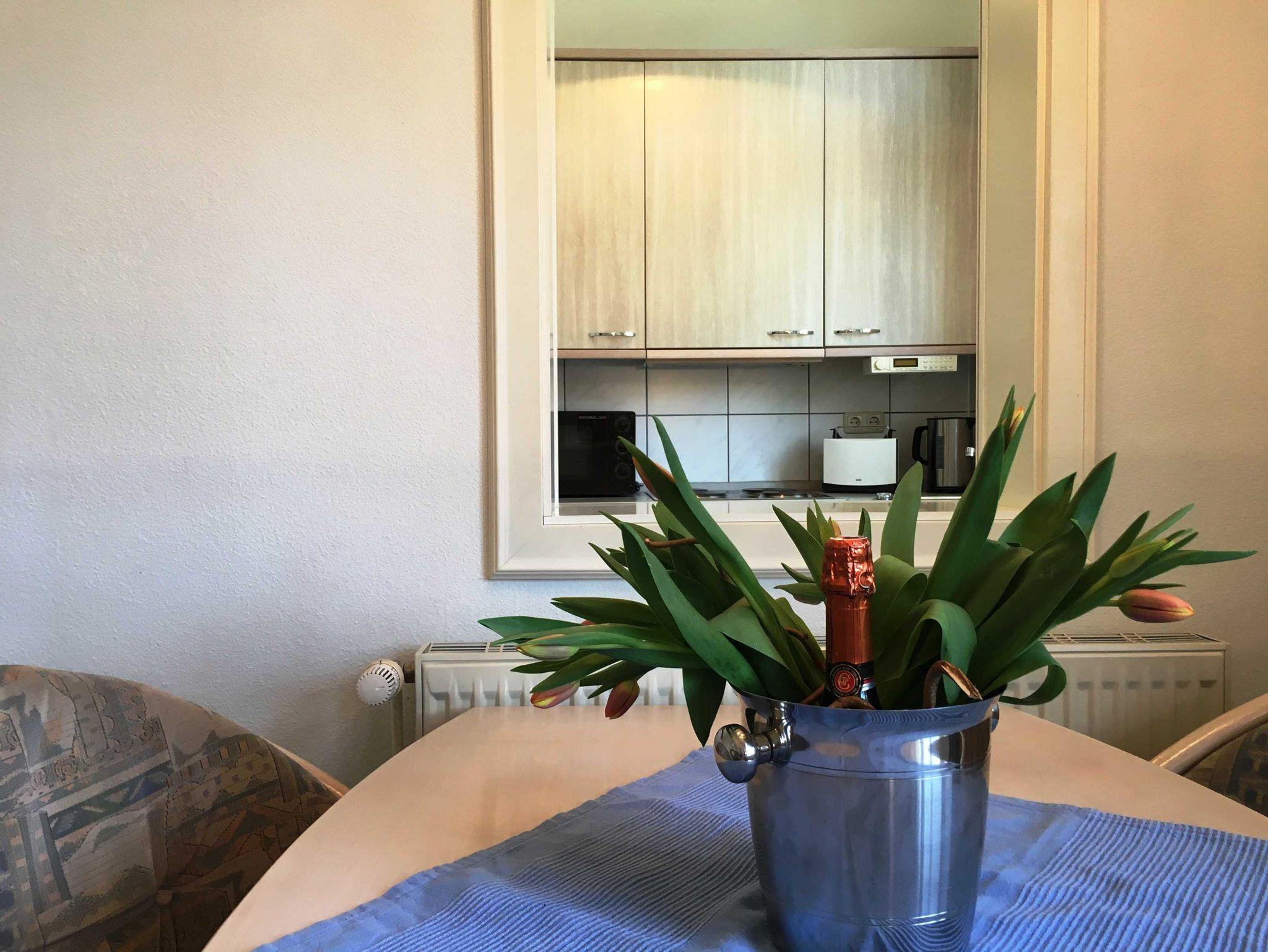 Die Ferienwohnung 7 ist eine kleine, liebevoll eingerichtete Zweiraumwohnung mit einer separaten Küche (Geschirrspüler, Mikrowelle, Backofen). Zur Ferienwohnung gehören weiterhin ein gemütliches Wohnzimmer mit Sitzecke und Essbereich. Es gibt ein gemütliches Schlafzimmer mit Boxspringbett. Ein Wandbett im Flurbereich für eine weitere Person steht zu Verfügung. Die Ferienwohnung hat ein Bad mit Dusche.