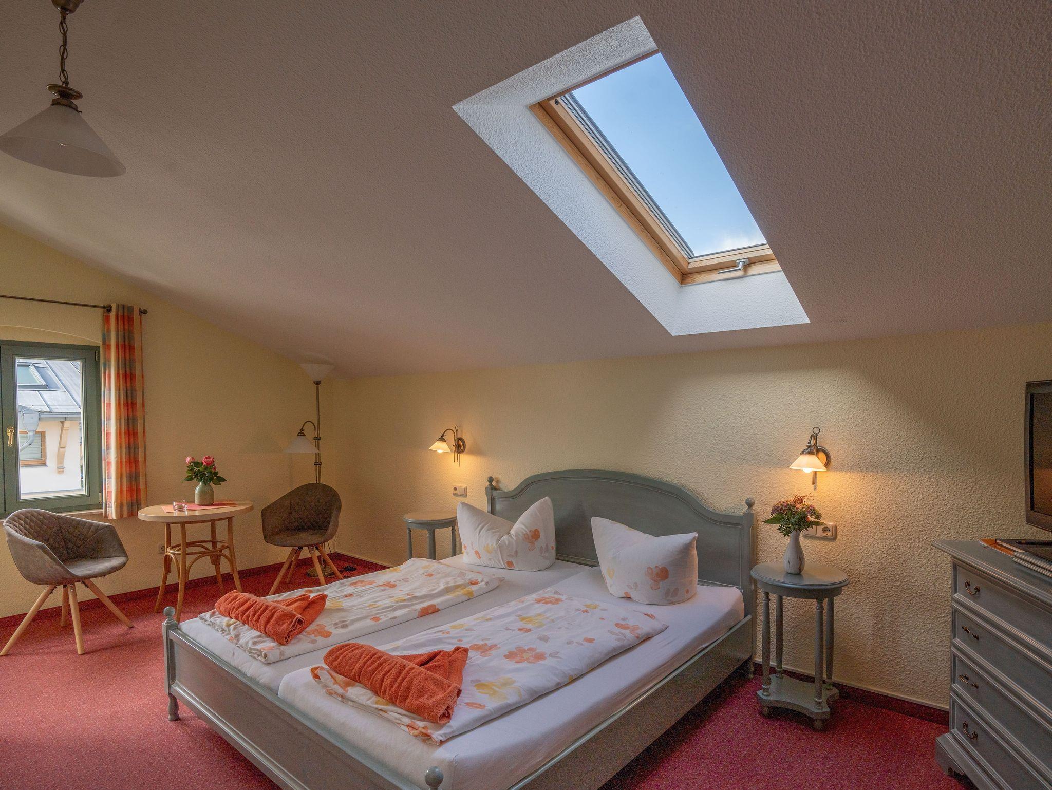 Das 28 qm große Einraumappartement im Dachgeschoss verfügt über ein Doppelbett, Sitzgelegenheit, TV und Radio sowie eine Küchenzeile mit Geschirrspüler,