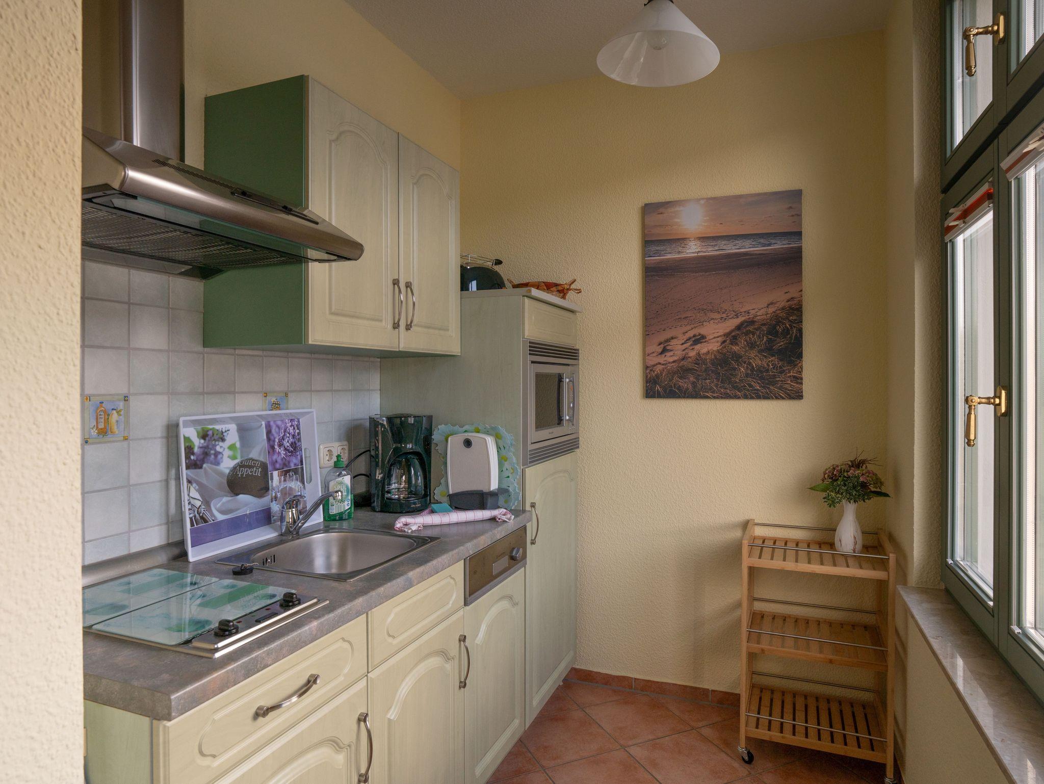 Ceranfeld und Mikrowelle. Bad mit Dusche und WC.