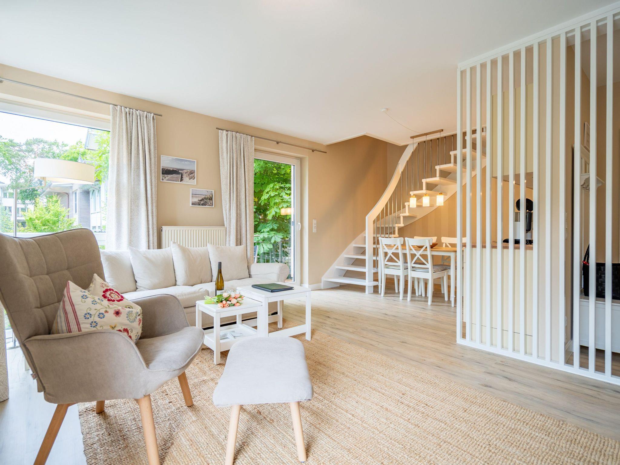 Die helle und freundlich eingerichtete 3-Raum-Ferienwohnung erstreckt sich über 2 Etagen und bietet Ihnen Platz zum Wohlfühlen und Entspannen. In der unteren Etage lässt der lichtdurchflutete Wohnbereich mit offener, komplett ausgestatteter Küchenzeile, 2 großen Südbalkonen und dem Gäste-WC keine Wünsche offen. Eine moderne, hochwertige Ausstattung und liebevolle Details versprechen einen traumhaften Urlaub. Das Schlafzimmer mit Doppelbett, ein Kinderzimmer mit einem ausziehbaren Tages/Doppelbett, sowie das Bad mit Dusche erwarten Sie im Obergeschoss. Auf Wunsch stellen wir für unsere kleinen Gäste ein Kinderreisebett (ohne zusätzliche Matratze [&] Bettzeug) und einen Kinderhochstuhl ( gegen einen Aufpreis) zur Verfügung. Für Ihren Komfort sind die Betten bei der Anreise bezogen und Handtücher liegen bereit.