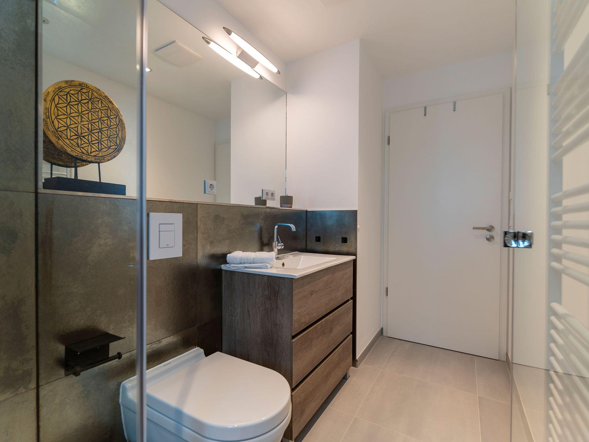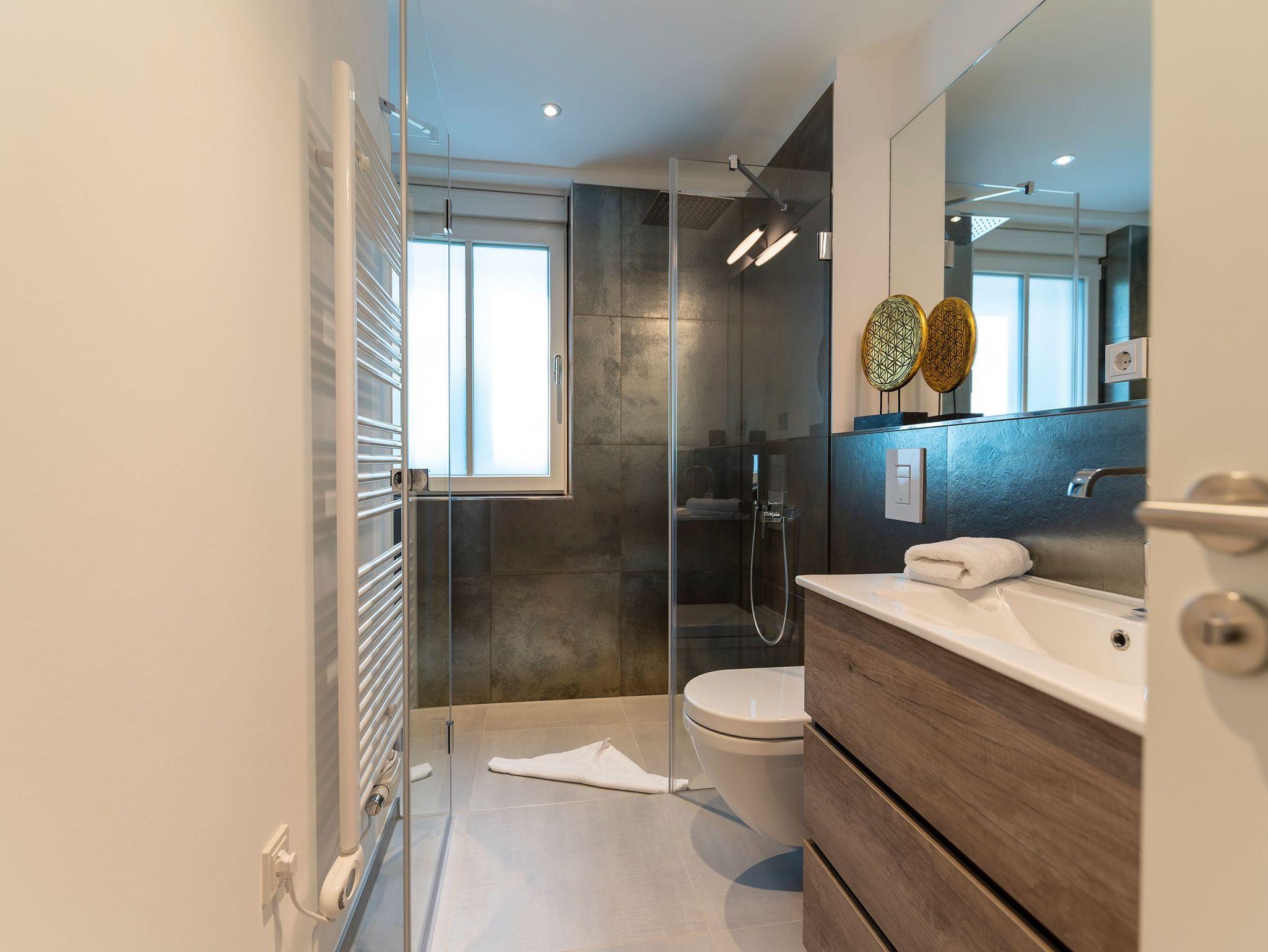 Die Ferienwohnung bietet weiterhin zwei Schlafzimmer, beide eingerichtet mit gemütlichen Boxspringbetten und Flachbildfernsehern. Ein Schlafzimmer verzaubert zusätzlich mit einem begehbaren Kleiderschrank und einem en-suite Badezimmer, das durch seine stilvolle Dusch-Rückwand hervorsticht. Komplettiert wird das Wohnangebot durch ein separates Badezimmer, ausgestattet mit einer großzügigen Dusche und einem weitläufigen Waschtisch.
